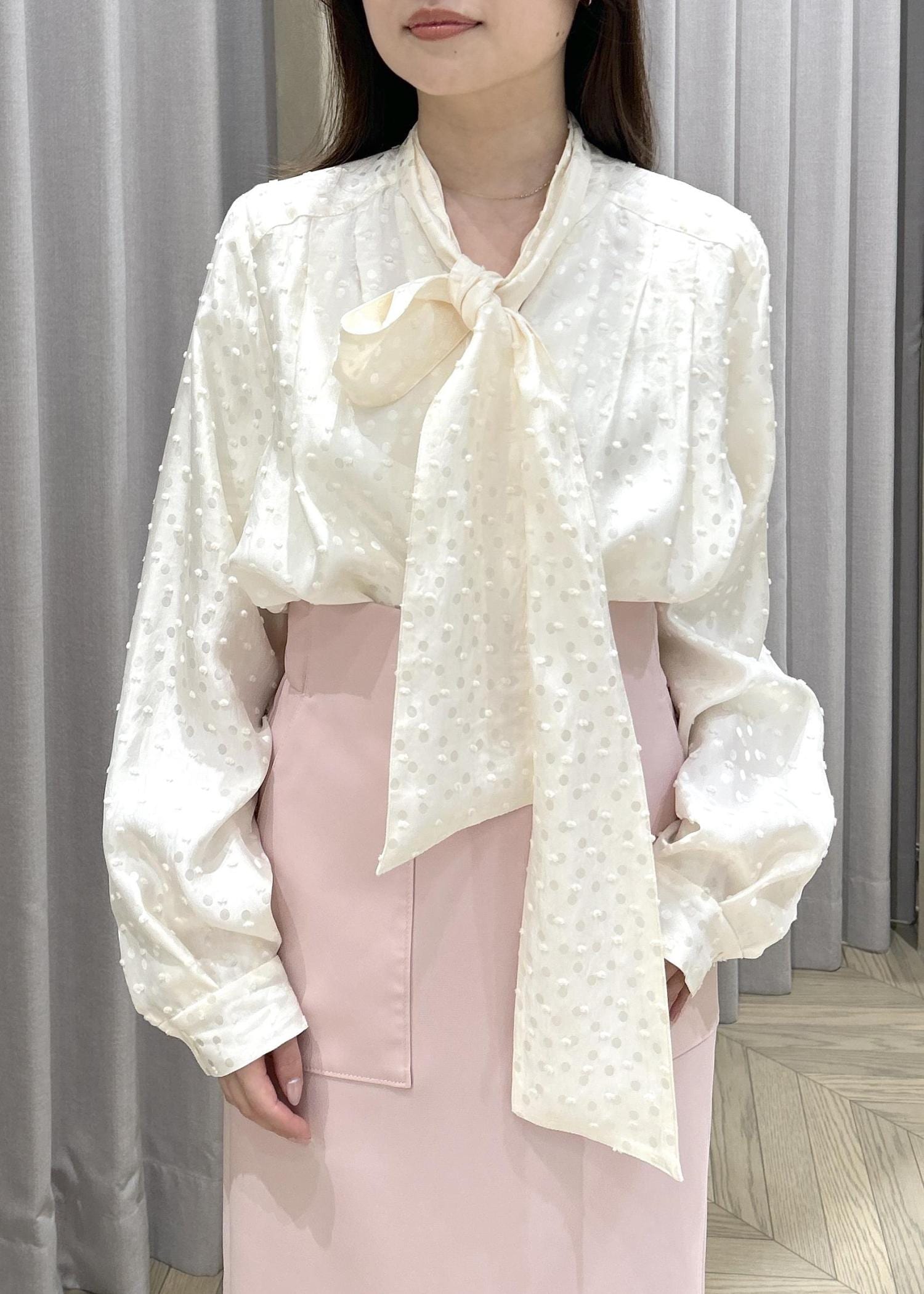 ROPÉ2WAYドットジャガードボウタイブラウス/イージーケアオフホワイト / F¥28,600レビューヒップが隠れるくらいの丈感で袖丈は手が半分隠れるくらいの長さです。