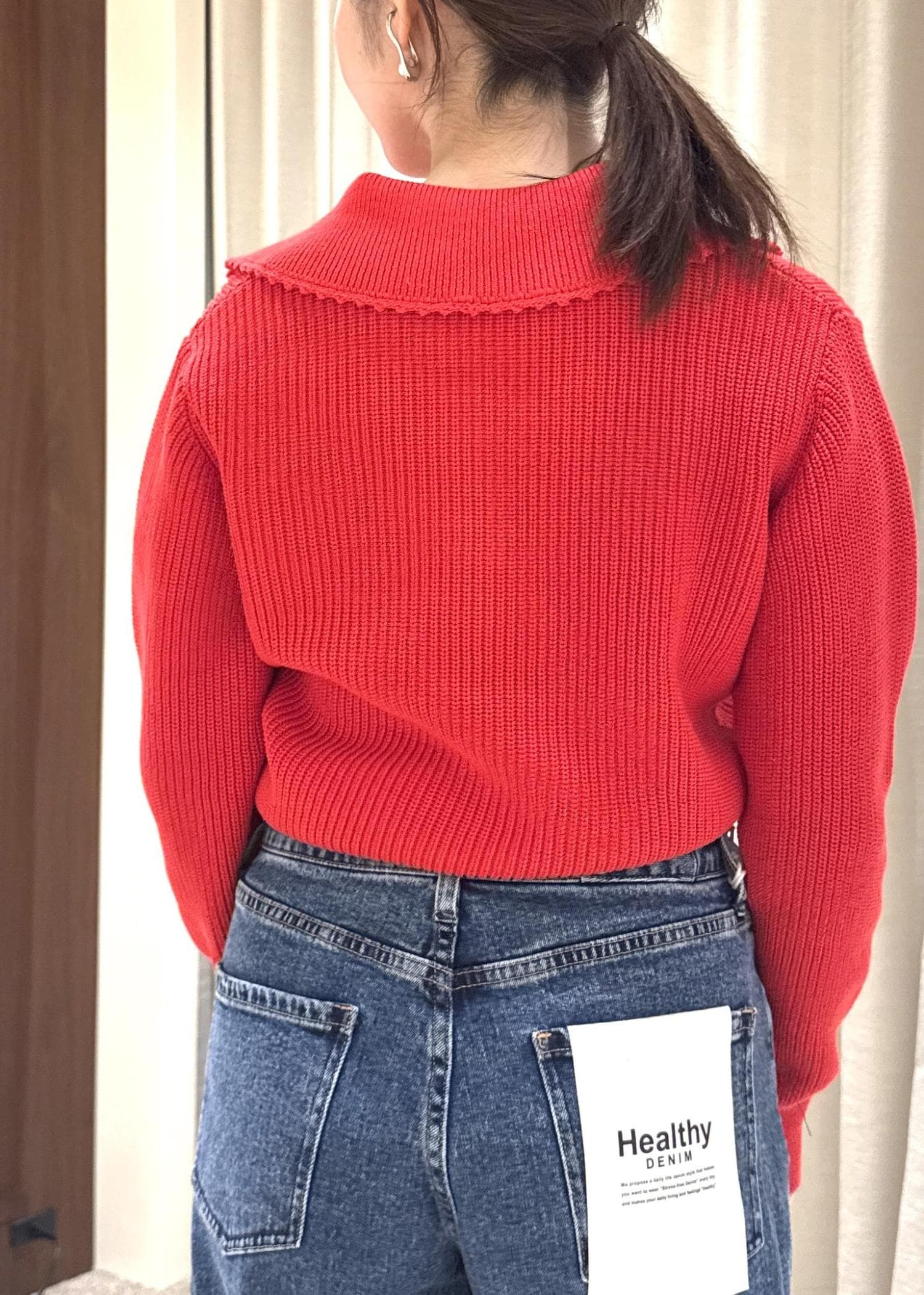 大きめのポロ衿にピコット編みを施した畦編みプルオーバー。