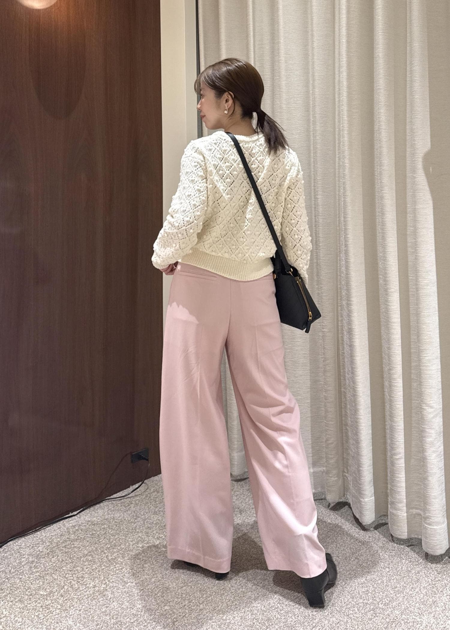 ROPÉノンミュールジングウール ストレートワイドパンツ/セットアップ対応ピンク / 36¥27,500レビュー裏地なしですが、大きめのポケットが付いているので透け感は気になりませんでした。ラインが気になる方はペチコートを合わせるのもおすすめです。