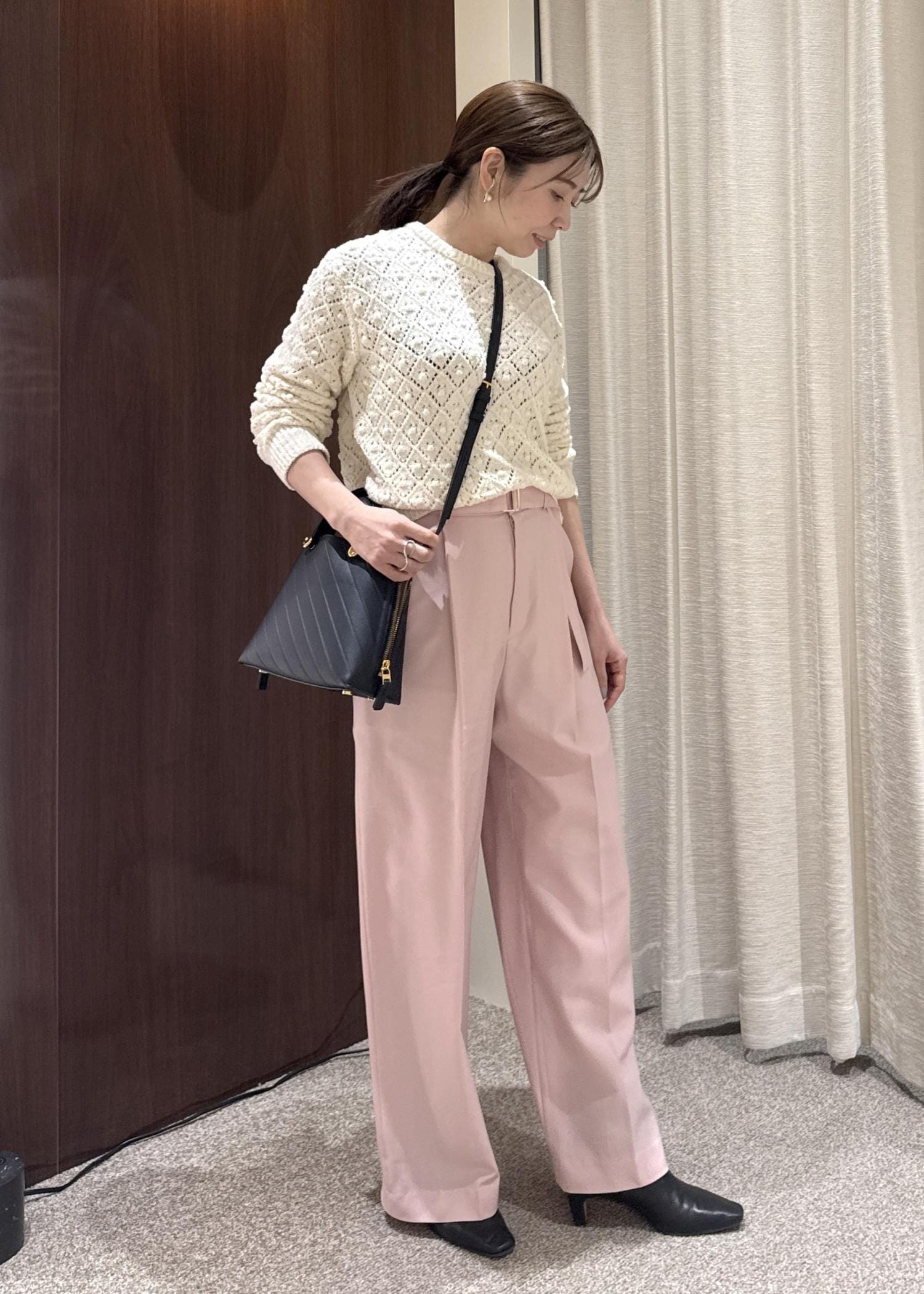 素材感はウール100%でチクチク感はなく、軽くて履きやすいです。ワイド過ぎないデザインが小柄な方でもバランス良く履いていただけます。 -