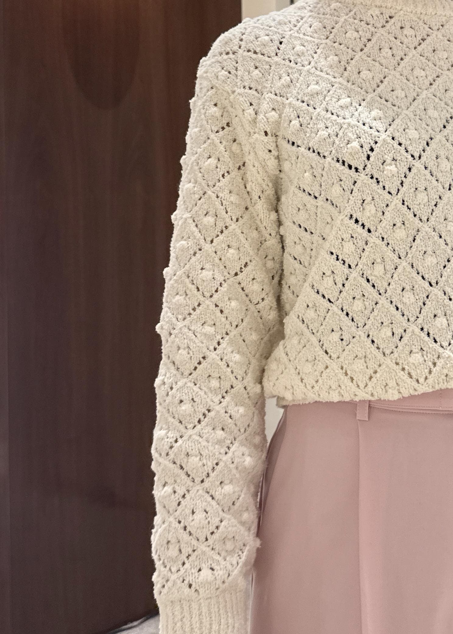 コンパクトな着丈がボトムスを選ばずに合わせやすいです。ダイヤ柄とポップコーン編みの組み合わせが可愛いです! -