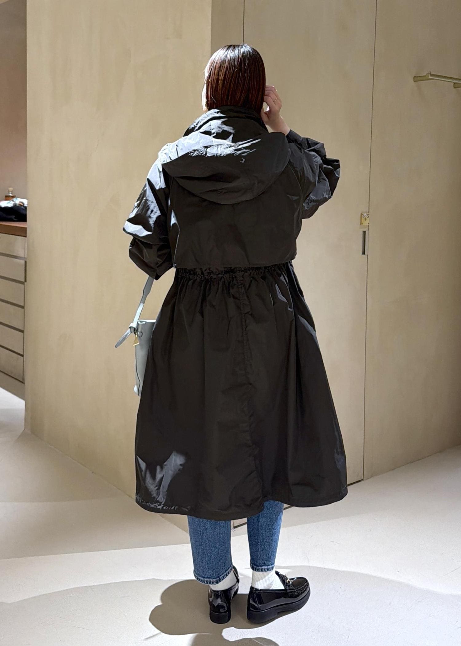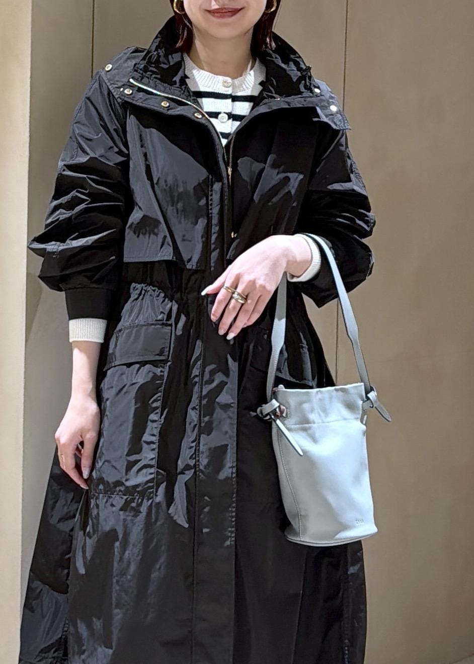 全体的にゆったりとしたサイズ感です。襟元、ウエスト、裾はコードが付いているので絞ることが可能なため絞ってメリハリのある着こなしも可能。