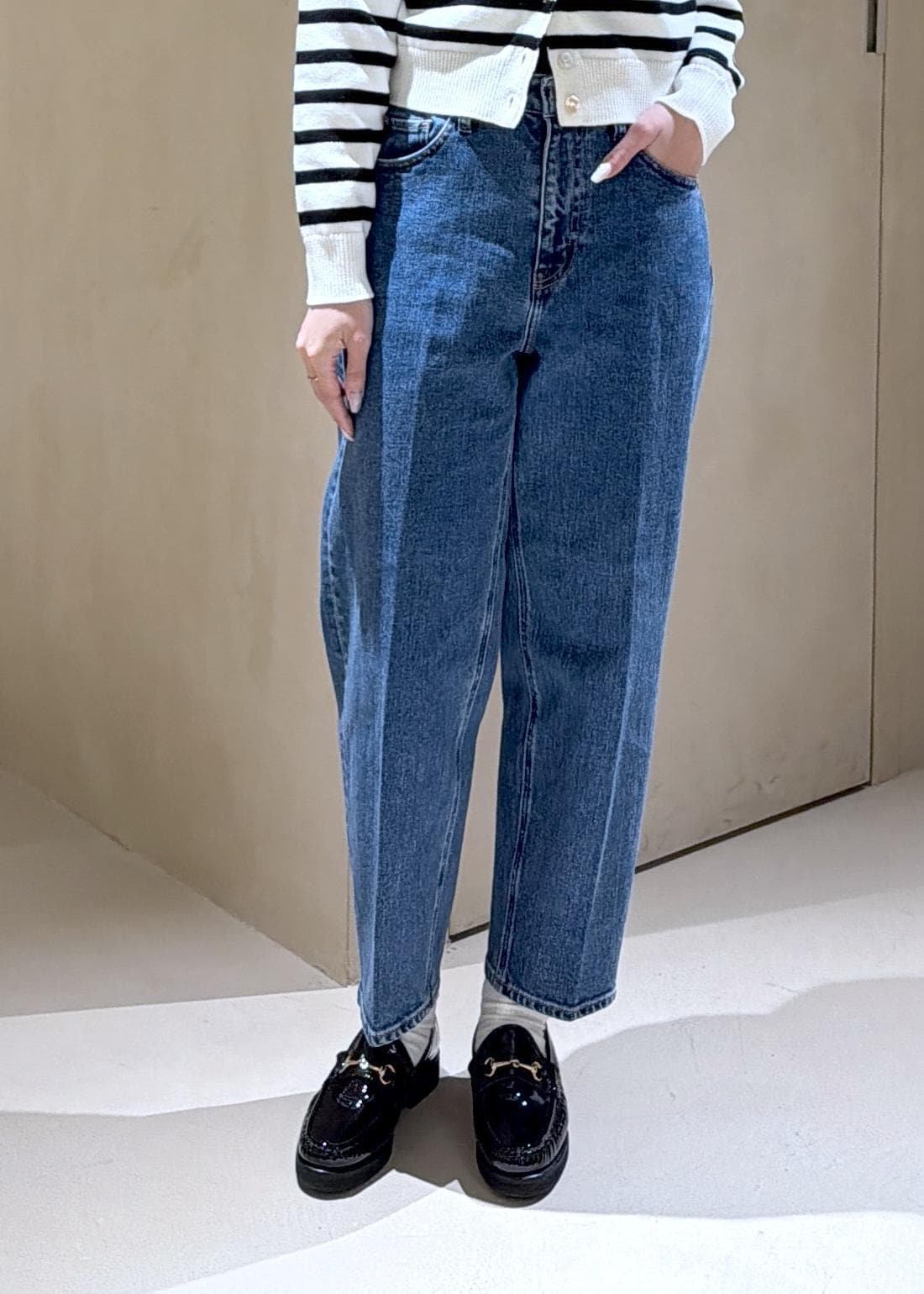 着丈は短めで足首が見えるほどなのでソックス合わせなども楽しめるデニム。