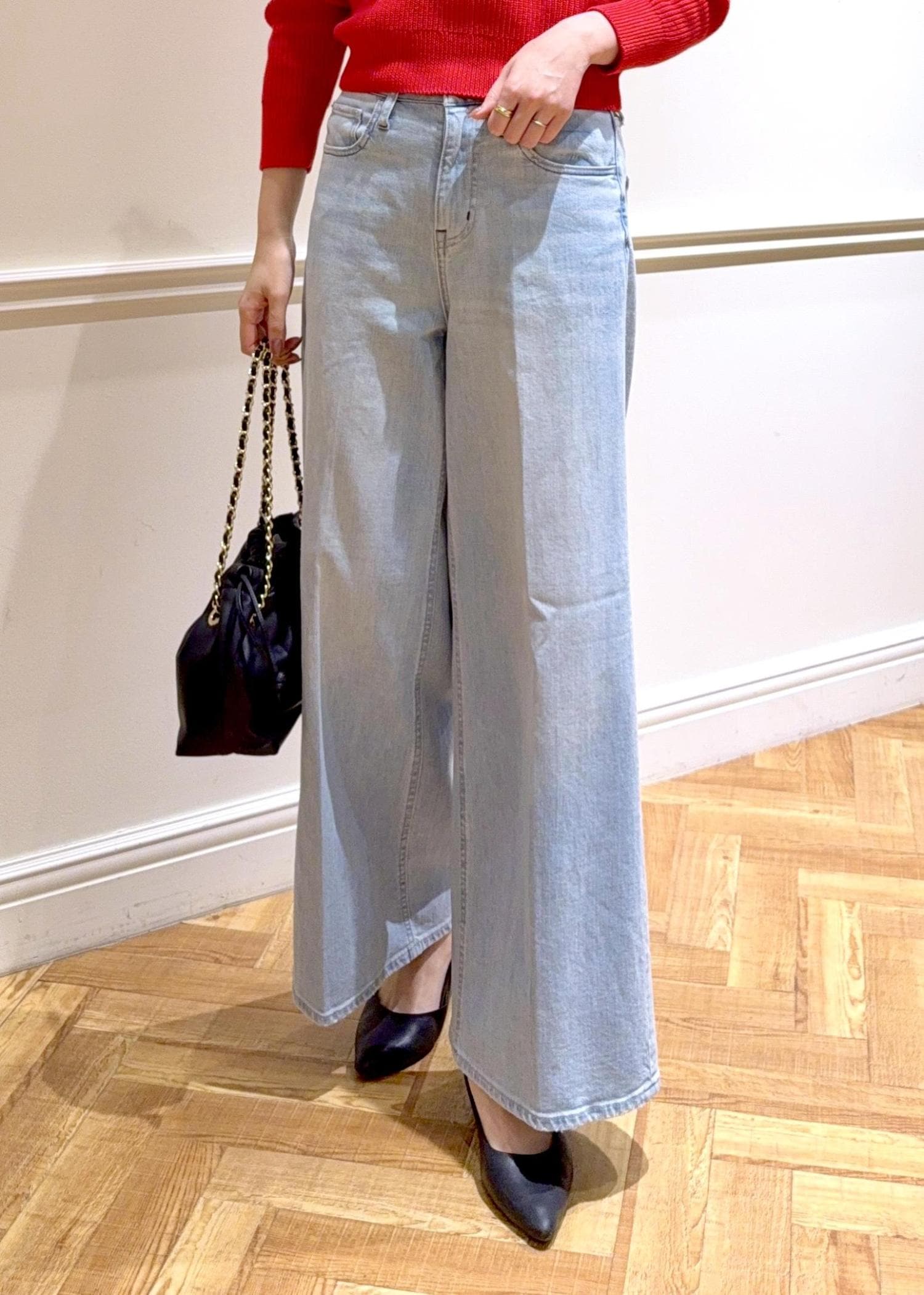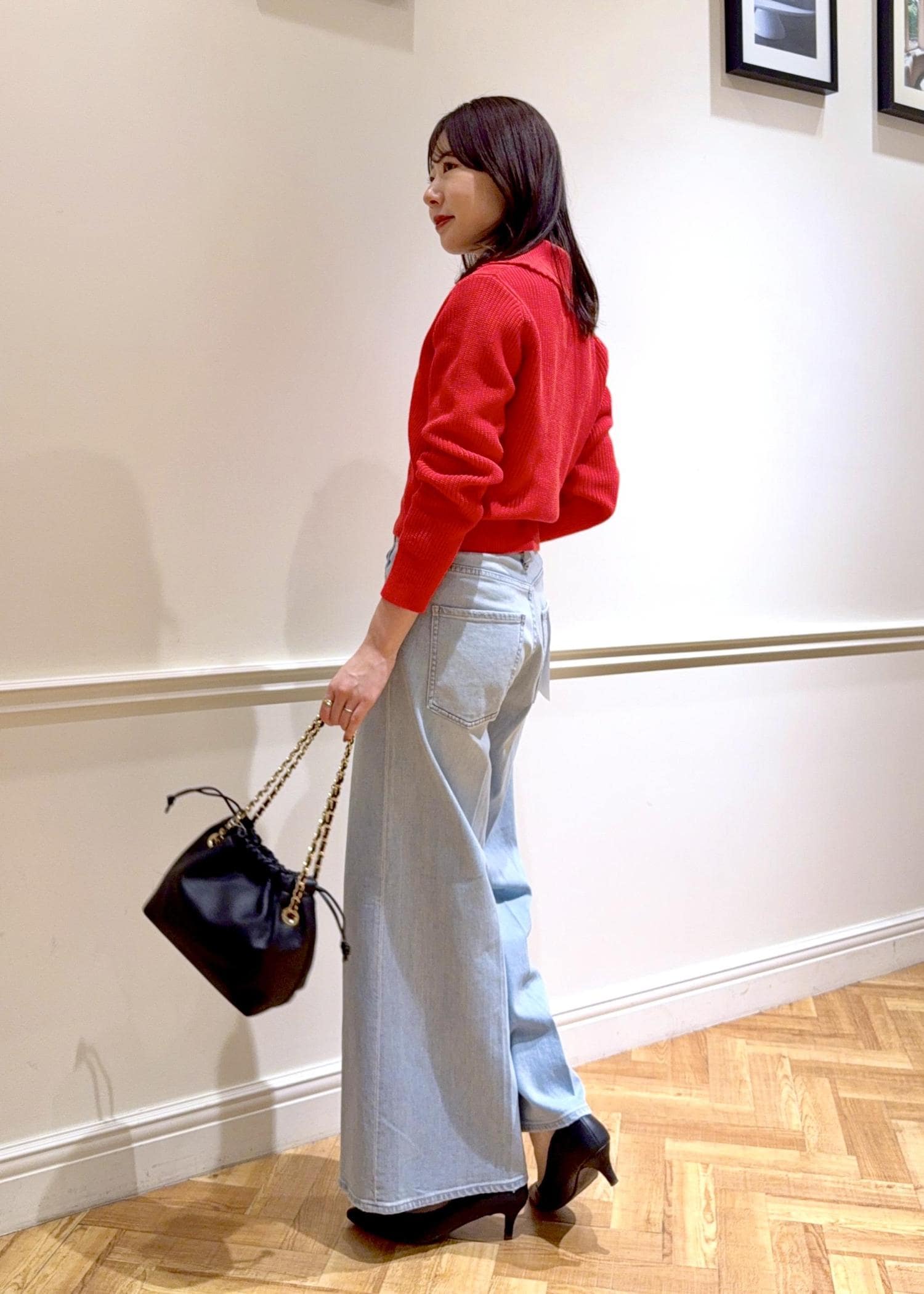 短丈でスッキリとしたトップスにワイドシルエットのデニムを合わせてスタイルアップ効果も抜群です。