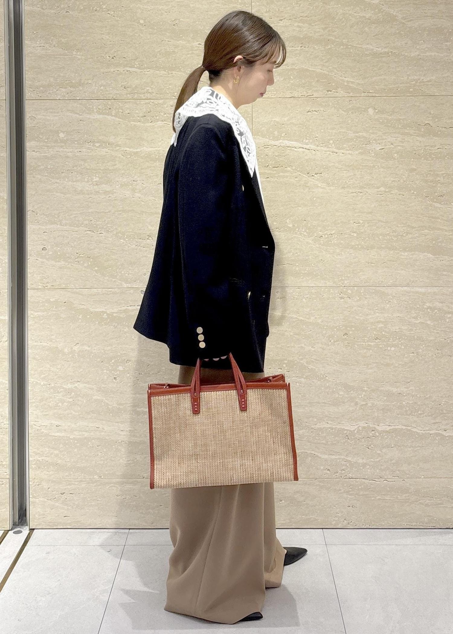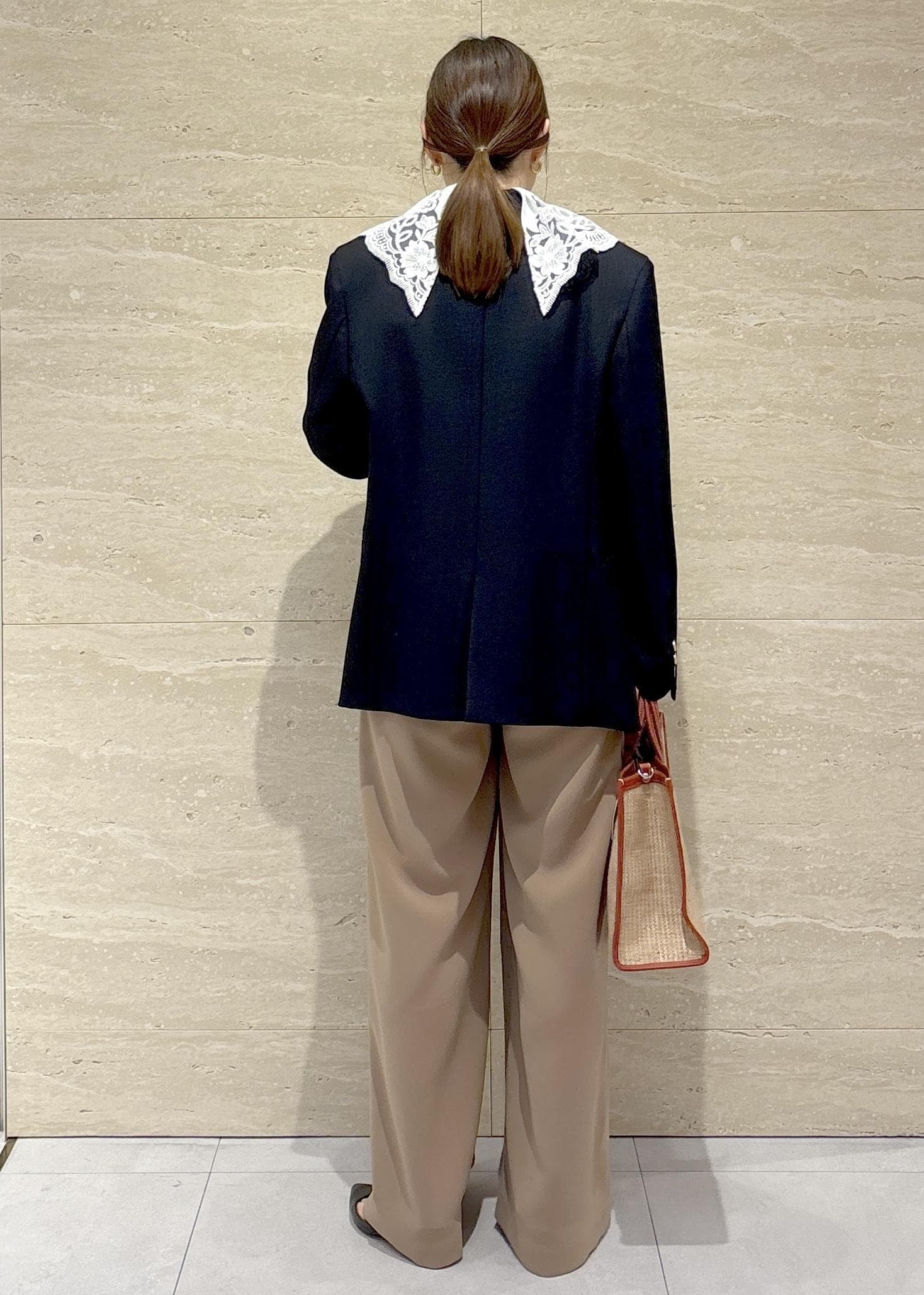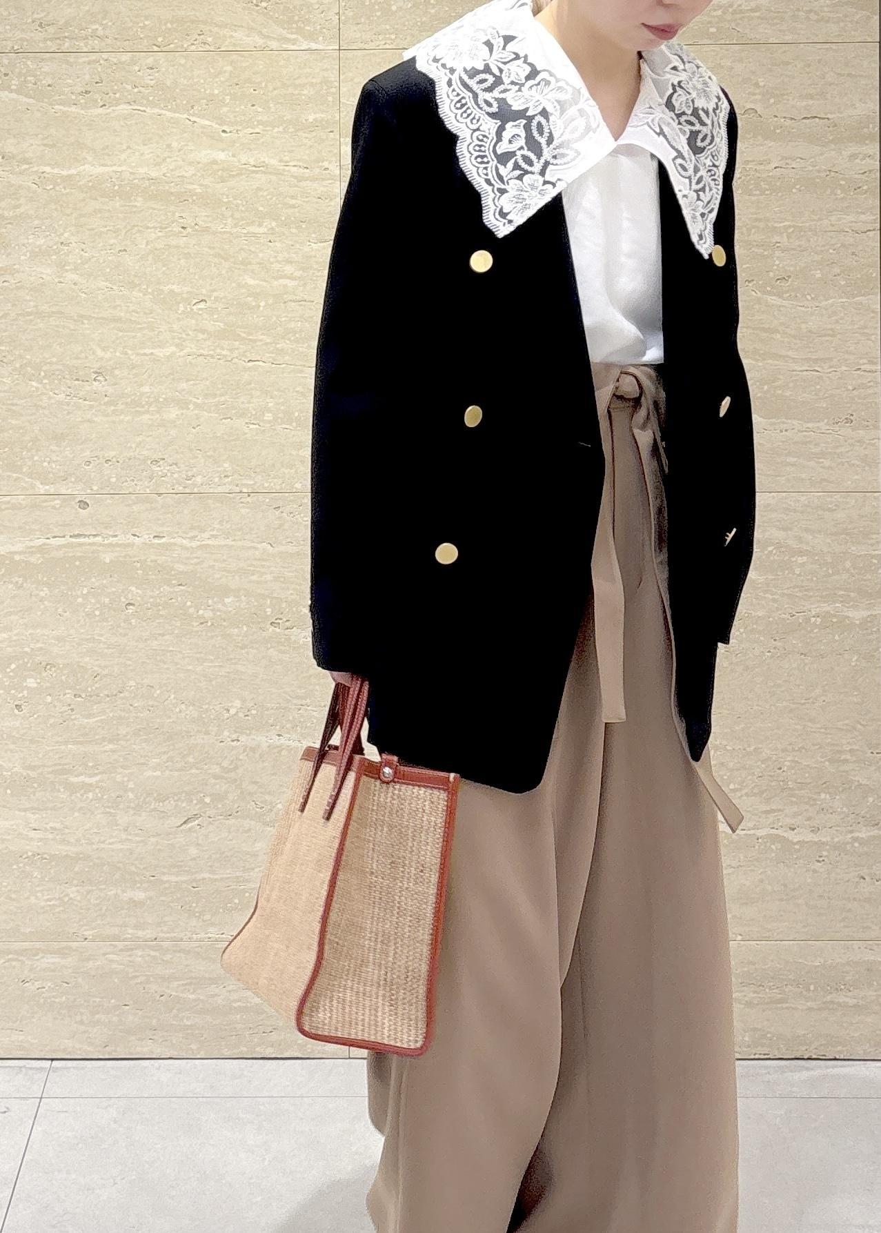 紺ブレの金ボタンがきちんと感をプラスしつつ、ベージュのワイドパンツで柔らかさを意識しました
