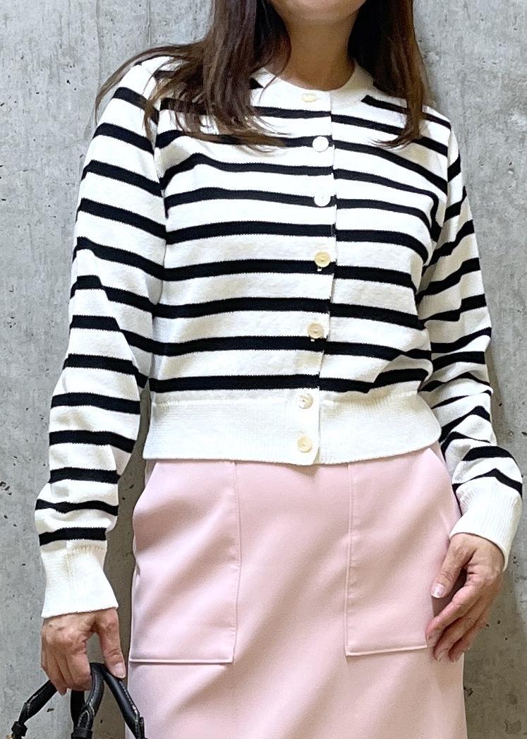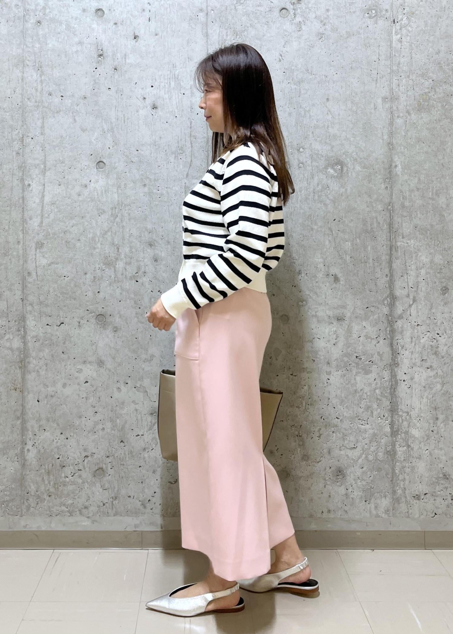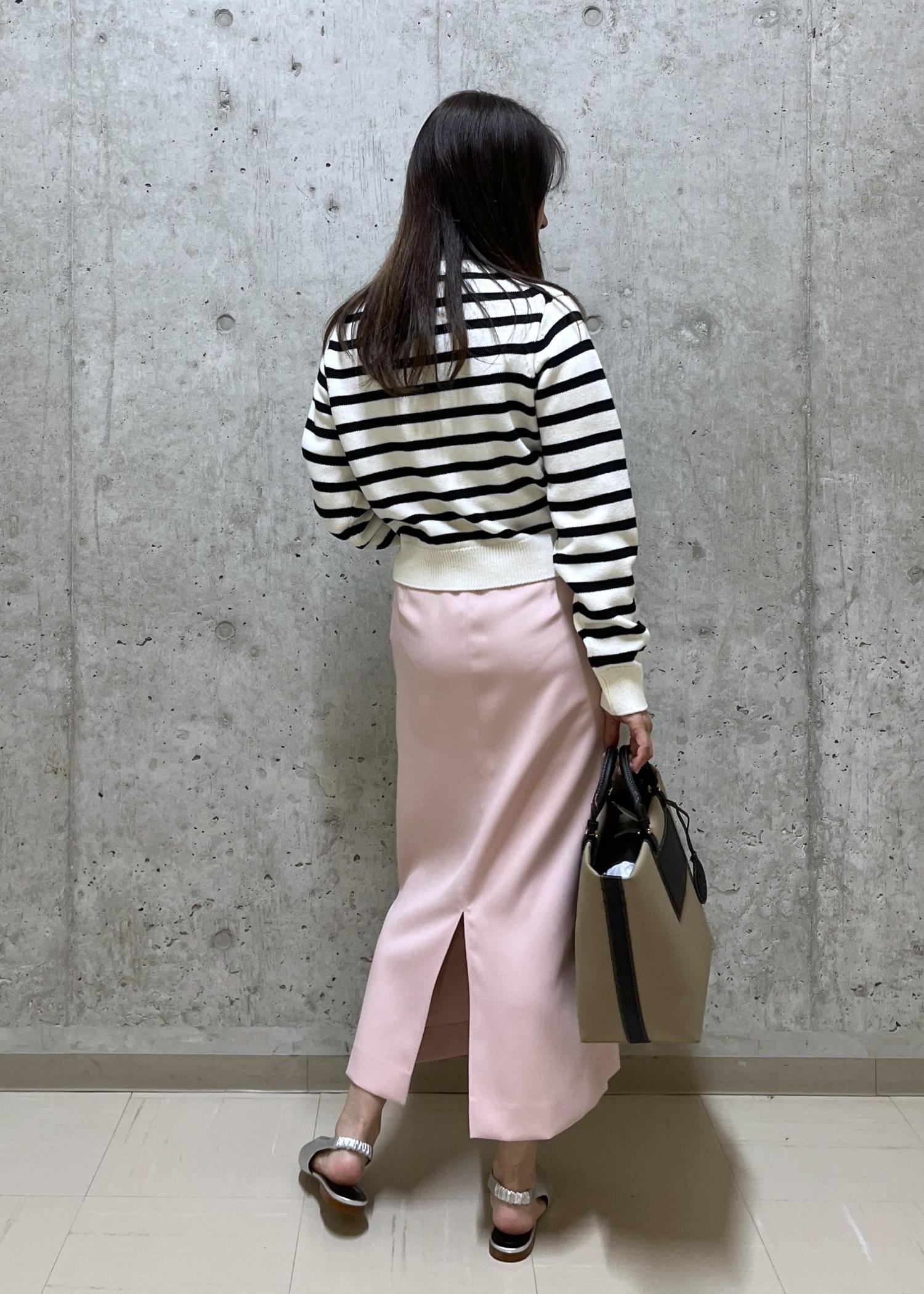 春らしいピンクのスカートは可愛くなりすぎないように、トップスはボーダーで少しカジュアル感を出しました。
