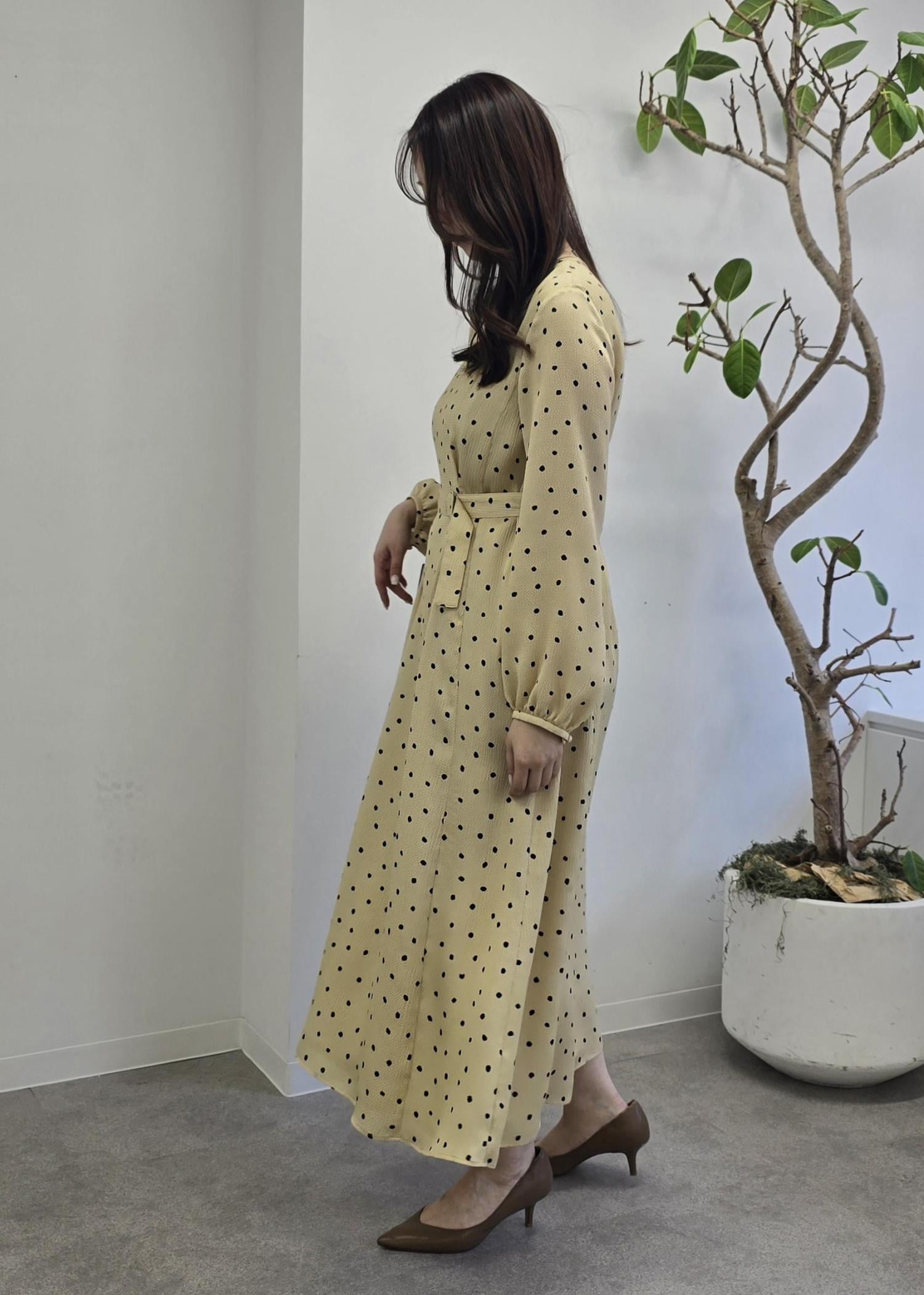 ドット柄が引き立つツヤのある質感なワンピースです。