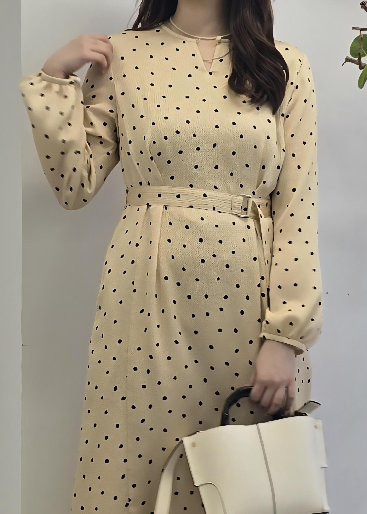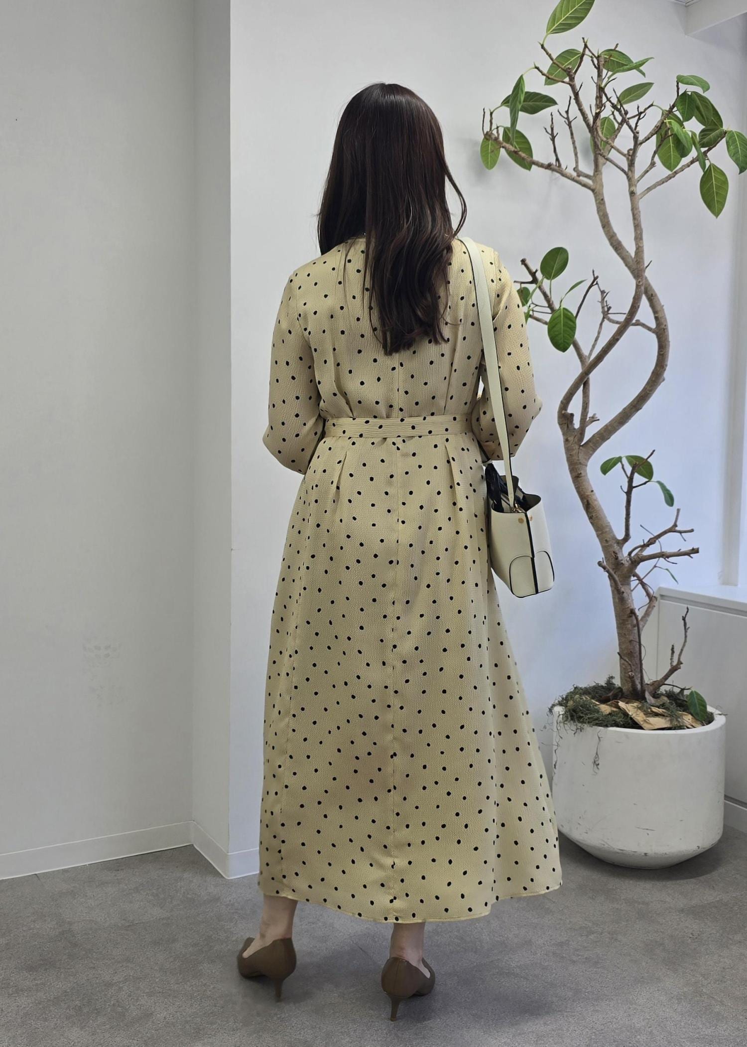 ROPÉドットプリントウエストベルトワンピースベージュ / 38¥41,800レビュー身長163cmで着丈がふくらはぎ真ん中あたりでした。