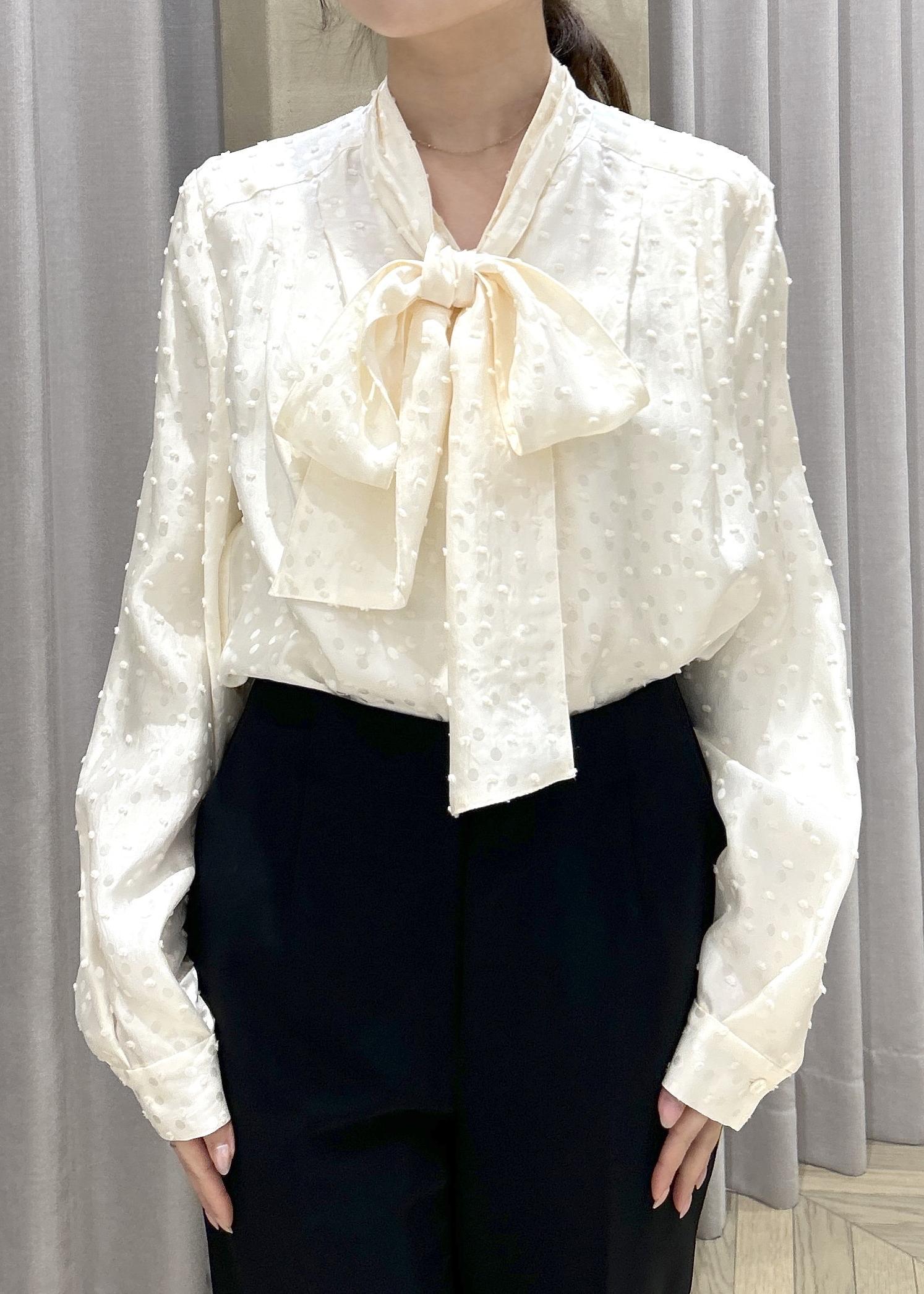 ROPÉ2WAYドットジャガードボウタイブラウス/イージーケアオフホワイト / F¥28,600レビューヒップが隠れるくらいの丈感で袖丈は手が半分隠れるくらいの長さです。