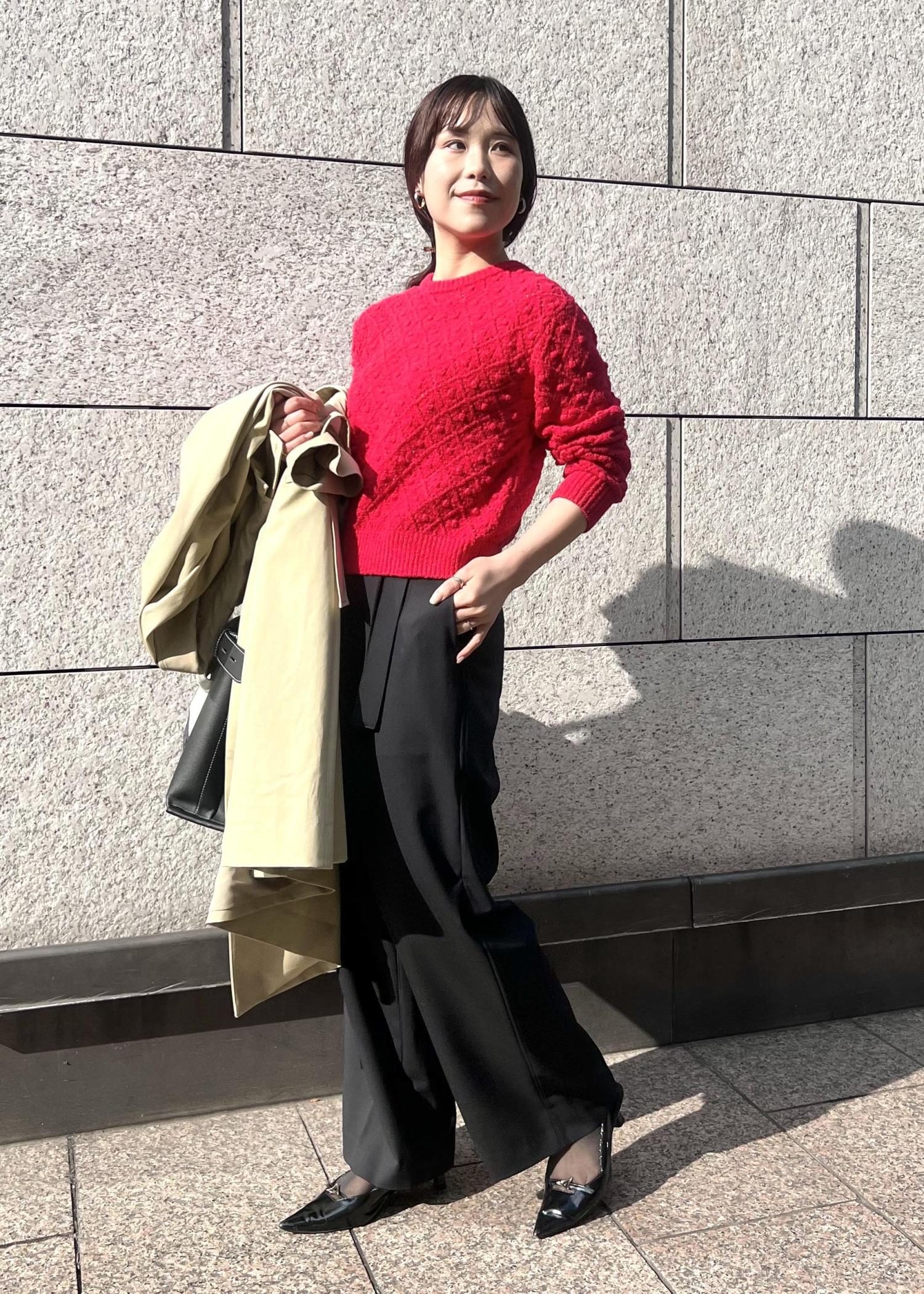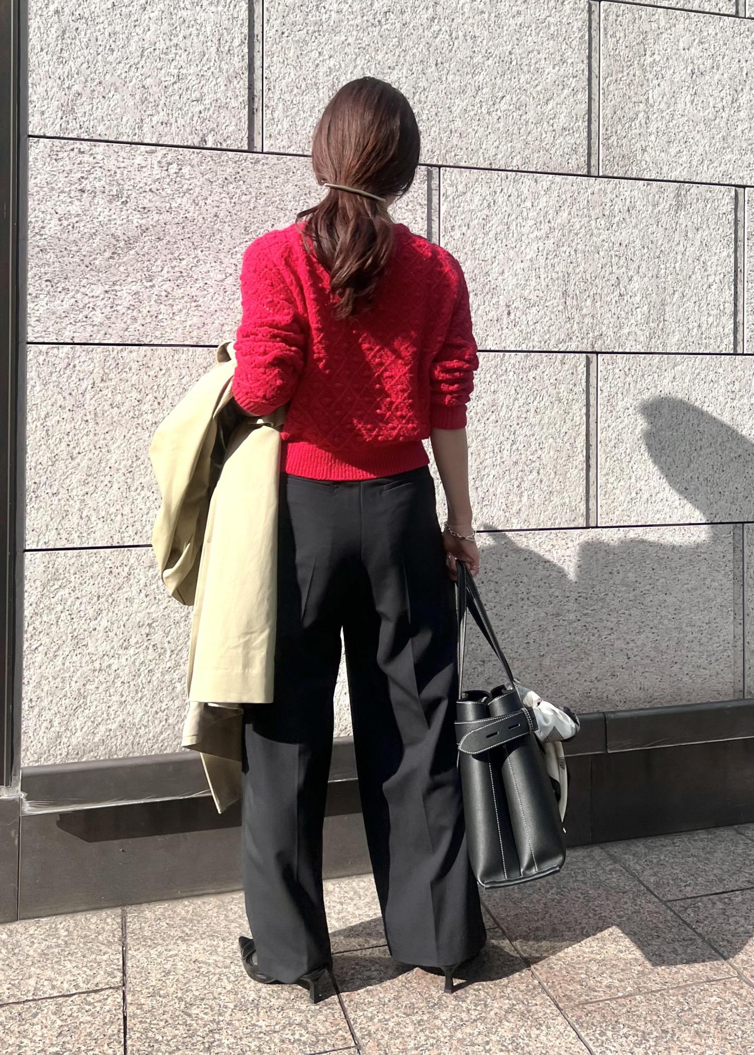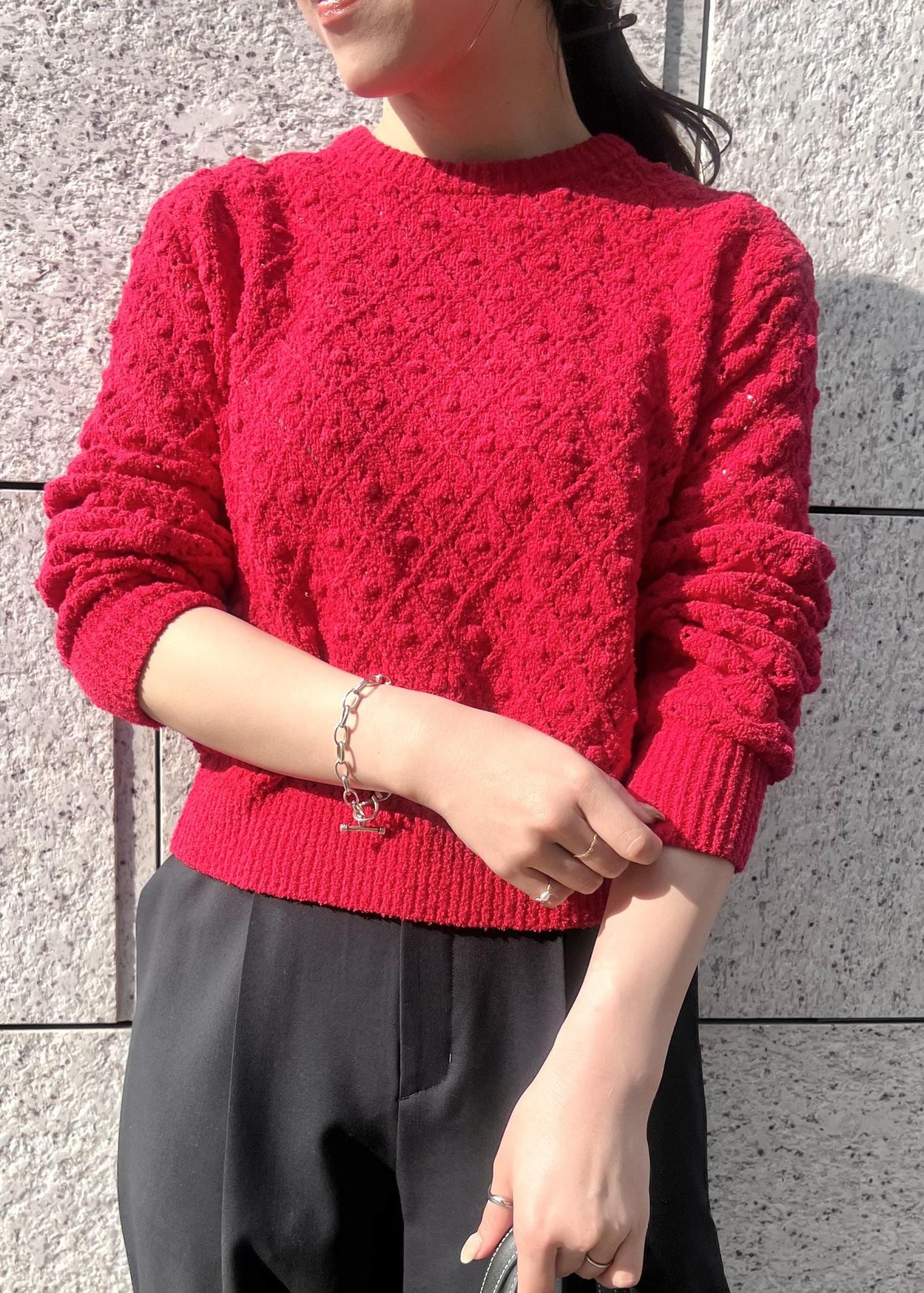 ROPÉダイヤ柄ポップコーン編みニット/イージーケアレッド / F¥16,500レビュー着丈は腰回りがやや隠れるくらいのジャスト丈。