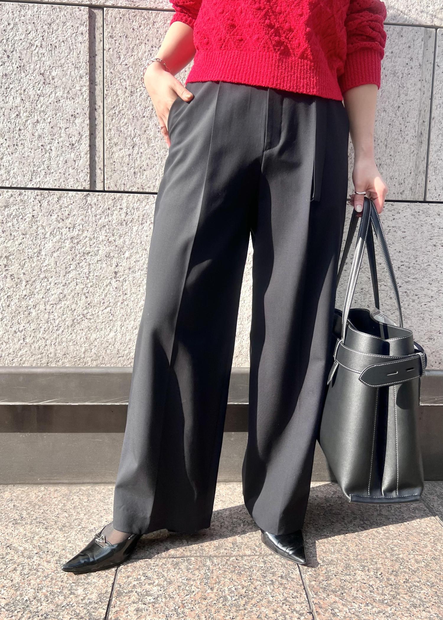 ROPÉノンミュールジングウール ストレートワイドパンツ/セットアップ対応ネイビー / 36¥27,500レビュー着丈はギリギリ地面に付かないくらい。ヒールを履いてもたつかないちょうどいい丈感。