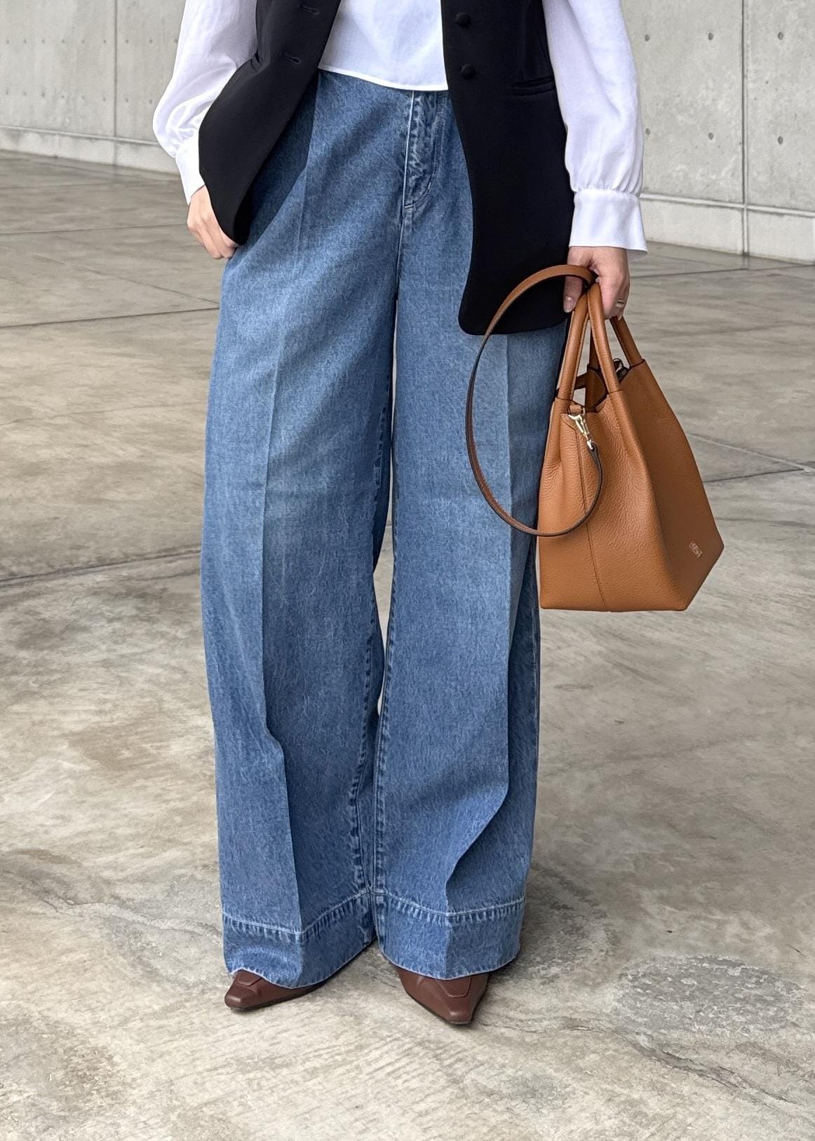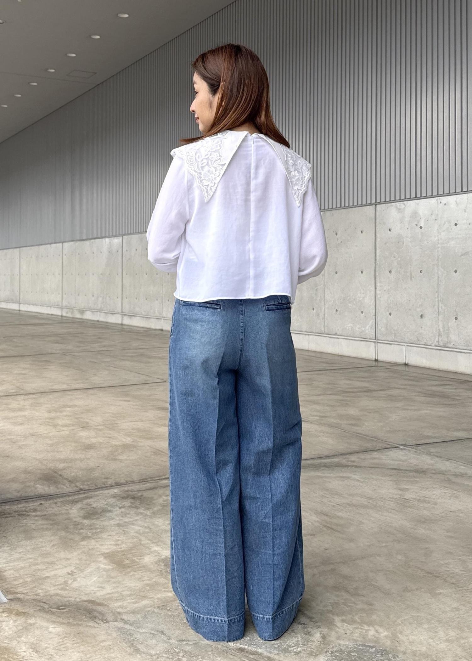 筒はワイドラインですが、ウエストはジャスト~少しきつく感じたので、いつもよりワンサイズ大きくゆったりと履いていただくのもデニムパンツはおすすめです。