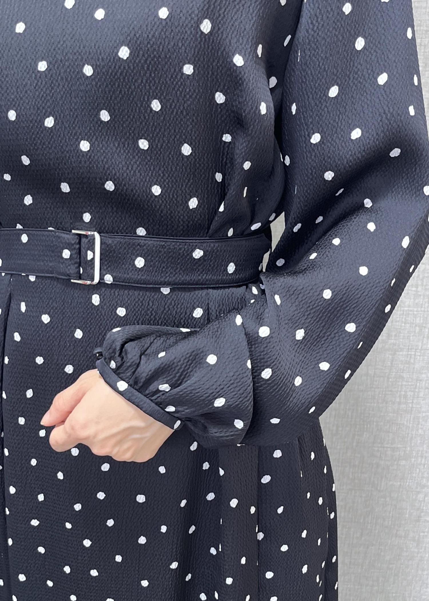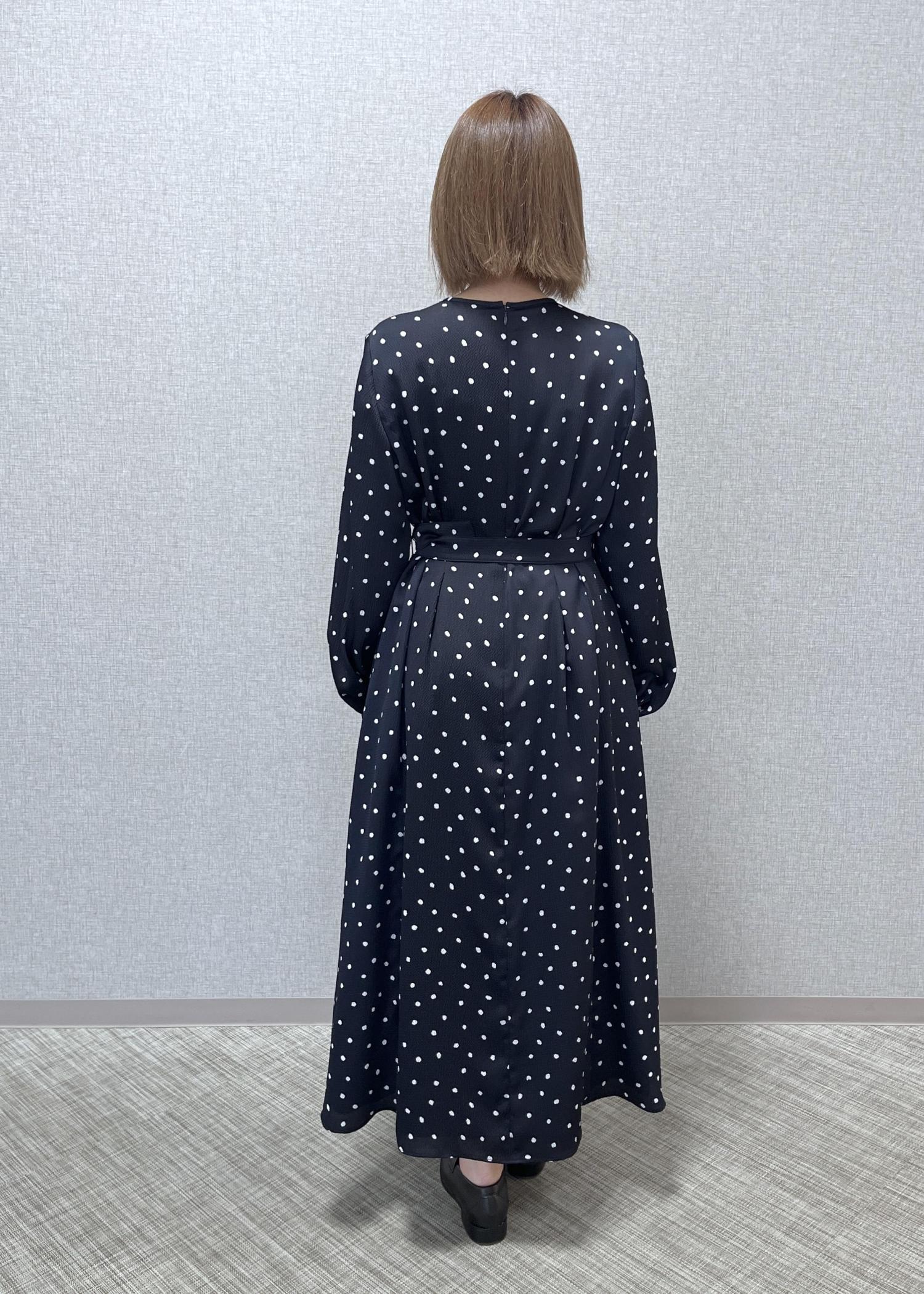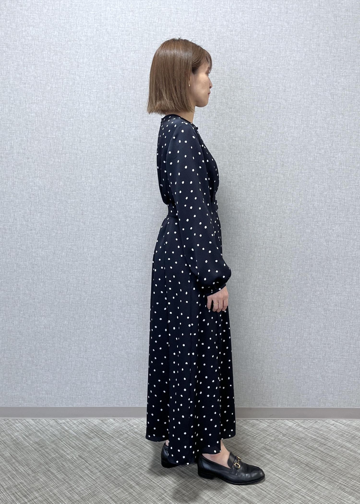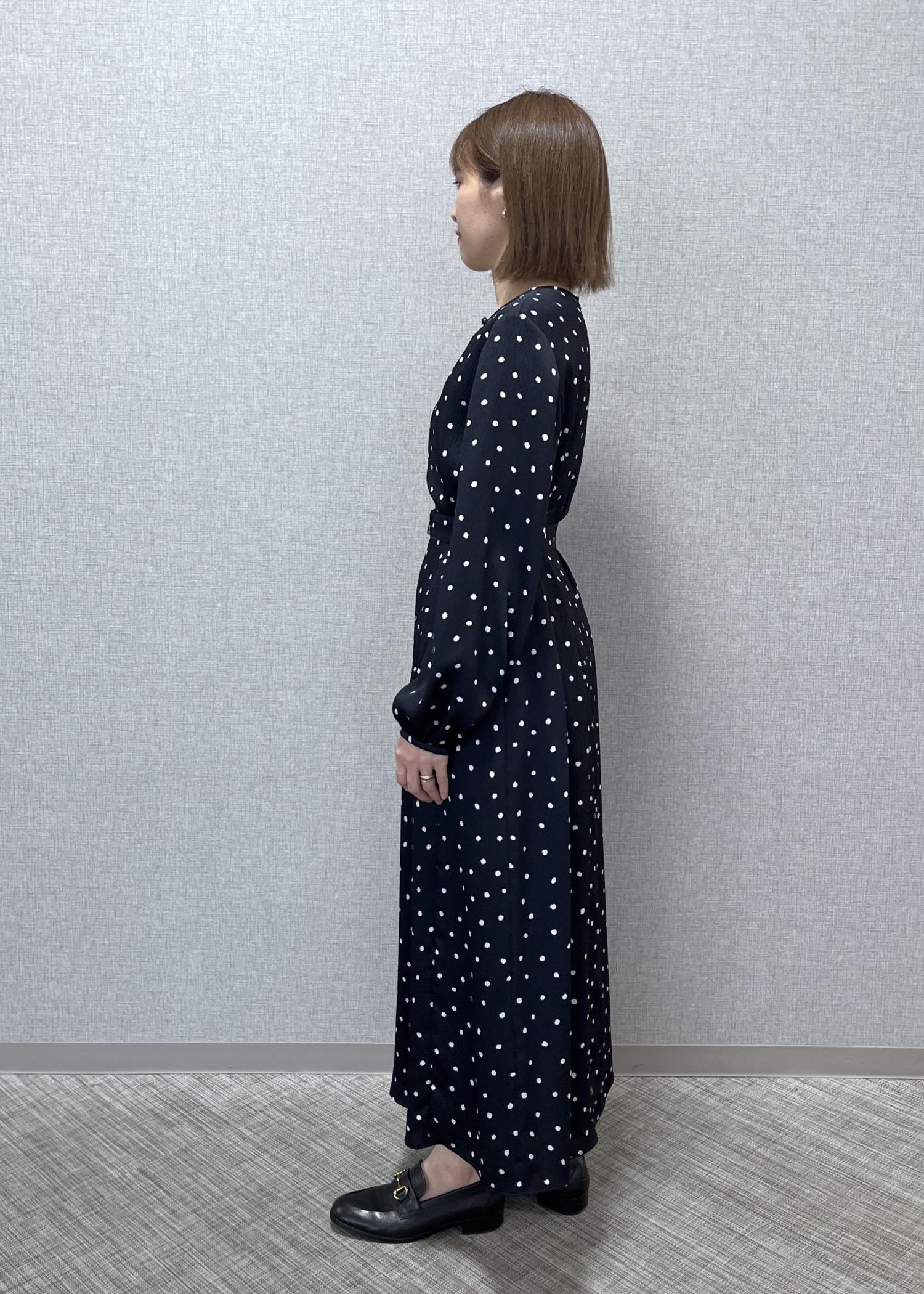 ROPÉドットプリントウエストベルトワンピースネイビー / 38¥41,800レビュー38サイズ着用でロング丈、肩幅、身幅は少し大きめに感じました。