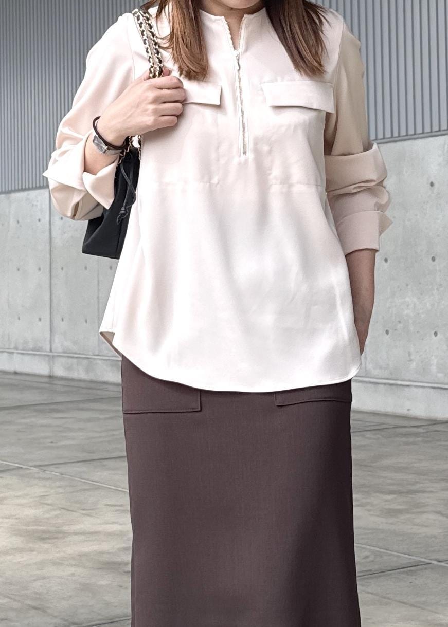 ROPÉフロントジップブラウス/イージーケア・セットアップ対応ピンク / 38¥24,200レビュー落ち感のある綺麗な素材感で、肌離れが良く着痩せして見せてくれました〇