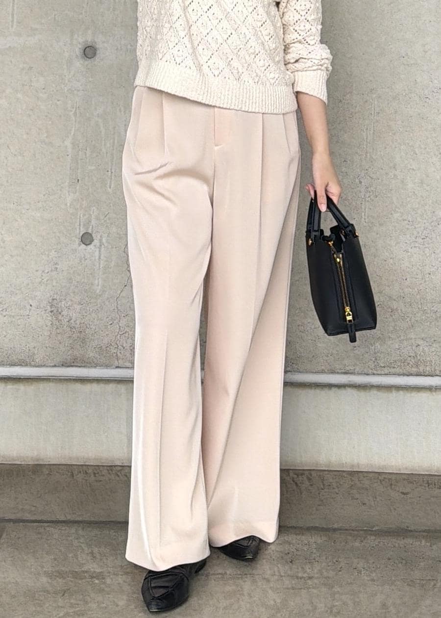 ウエストがゴム仕様になっていてノンストレスながら程よいツヤ感が上品に見せてくれるワイドタックパンツです。ウエストゴムながら、ゆったりし過ぎずヒップや太ももまわりが程よいゆとりでスッキリ見せてくれます。丈感はヒール無しだと、少し裾直しした方が履きやすいです。 -