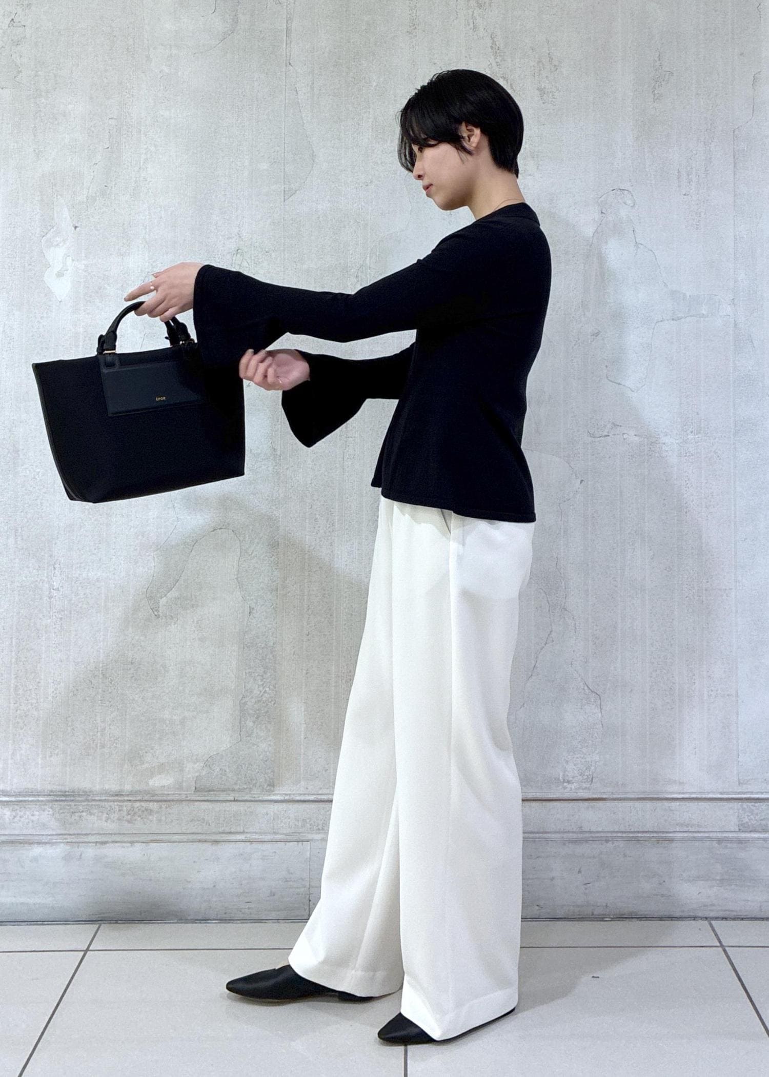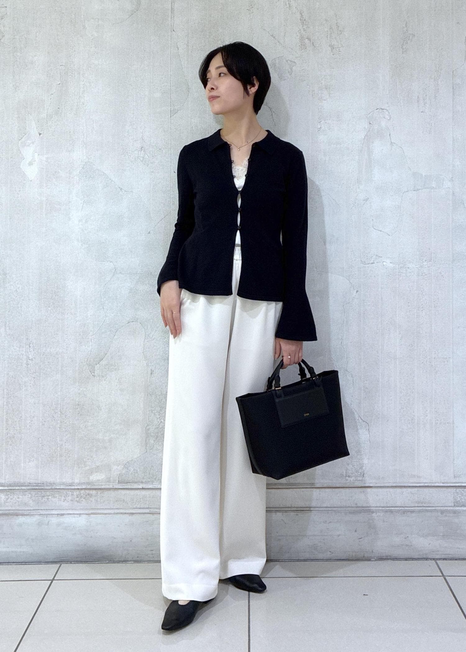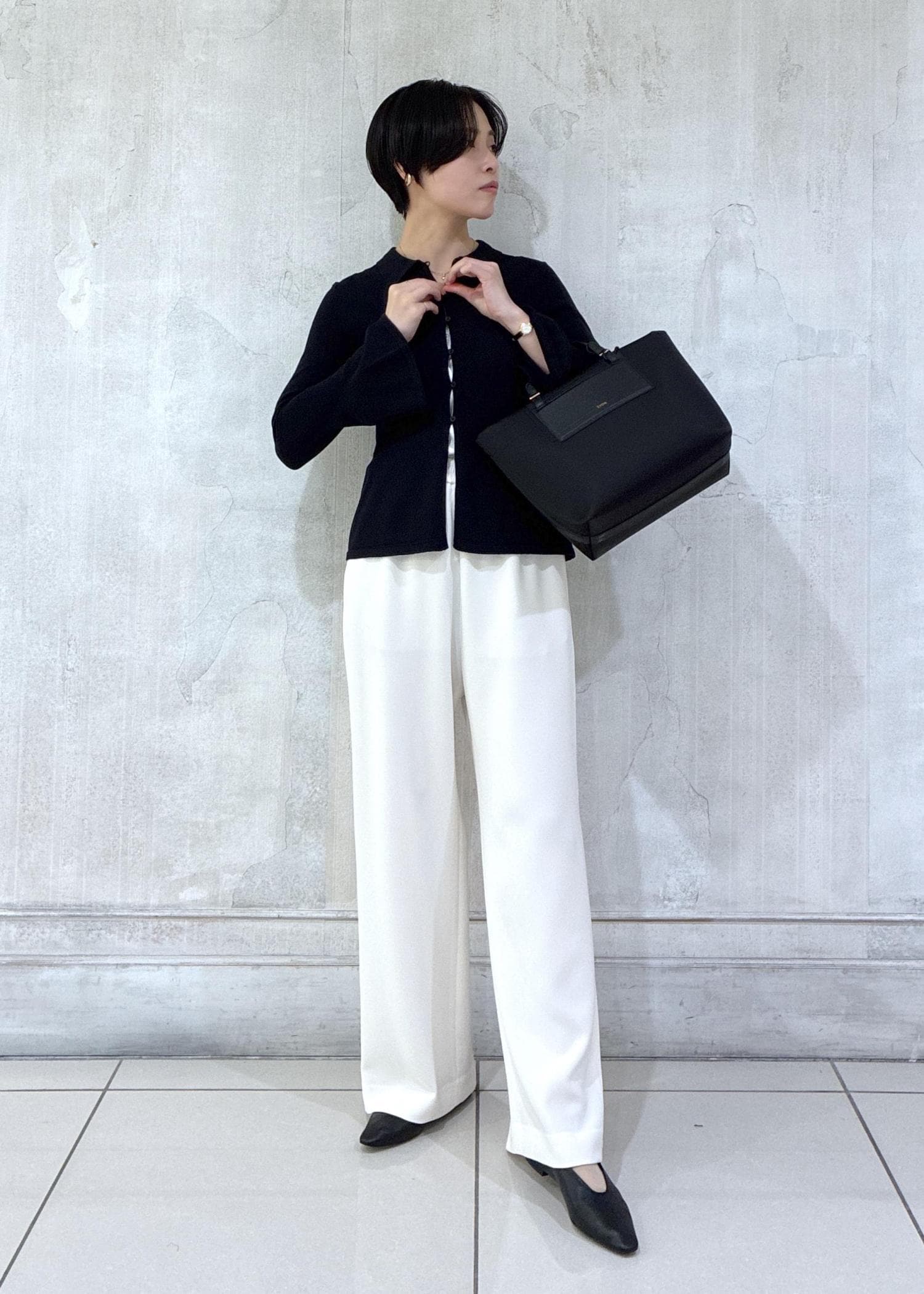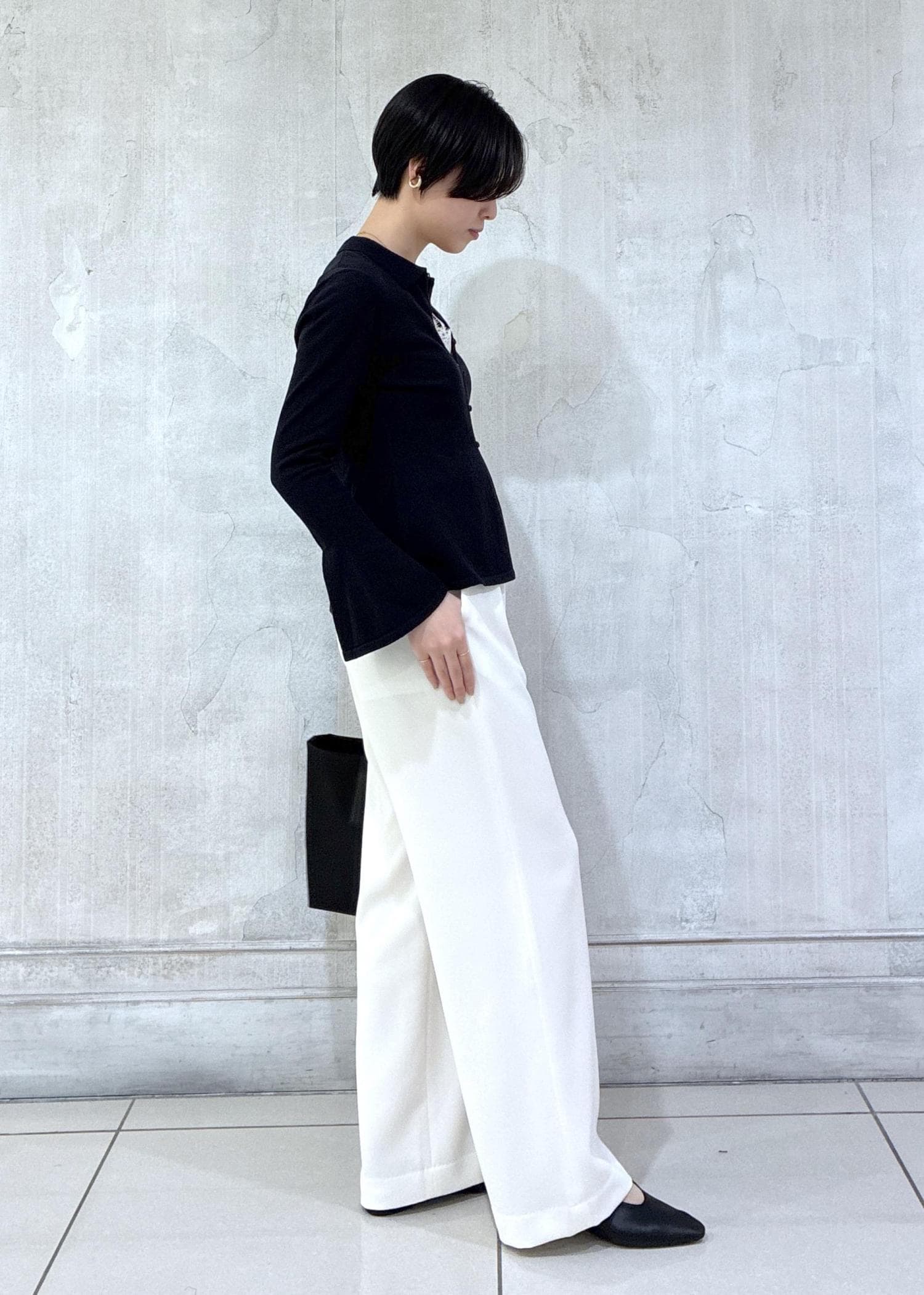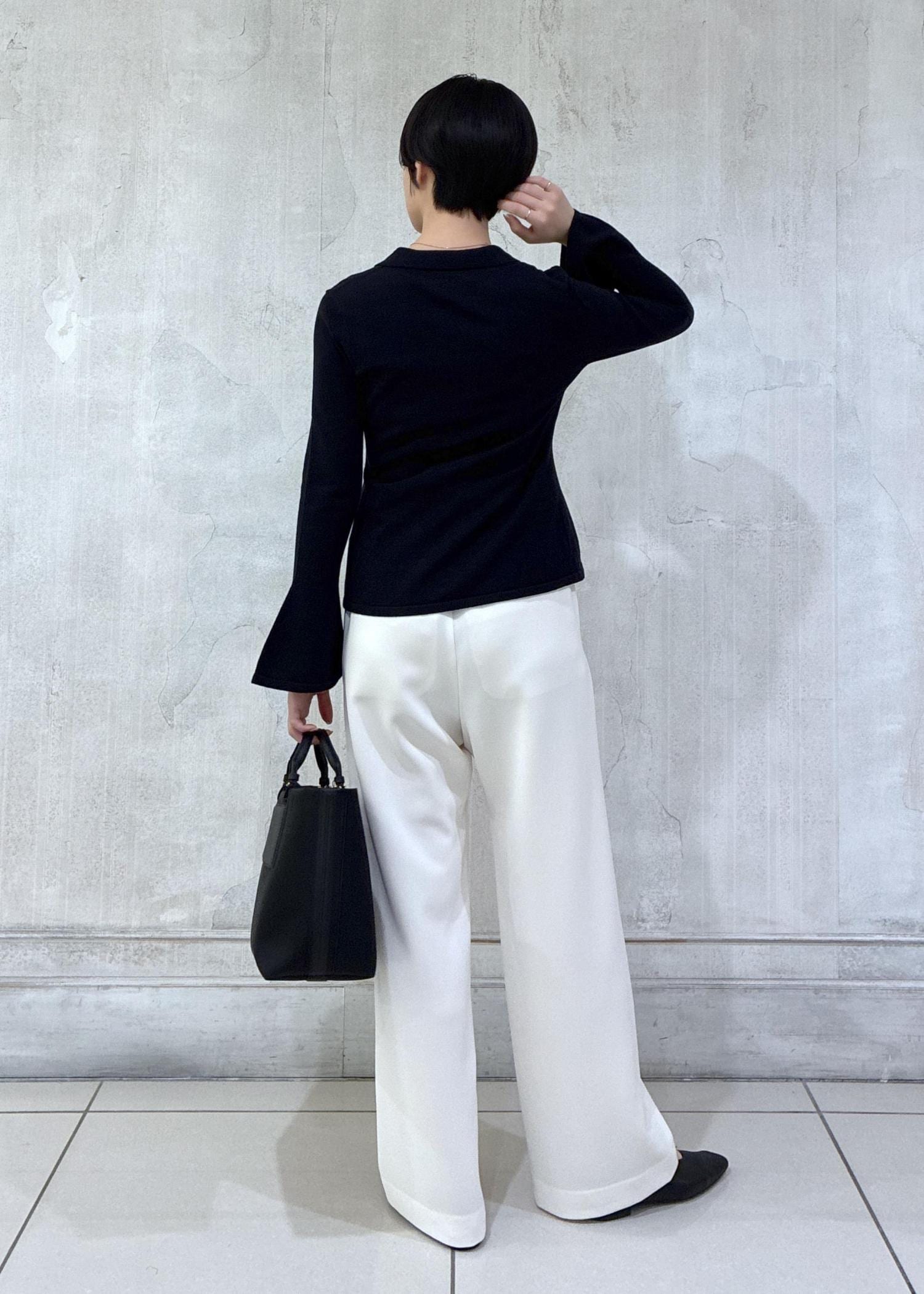 お仕事シーンもイメージして、アクティブなとろみワイドパンツと合わせてモノトーンでまとめてみました!