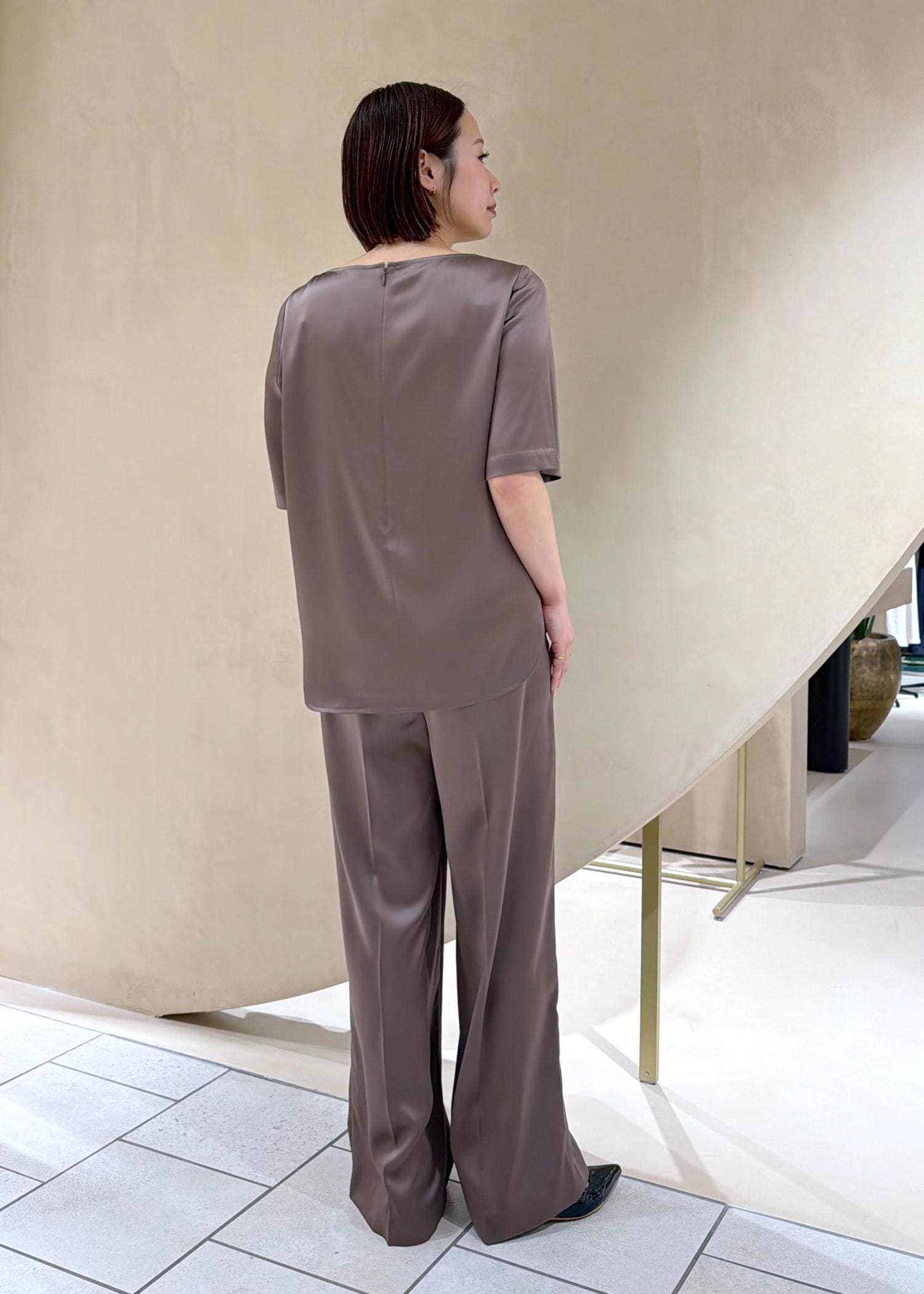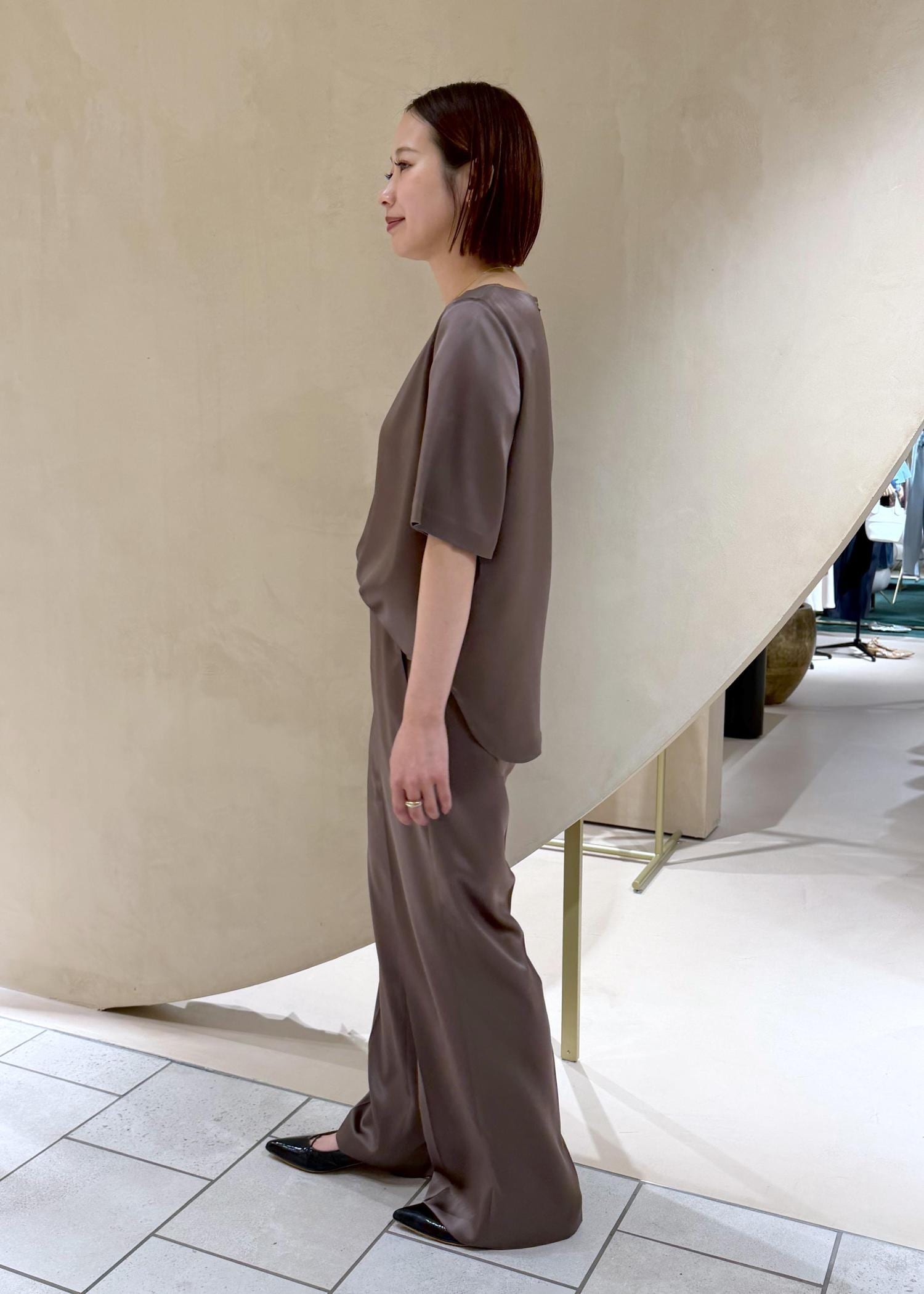 NEW! 予約ROPÉドレープサテンティーブラウス/セットアップ対応・イージーケアキャメル系 / F¥20,900レビューTシャツ感覚で着られるサテンブラウス