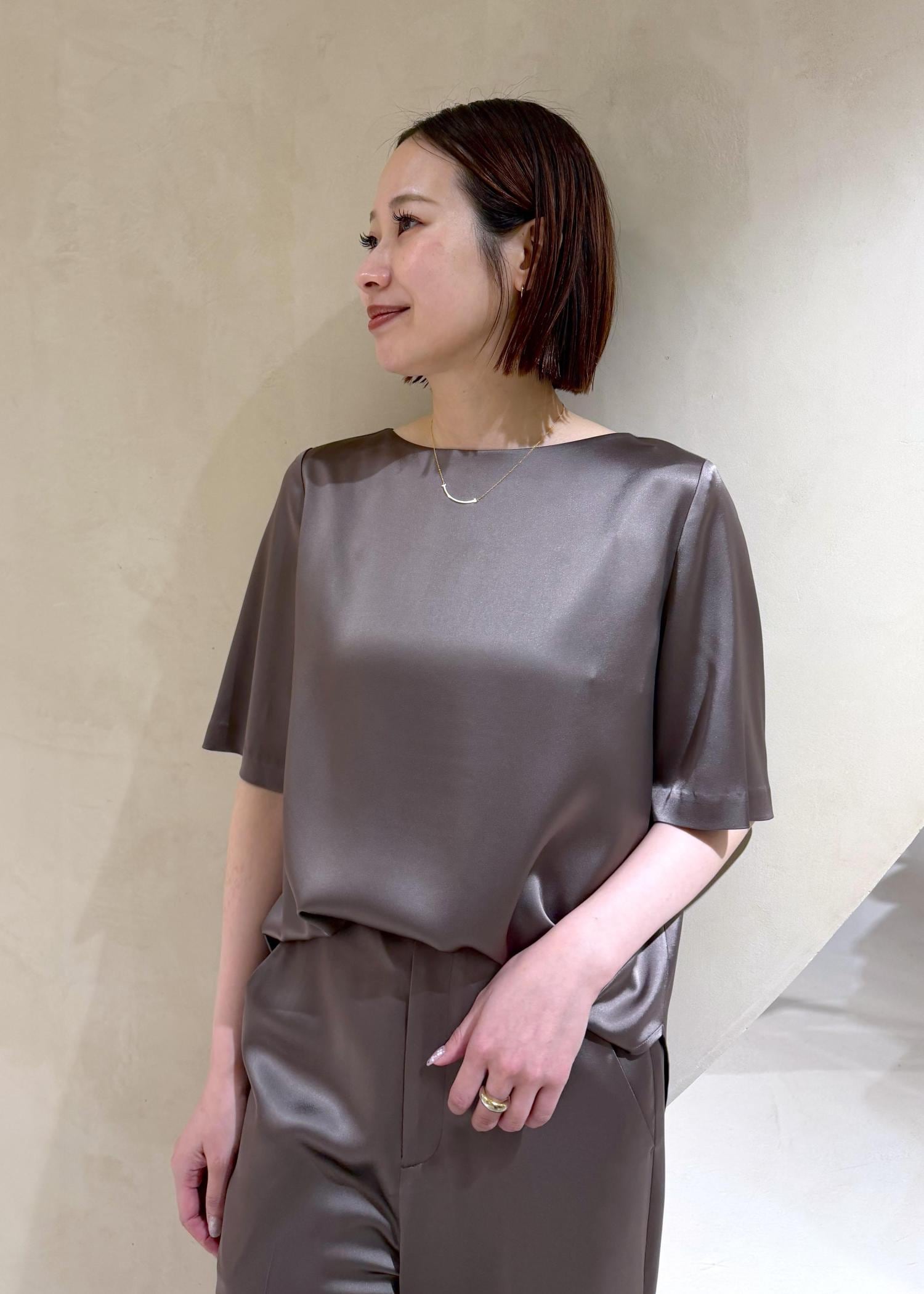 身幅は程よいゆとりがあり肩は落ちてないためすっきりと着られます。サテンの光沢感が上品でジャケットのインナーとしてもおすすめです◎