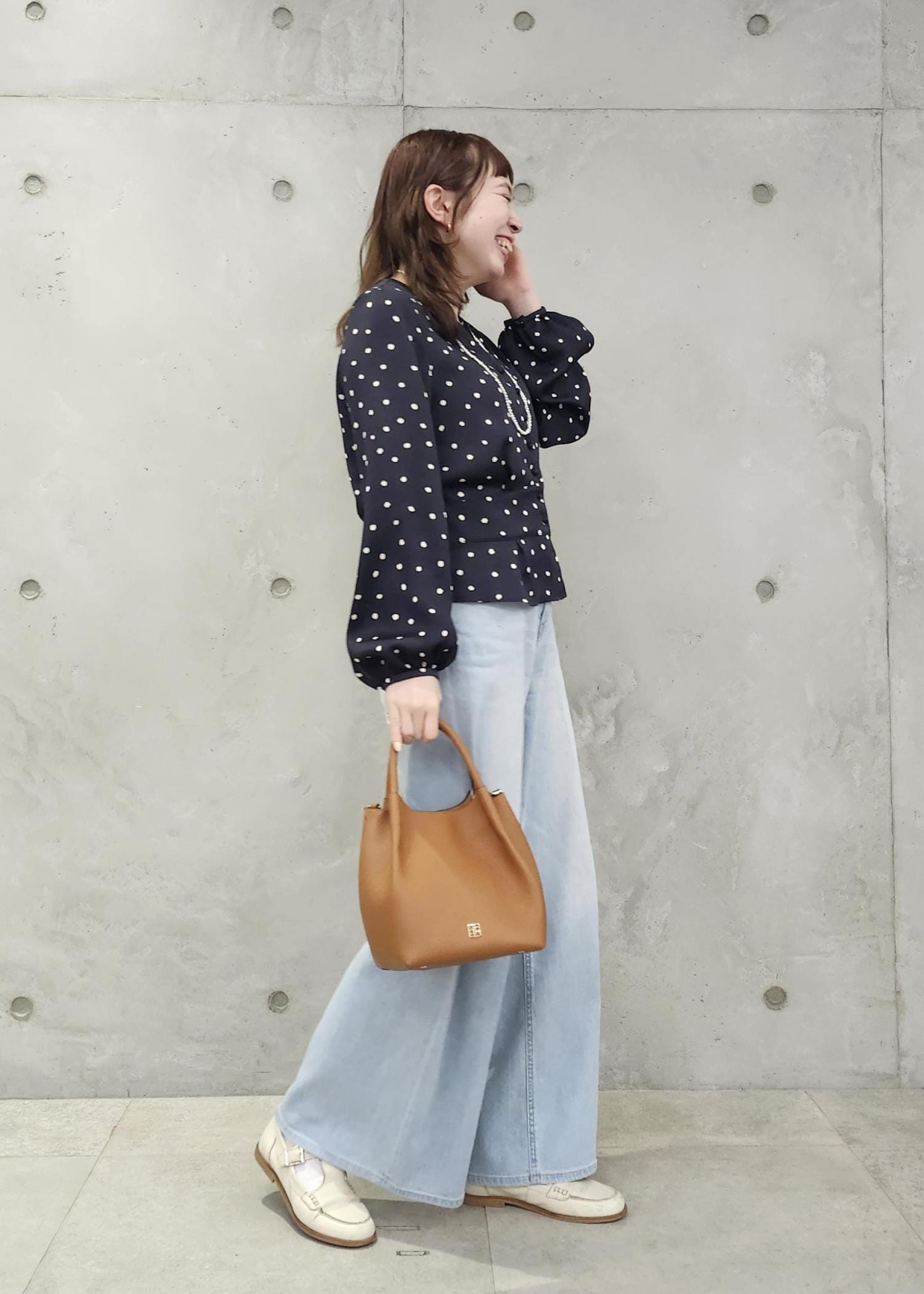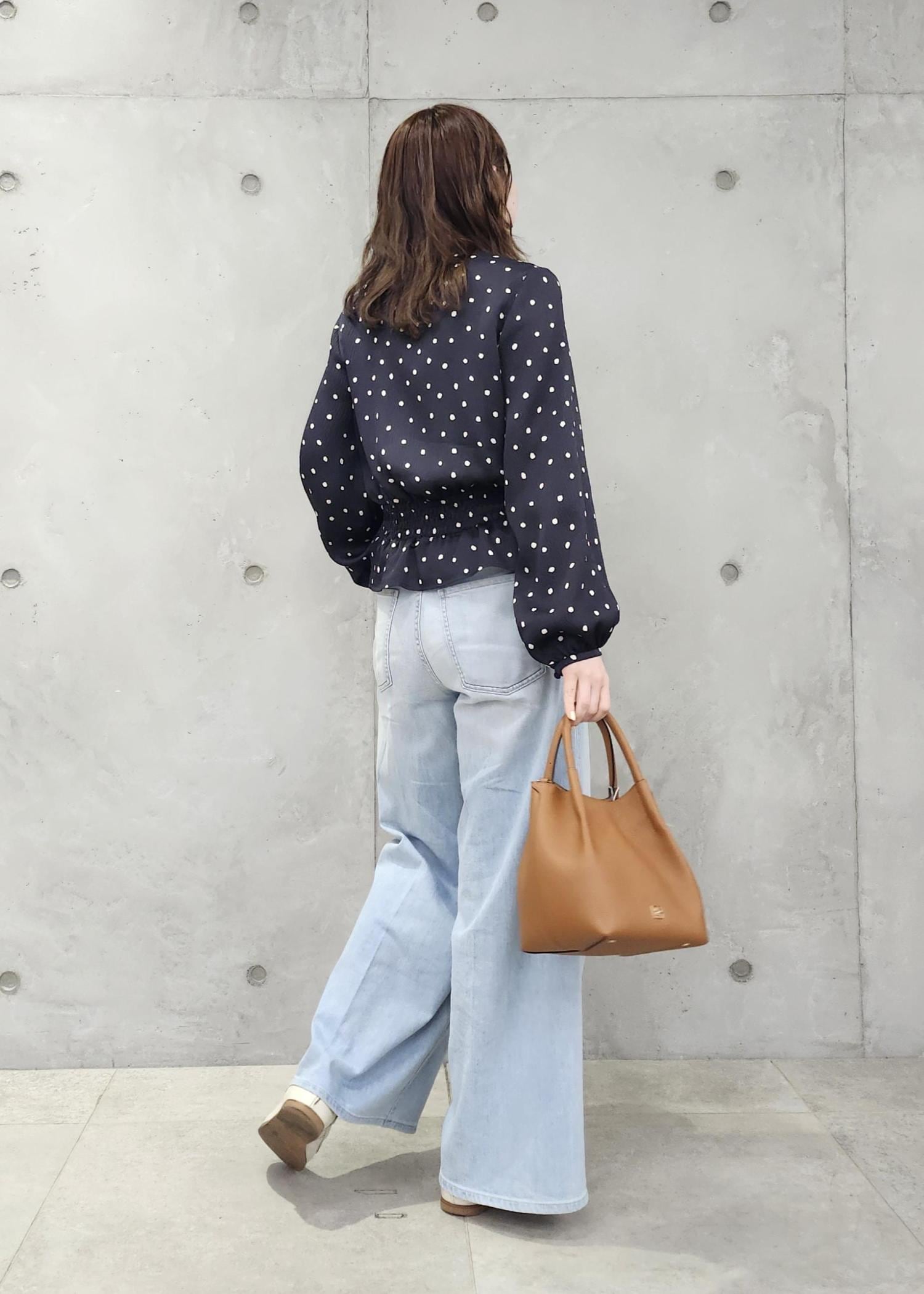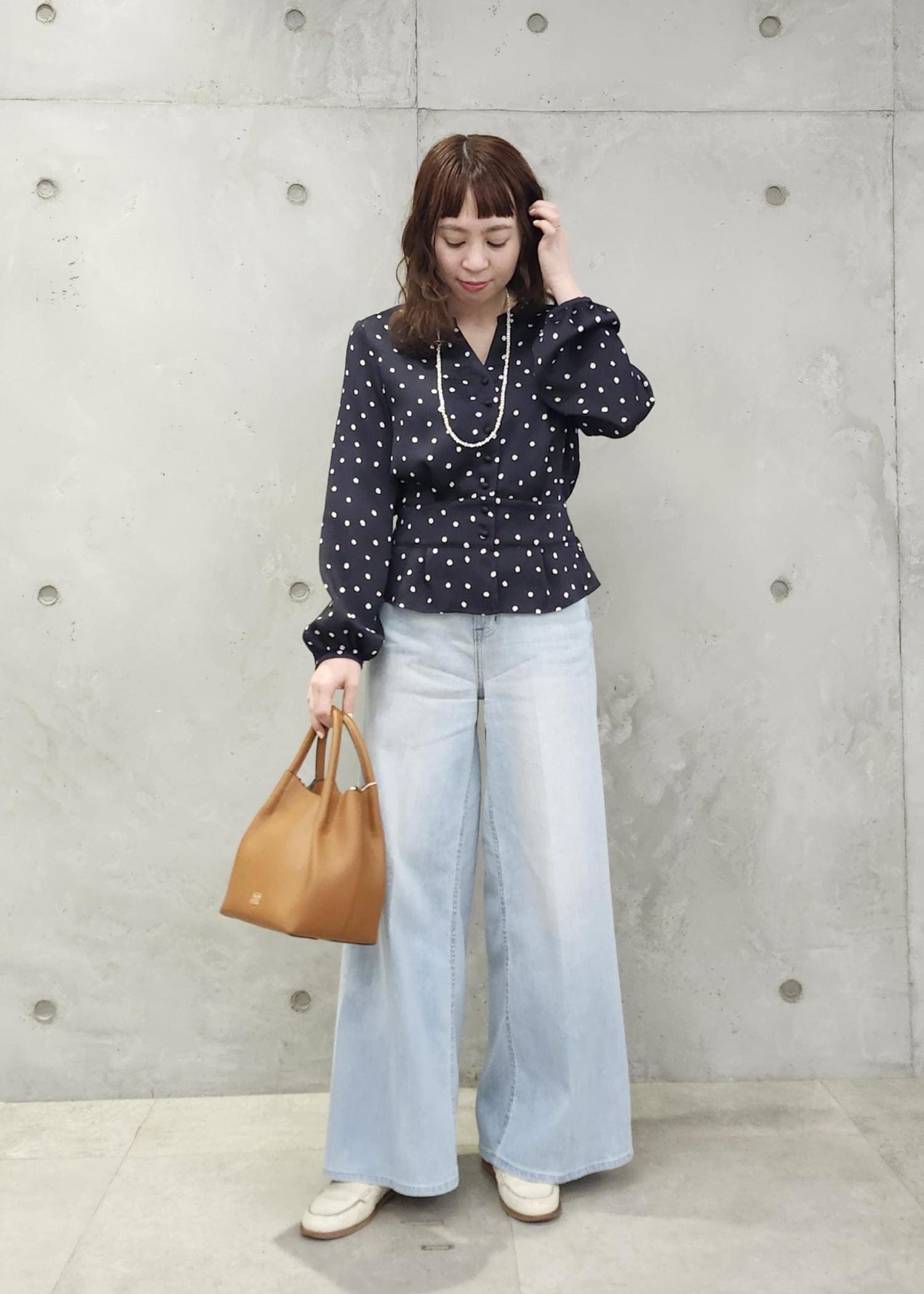 春らしい明るめのトーンのデニムとドットブラウスをあわせて大人カジュアルなコーディネートです。