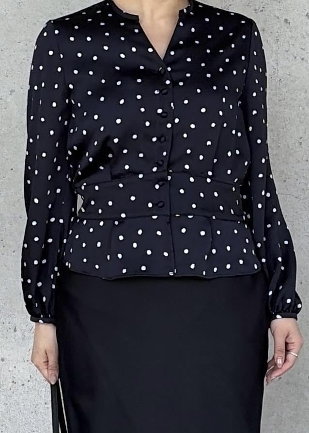 大人のドット柄で普段使いしやすいペプラムブラウスです。