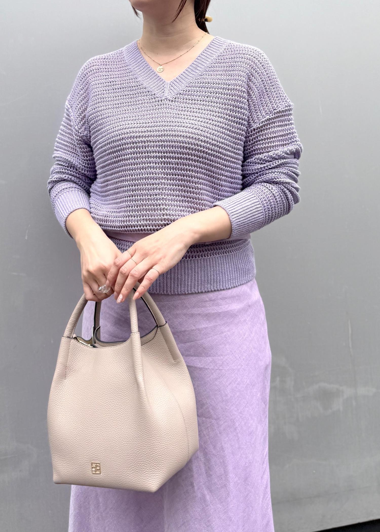 予約ROPÉリネン畦編みVネックニット/イージーケアラベンダー / F¥24,200レビュー身幅・アームホールはゆったりとしていて、袖も手の甲が隠れるくらいでやや長めでした。