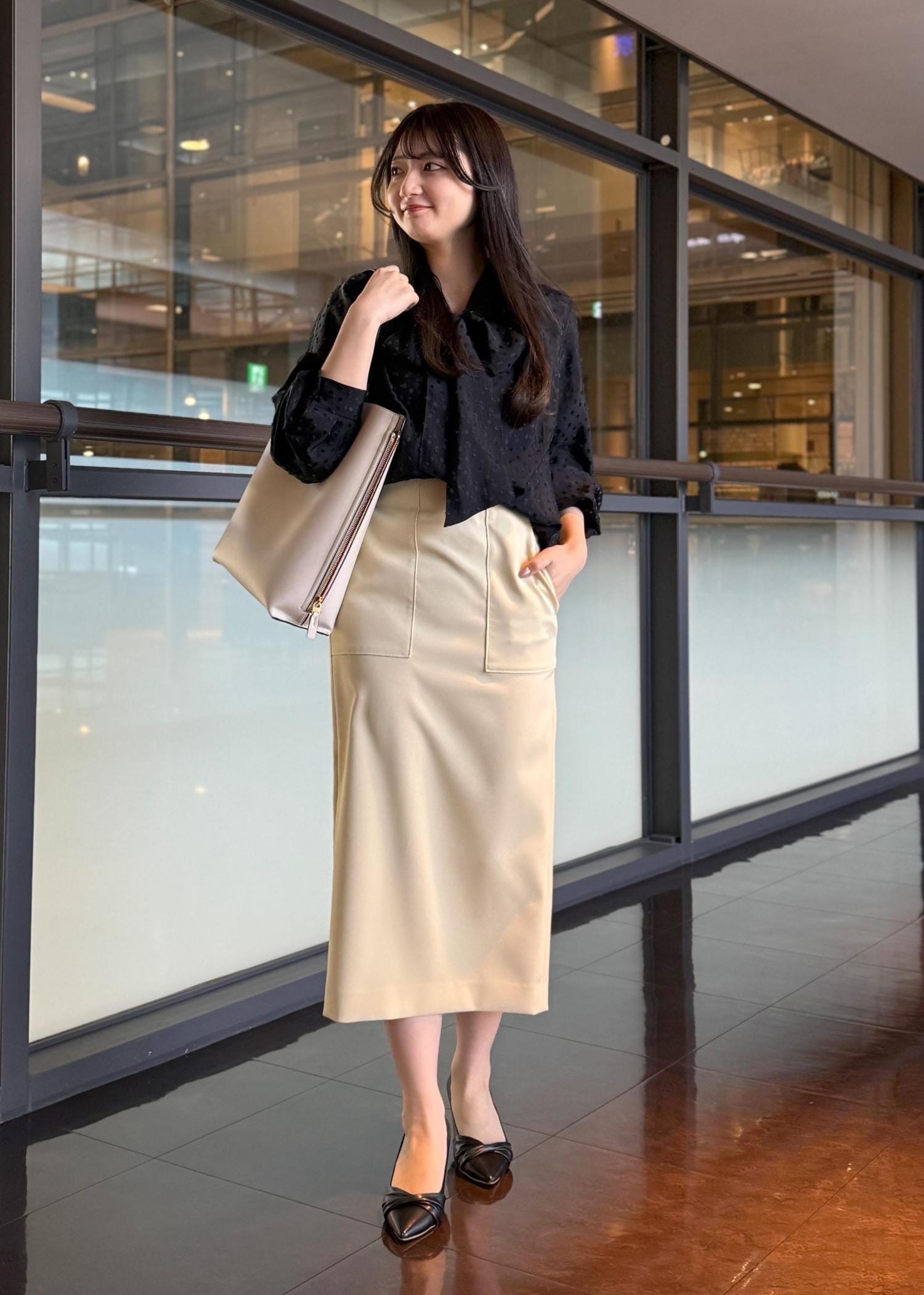 丈は足首見える着丈なので、パンプスでも、フラットシューズでも、バランスよく合わせやすい丈です。 -