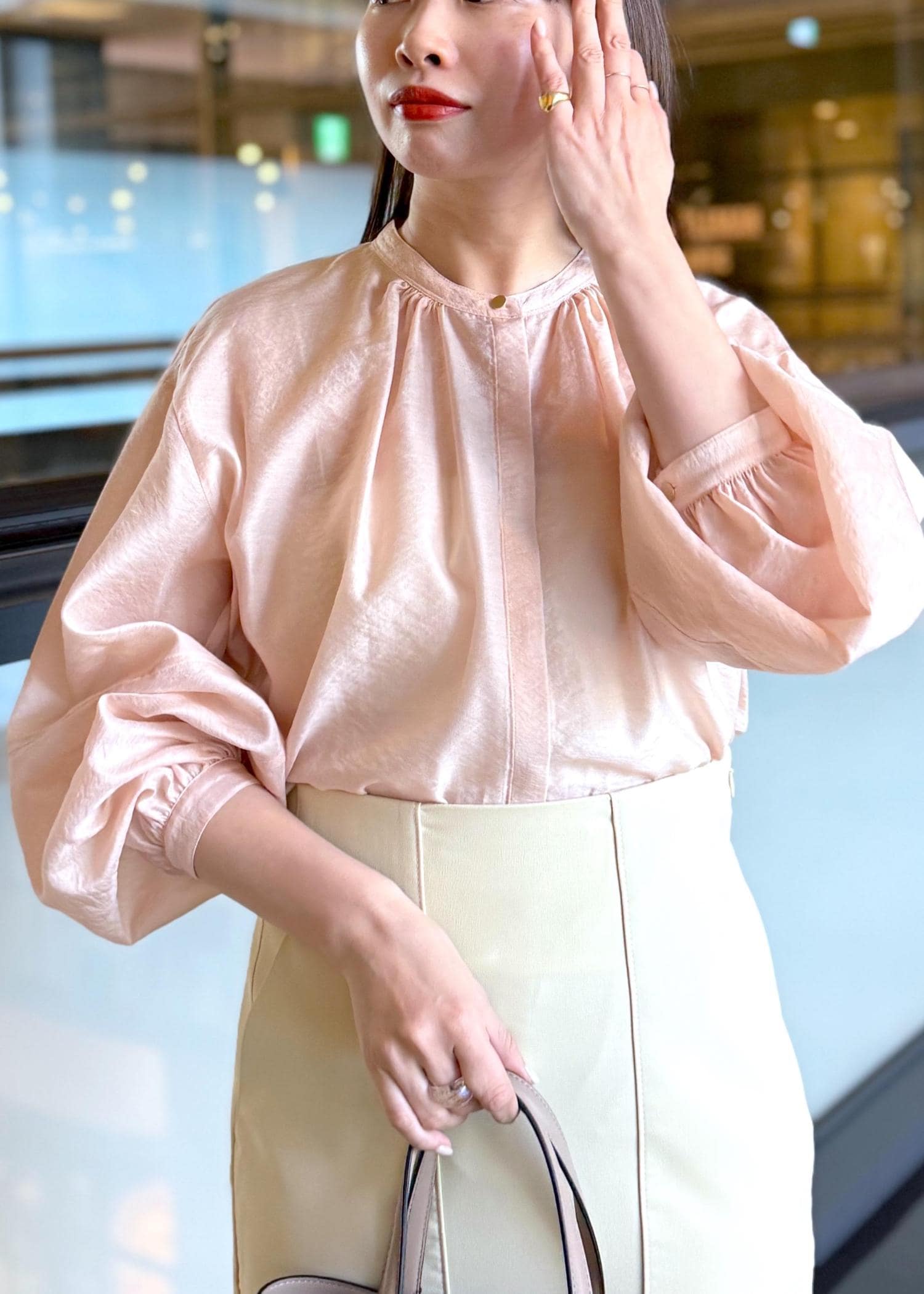 ROPÉキュプラシルクボリュームスリーブブラウス/イージーケアピンク系 / F¥19,800レビュー身幅にゆとりはありますが、大きいとは感じず、ちょうど良かったです◎
