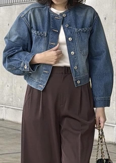 ノーカラーとコクーンシルエットが女性らしく、さりげないポケット部分の編みがアクセントの春に大活躍するデニムジャケットです。ゆったりしたクロップド丈で重ね着もしやすいです。