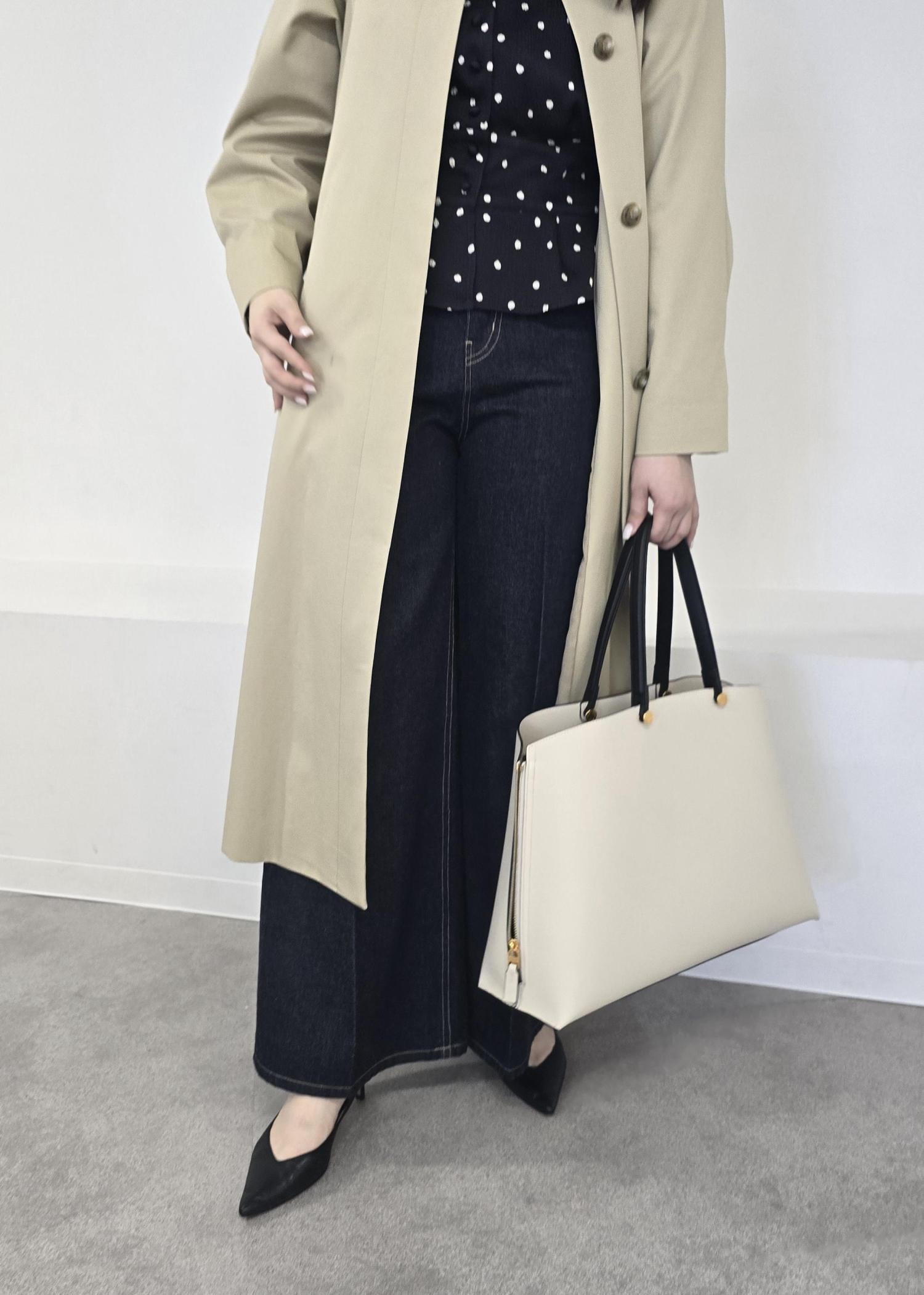 ROPÉイージーワイドデニムパンツ(岡山デニム)/セットアップ対応・イージーケアネイビー / 38¥30,800レビュー着丈はフラットシューズで地面にギリギリつかない丈感です。