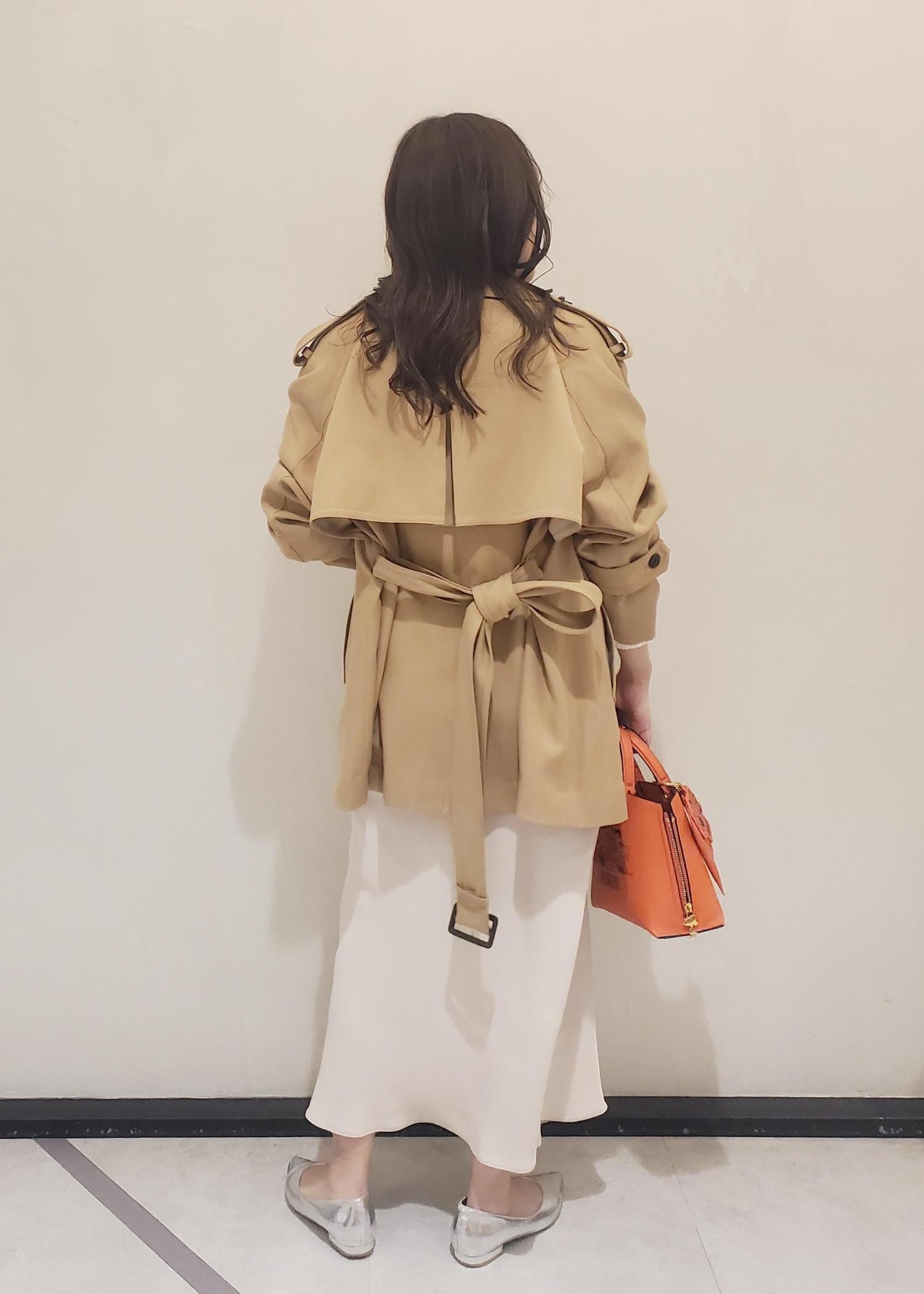 通常のトレンチのようなハリのある素材ではなく、落ち感があり柔らかなのでかっこいい印象よりも女性らしく優しげな雰囲気にしてくれます♪トレンチを着るとかちっと決まりすぎてしまうという方にもおすすめの一着です! -