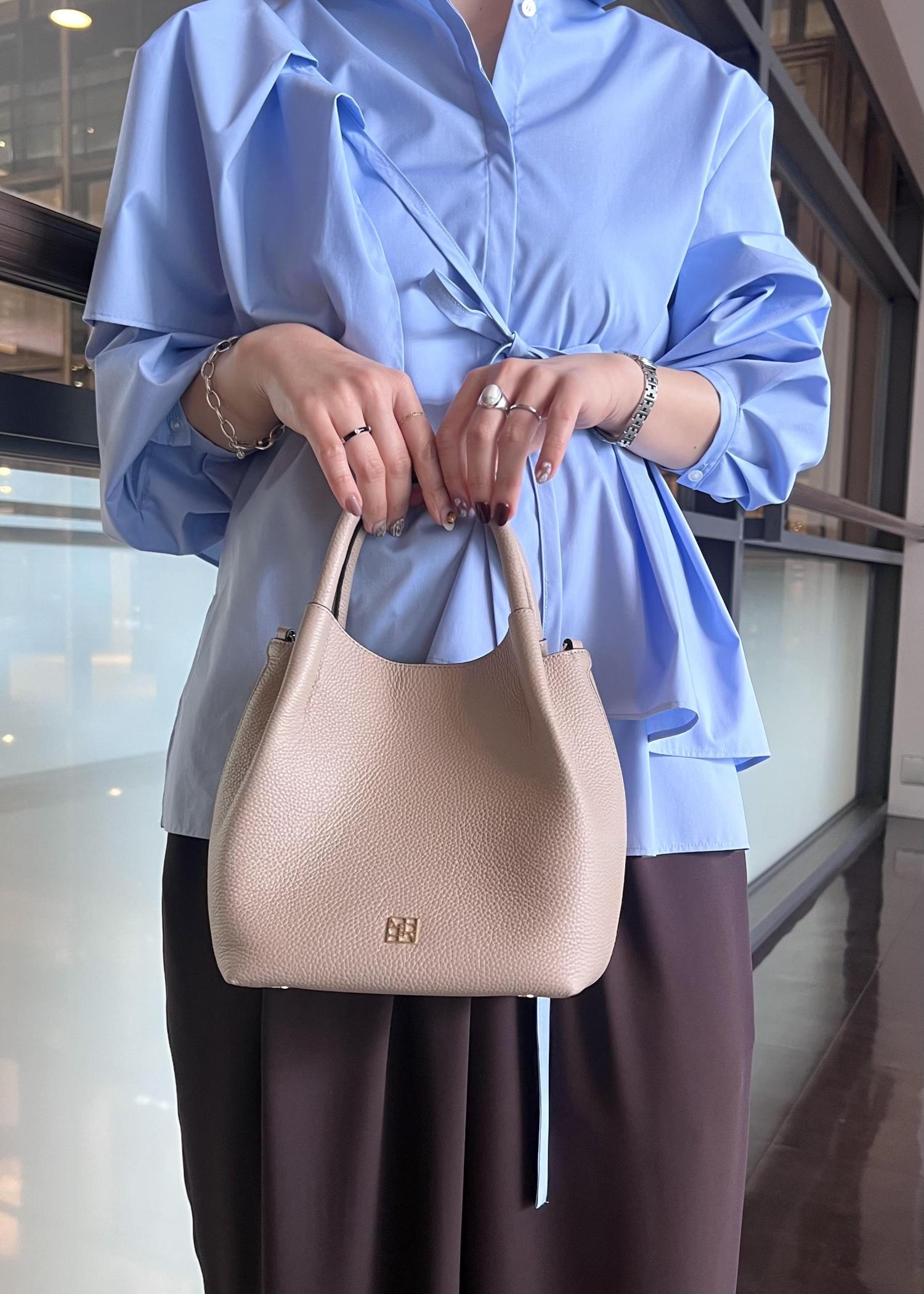 ROPÉ2WAYキューブボックスレザーハンドバッグチャコール / F¥33,000レビューミニ財布、スマホ、小さめポーチ、ハンカチ、250mlペットボトルが入るサイズ感。