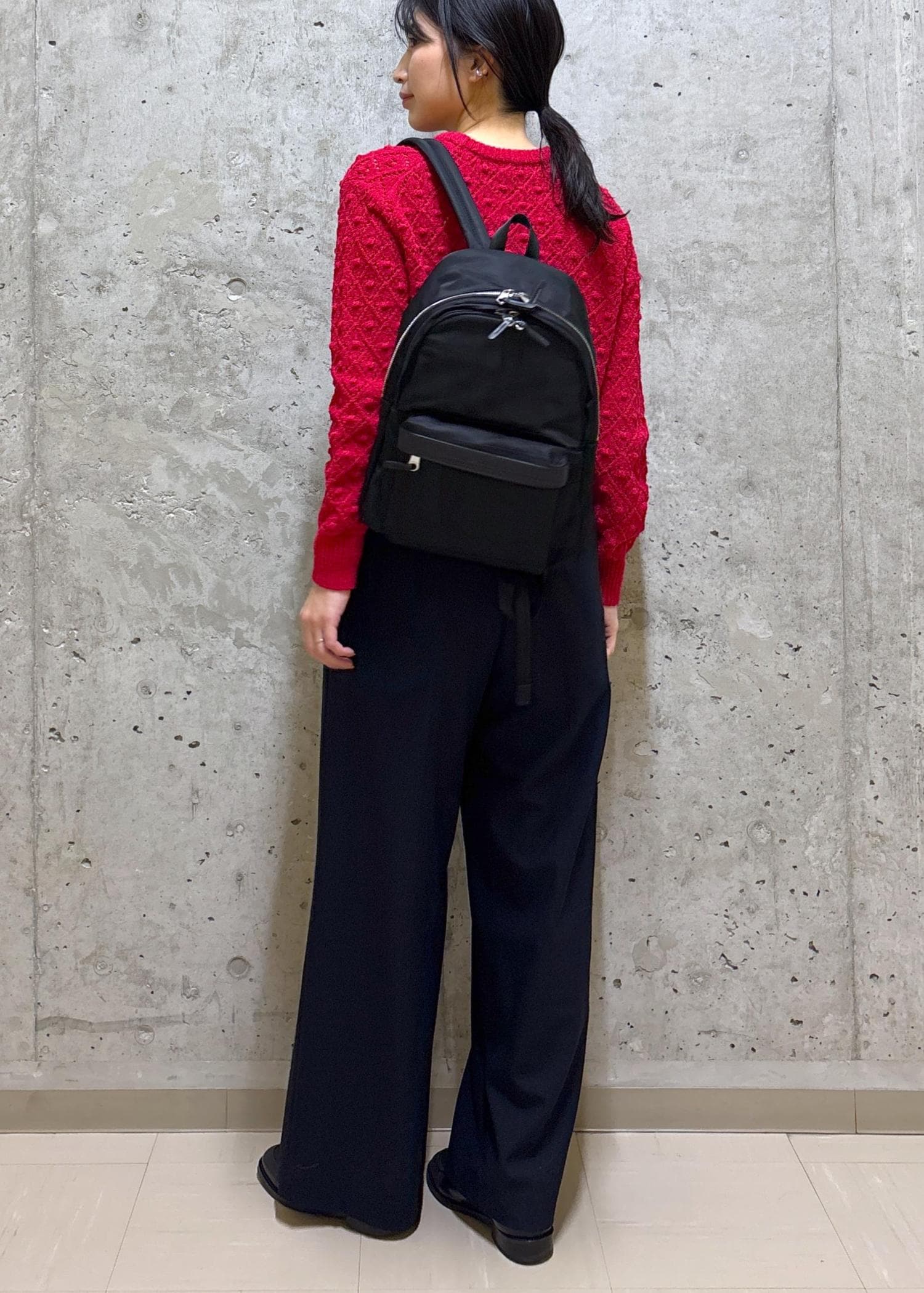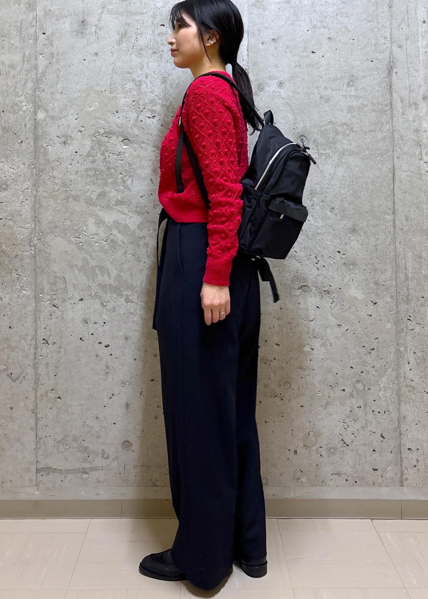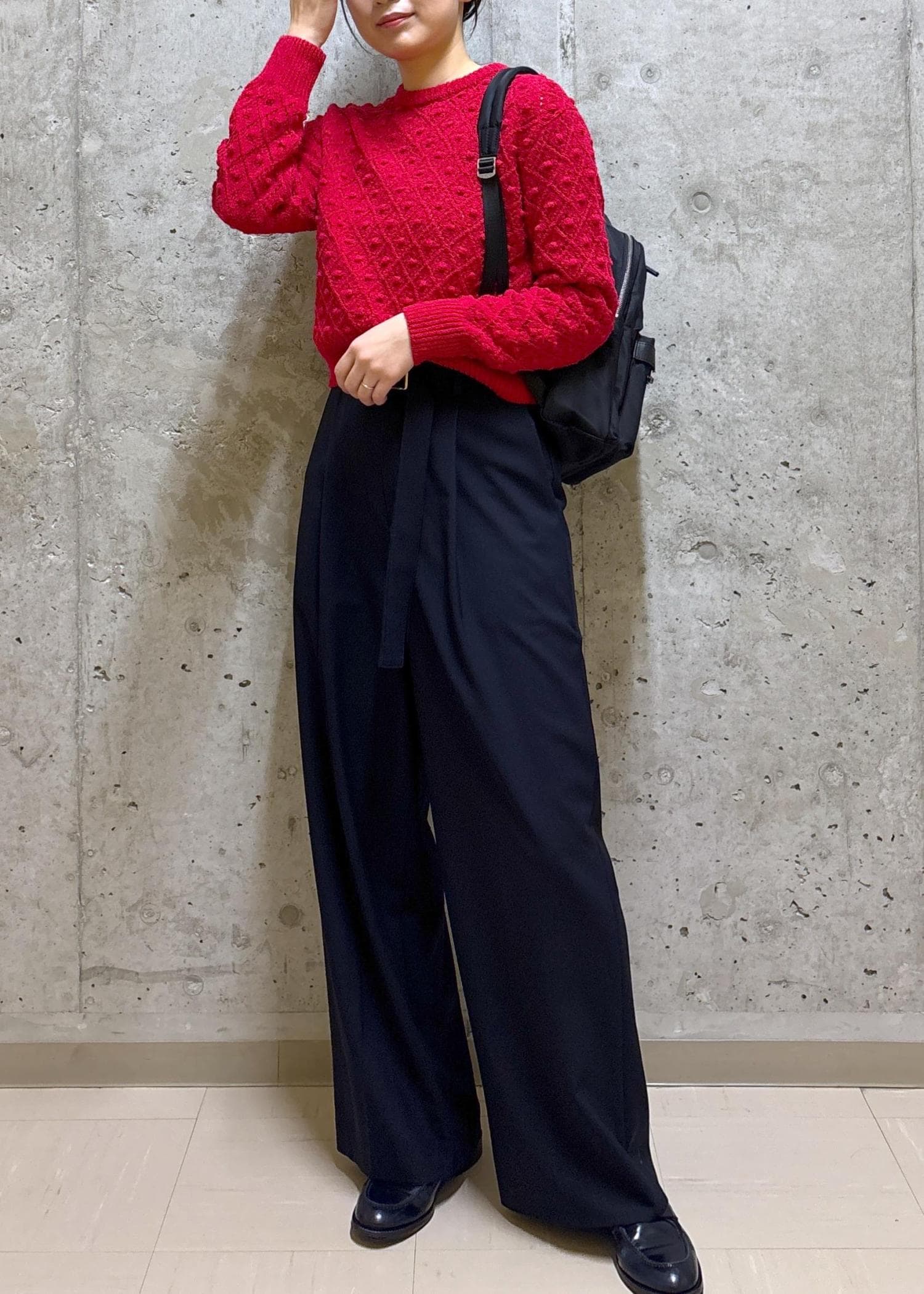 赤ニットが主役の休日コーディネート