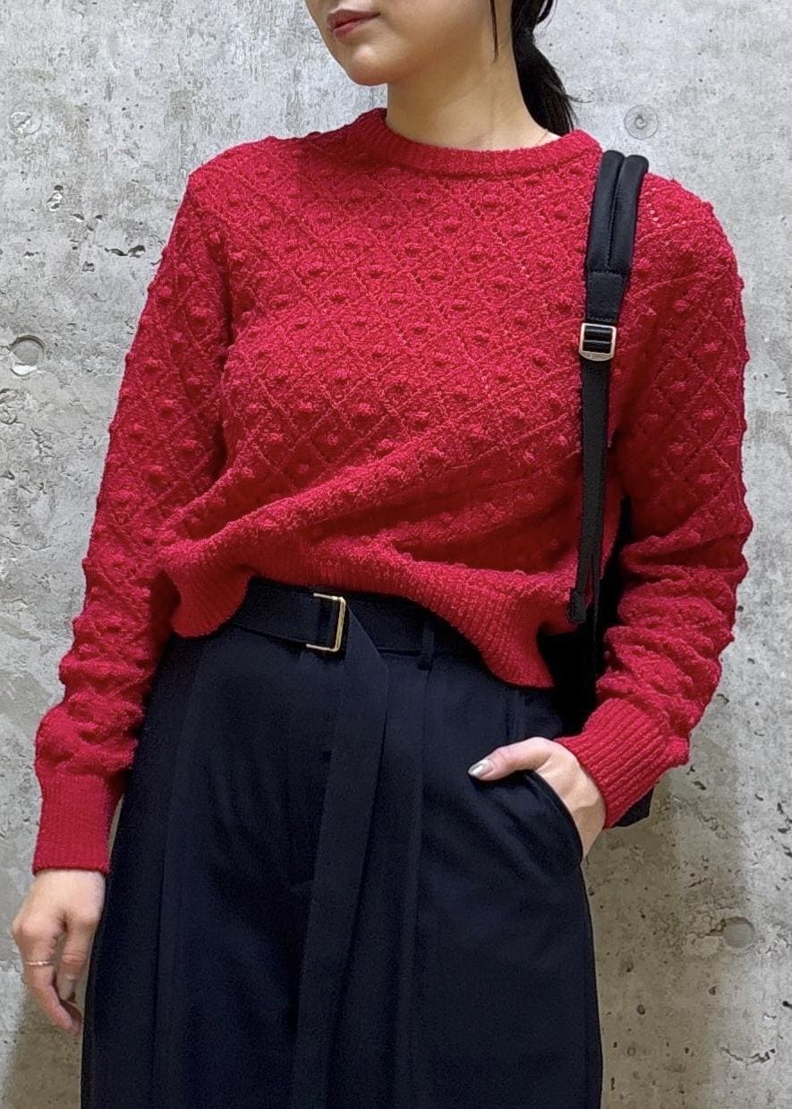 ROPÉダイヤ柄ポップコーン編みニット/イージーケアレッド / F¥16,500レビュー肩・腕まわりに少し余裕があって動きやすいサイズ感。