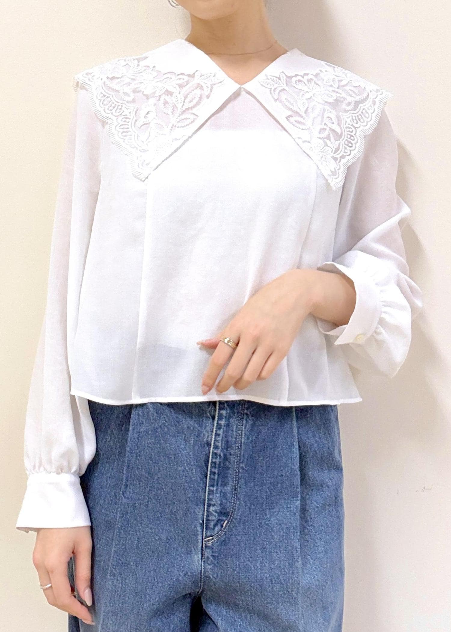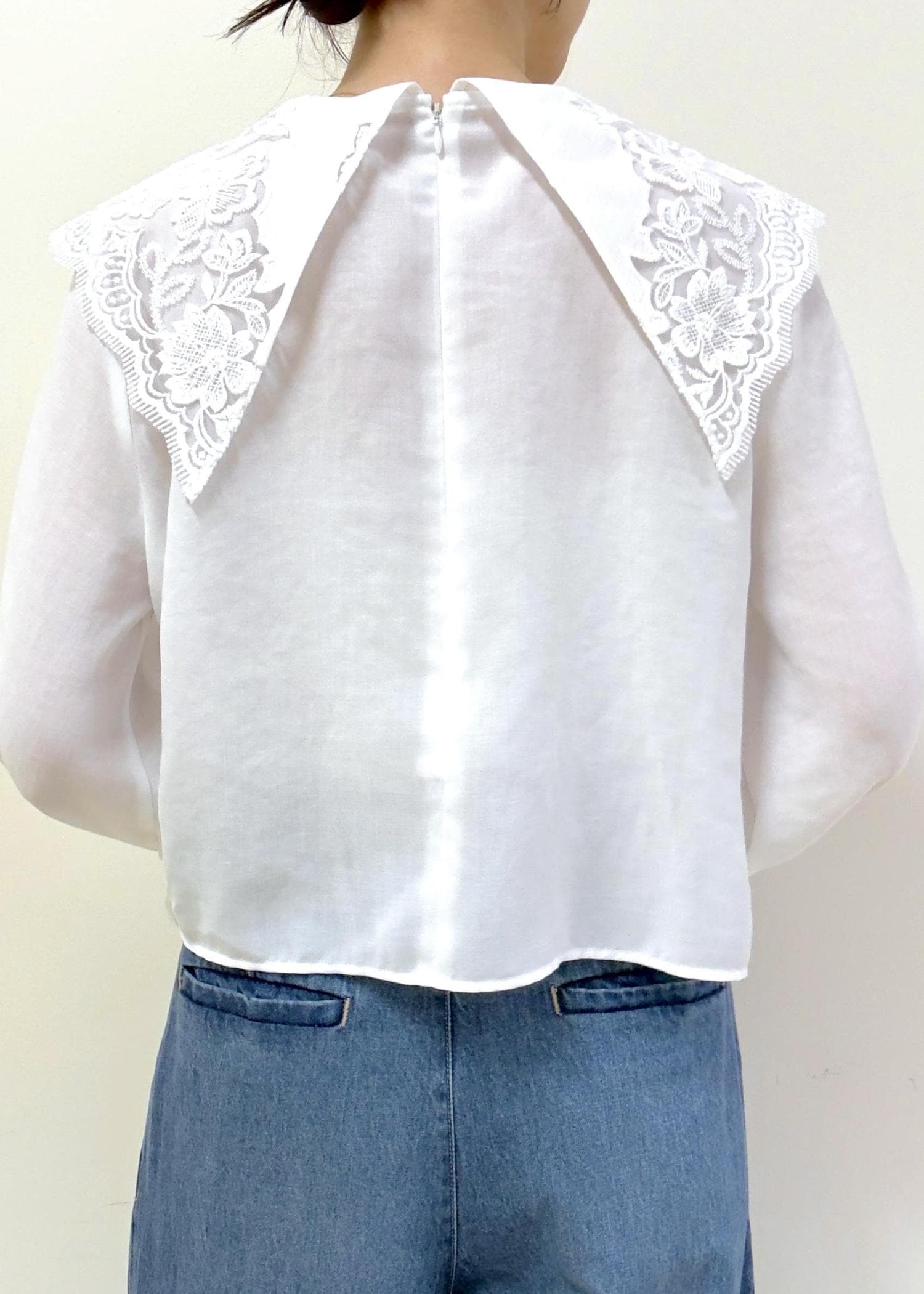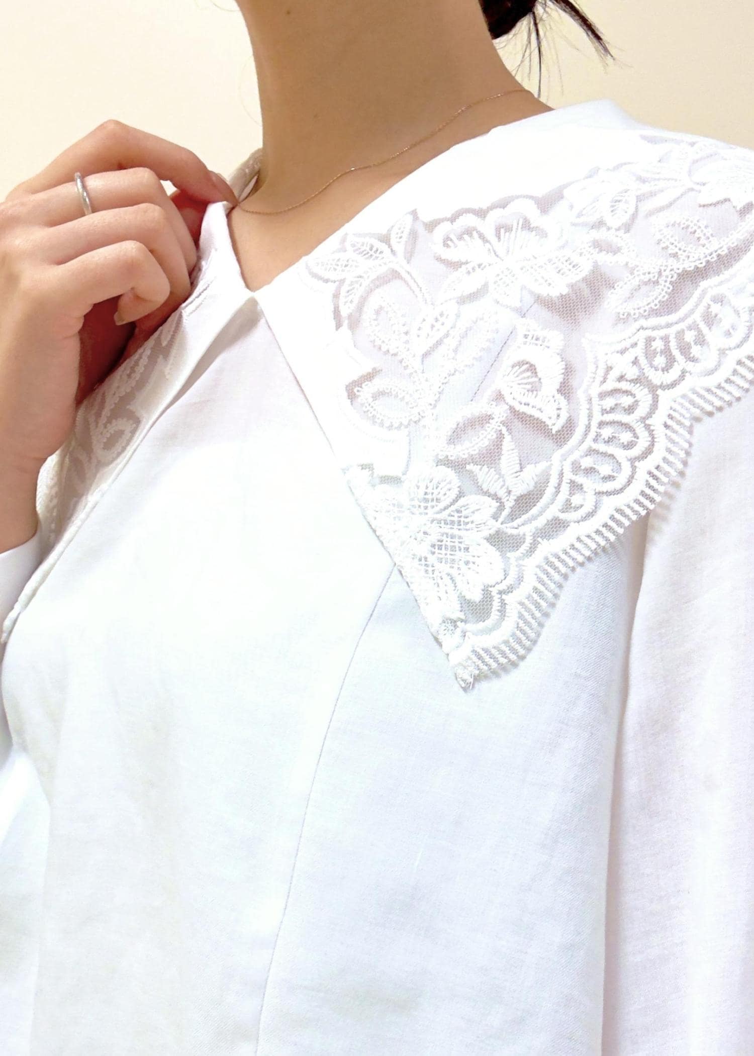 大きめな襟が特徴的ですが、Vネックになっていたり、繊細なレースデザインになっているので幼く見えず、大人らしいスタイリングでお楽しみいただけます。 -
