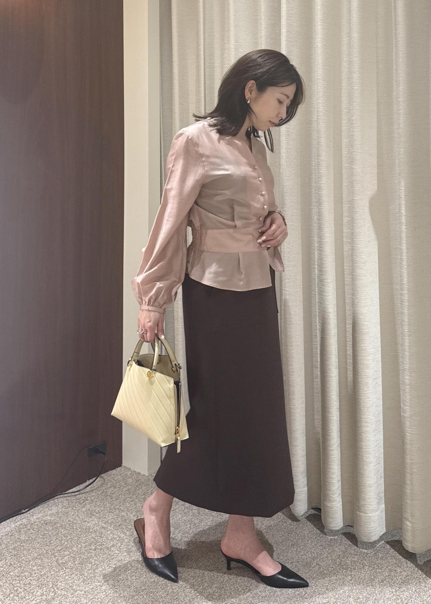 柔らかなピンクブラウスにブラウンスカートを合わせた、大人のきれいめコーデ。
