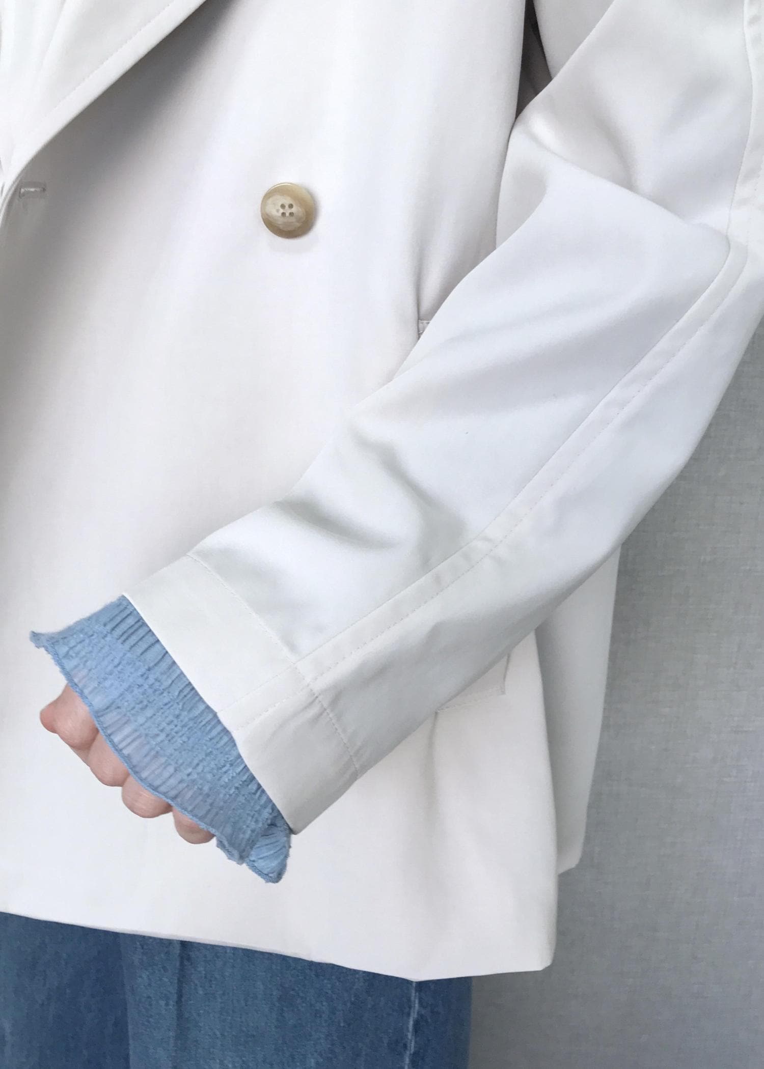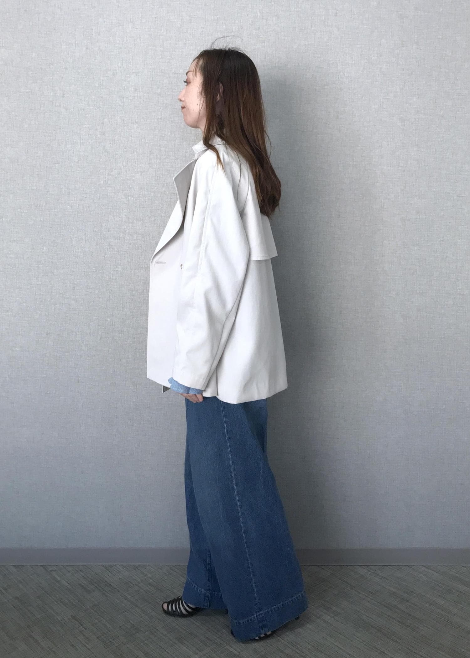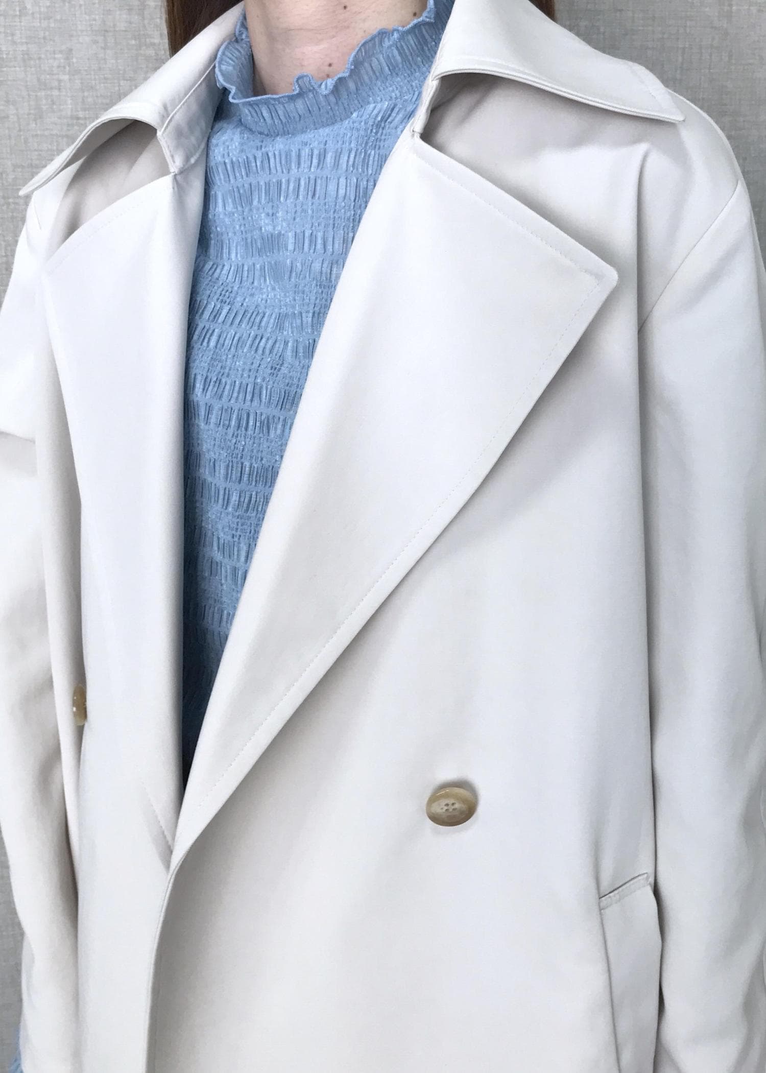 NEW!ROPÉ【撥水加工】ライトミドル丈トレンチコートオフホワイト / F¥39,600レビュー身頃、袖と全体的にゆったりシルエットです。ハーフ丈ということもあり、軽さがあり持ち運びにも便利です。