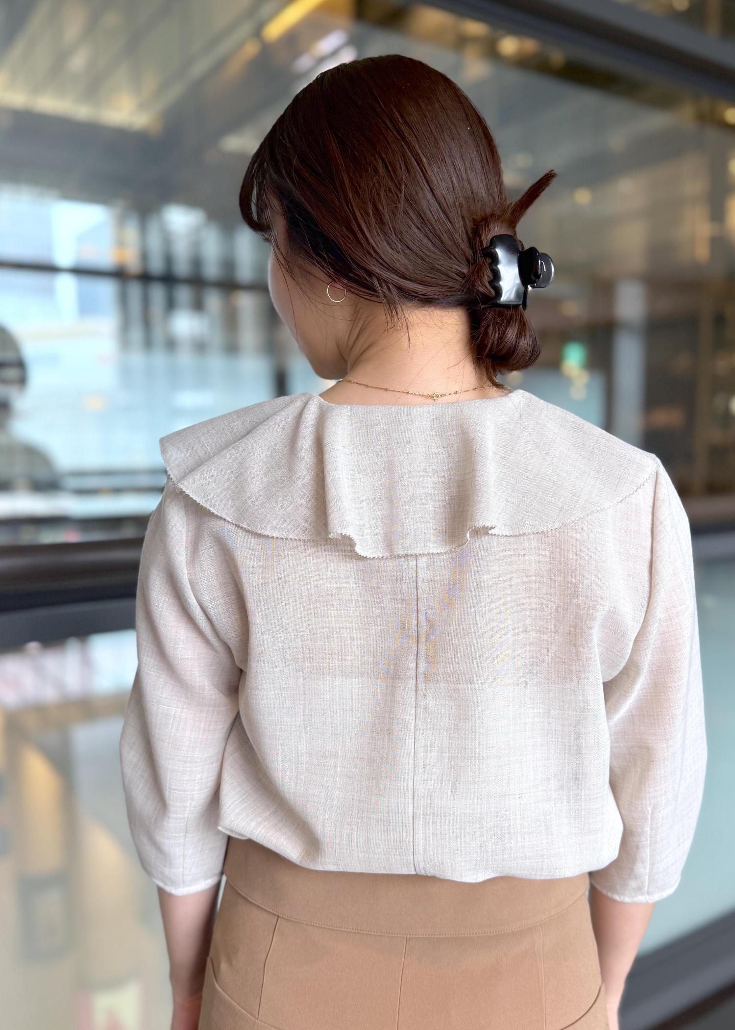 予約ROPÉリネンライクフリルカラーブラウス/セットアップ対応・イージーケアベージュ / 38¥19,800レビュー身幅や袖まわりにゆとりはありますが、柔らかい素材で程よく身体に沿うシルエットなので、ちょうど良かったです。