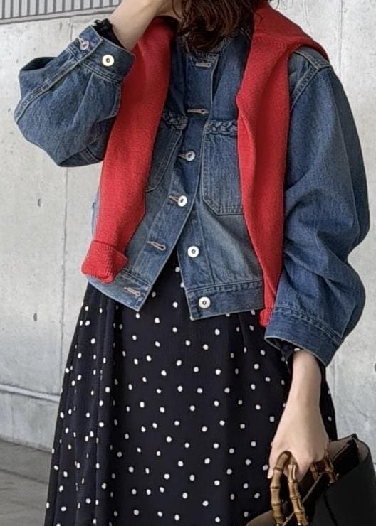 ノーカラーとコクーンシルエットが女性らしく、さりげないポケット部分の編みがアクセントの春に大活躍するデニムジャケットです。ゆったりしたクロップド丈で重ね着もしやすいです。