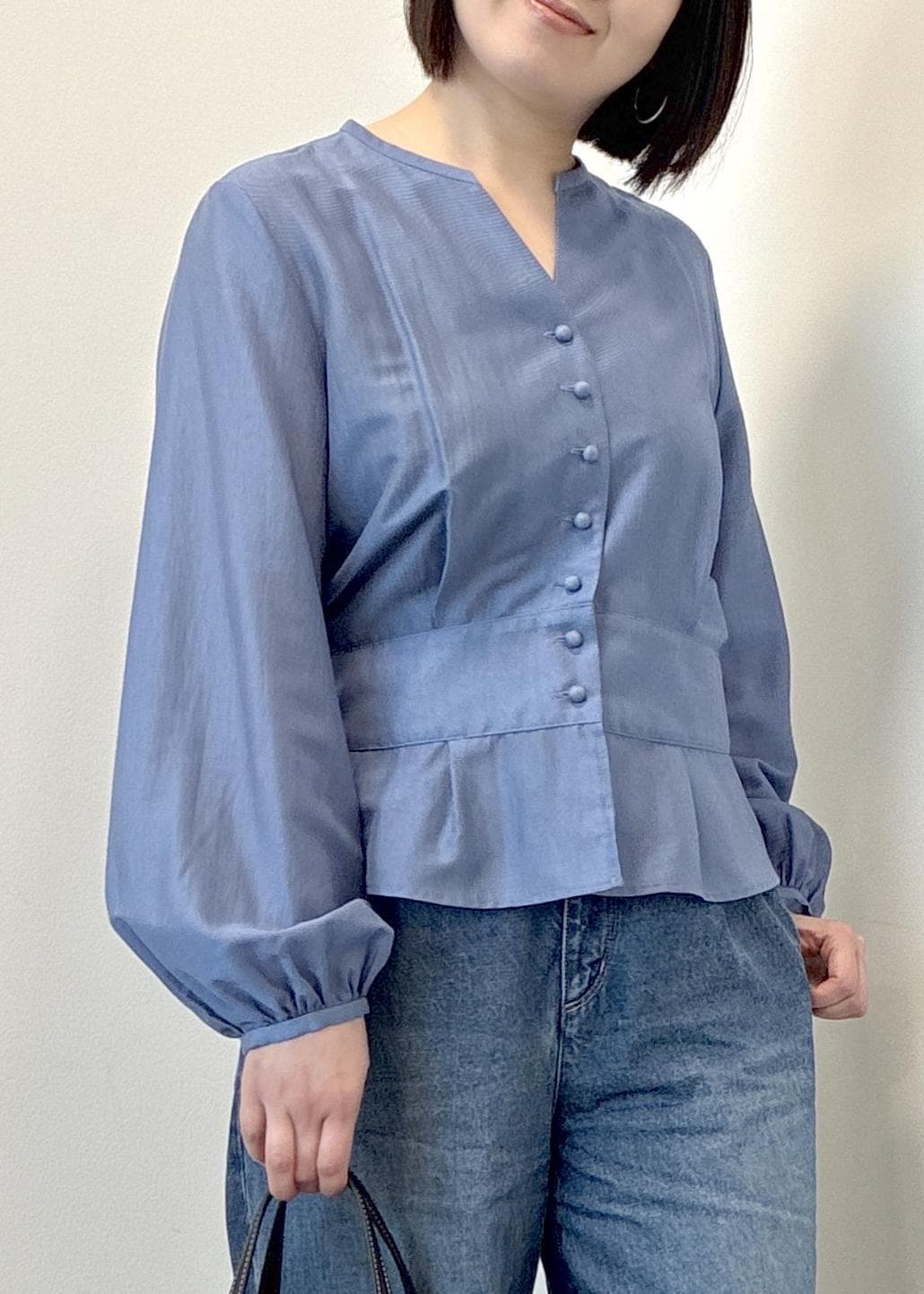 程良いシアー感と上品な光沢感のあるデザインブラウスです。