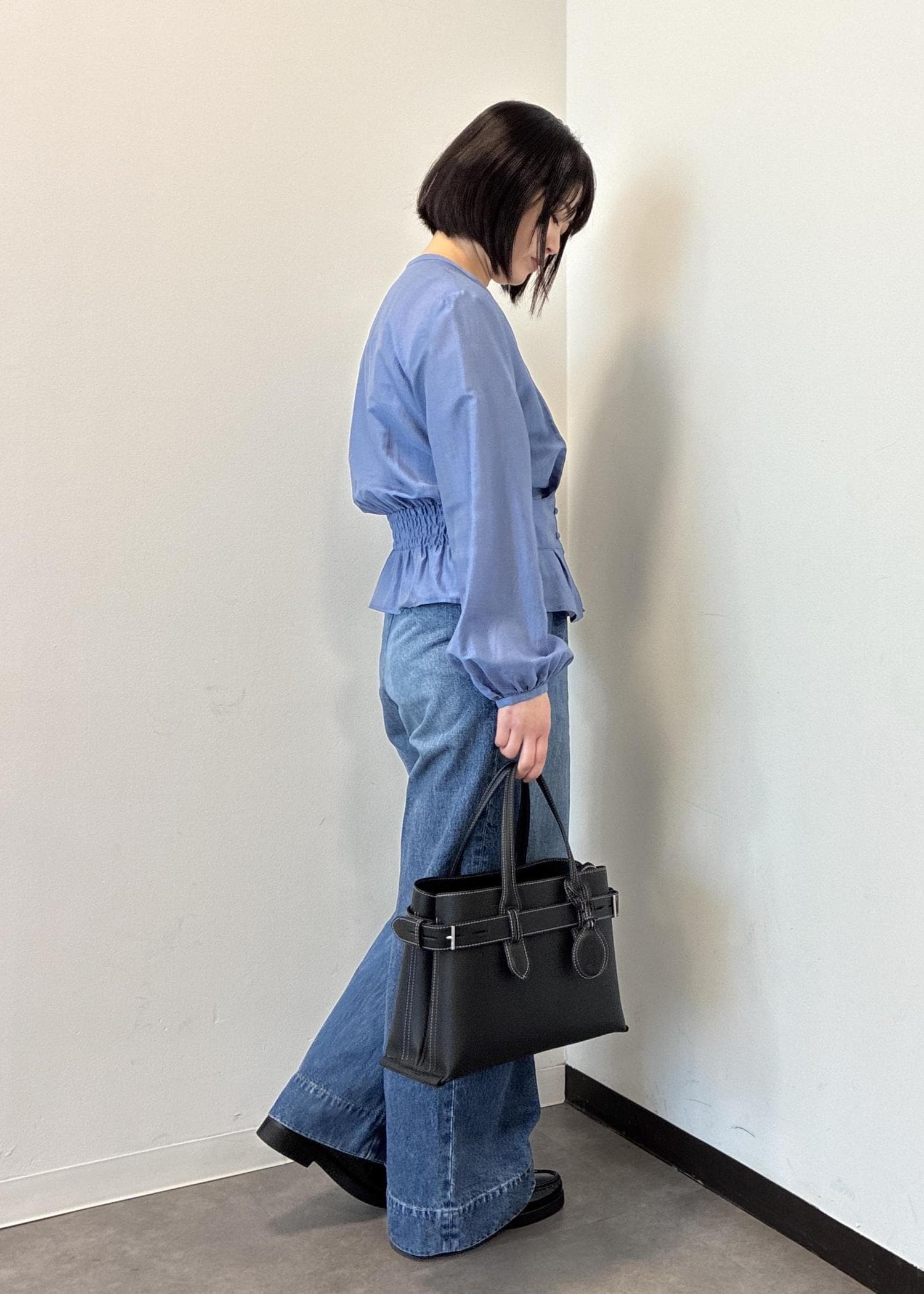 上品に穿けるワイドデニムパンツですので、綺麗目ブラウスとの相性も良いです。