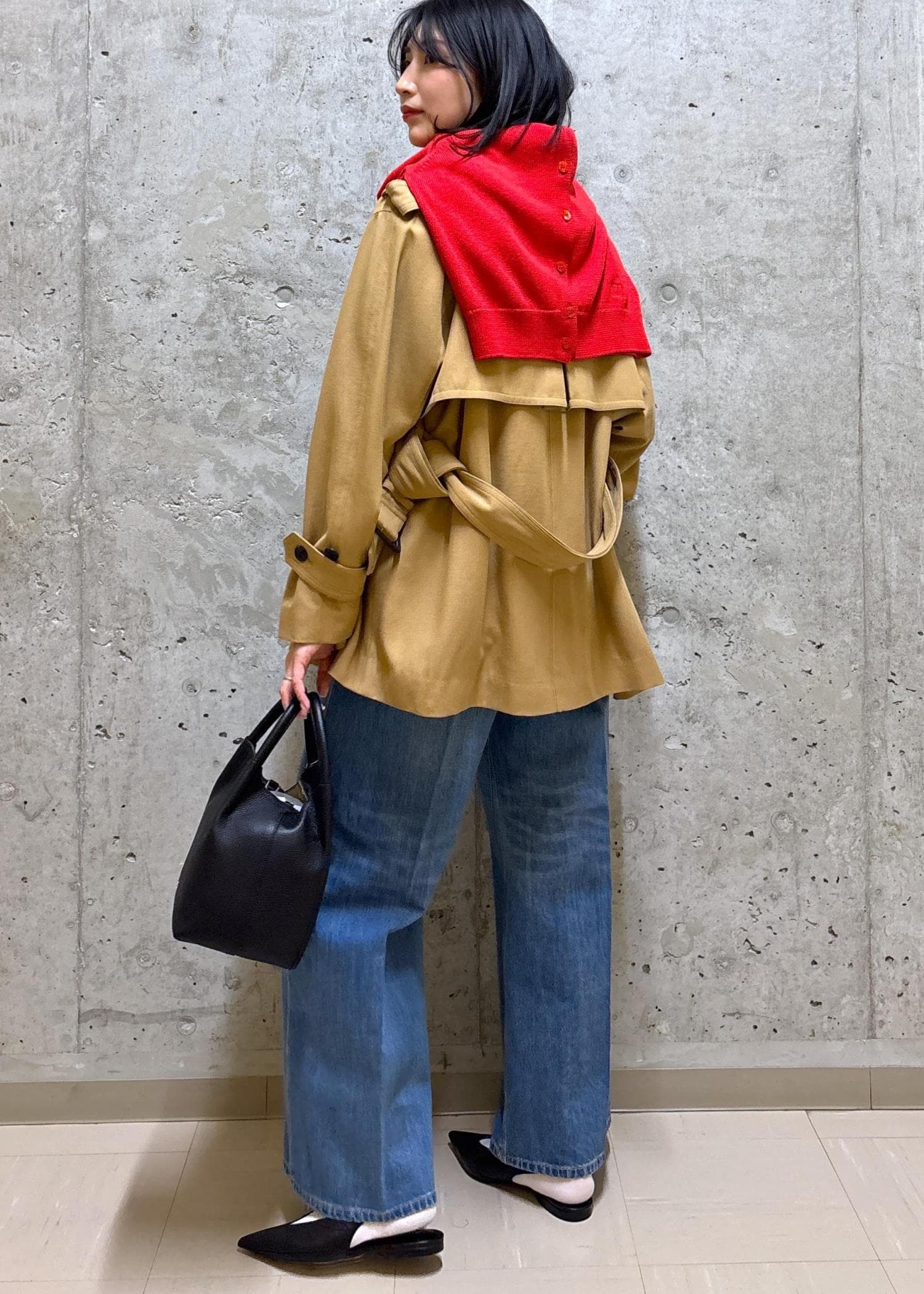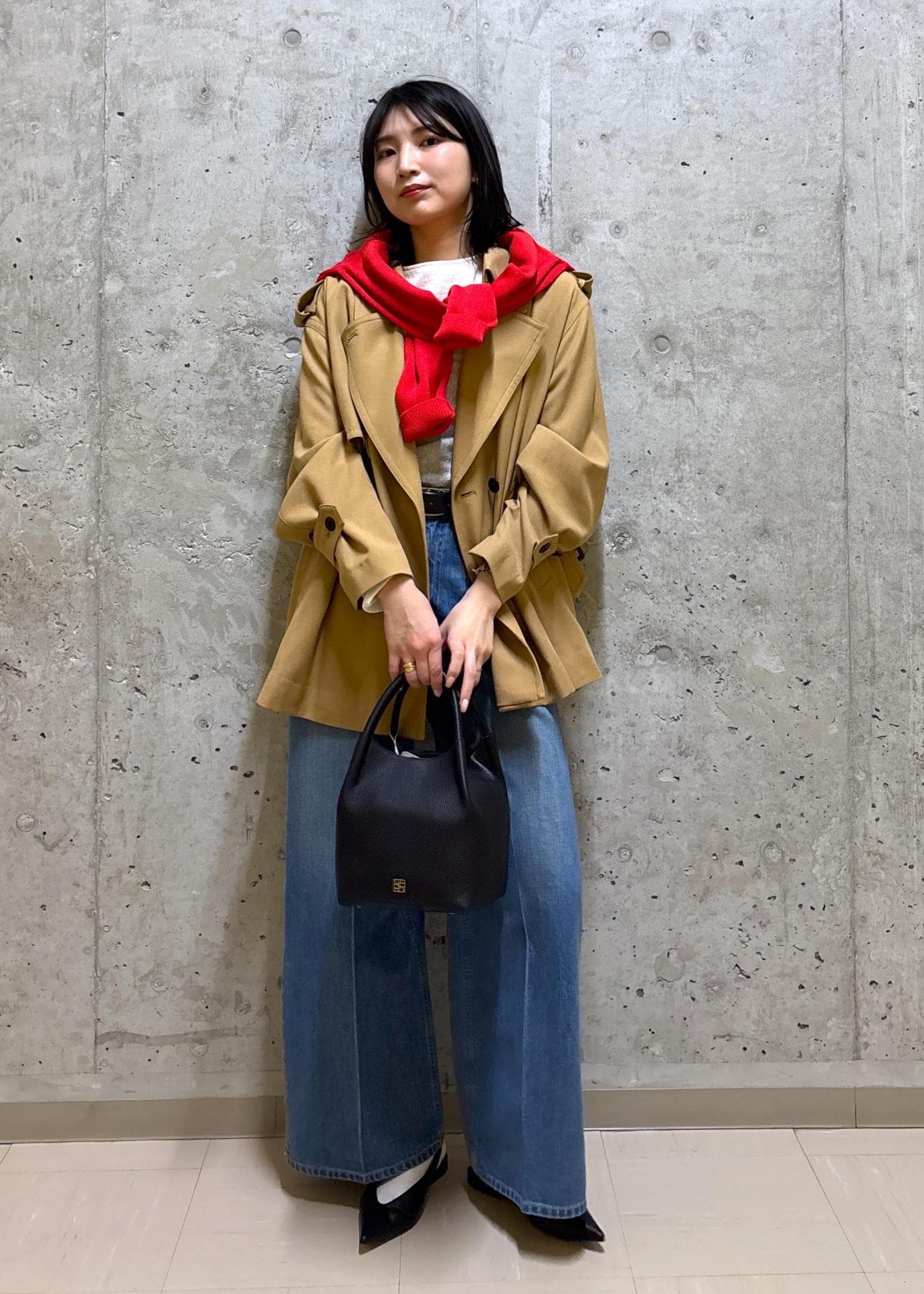 ベーシックなベージュ×デニムに、真っ赤なカーディガンをひとさじ。