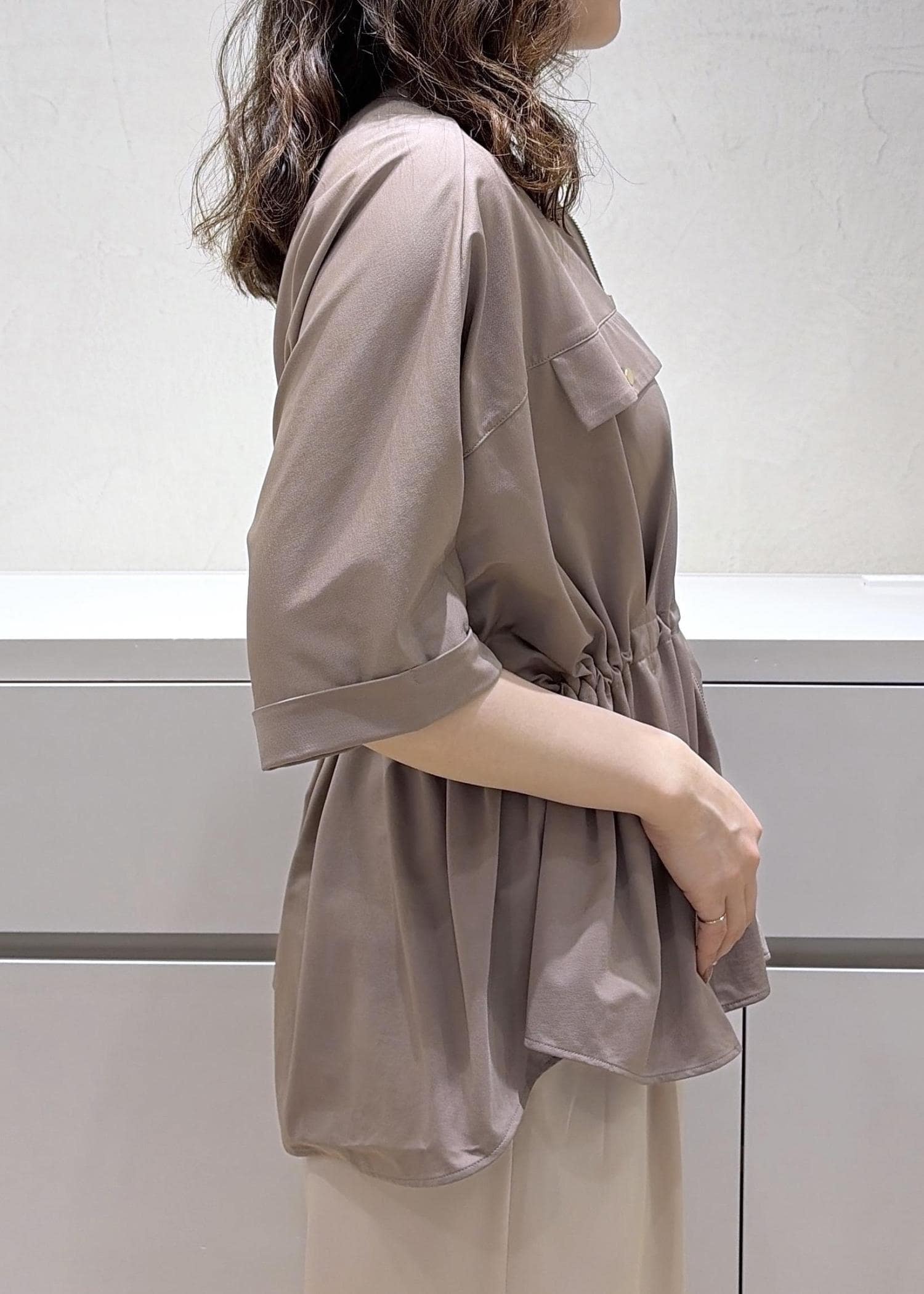 全体的にゆとりのあるサイズ感で体型を選ばないシルエットです。袖丈は肘にかかるくらい。着丈は前後差があり、後ろはヒップが隠れるくらいでした。