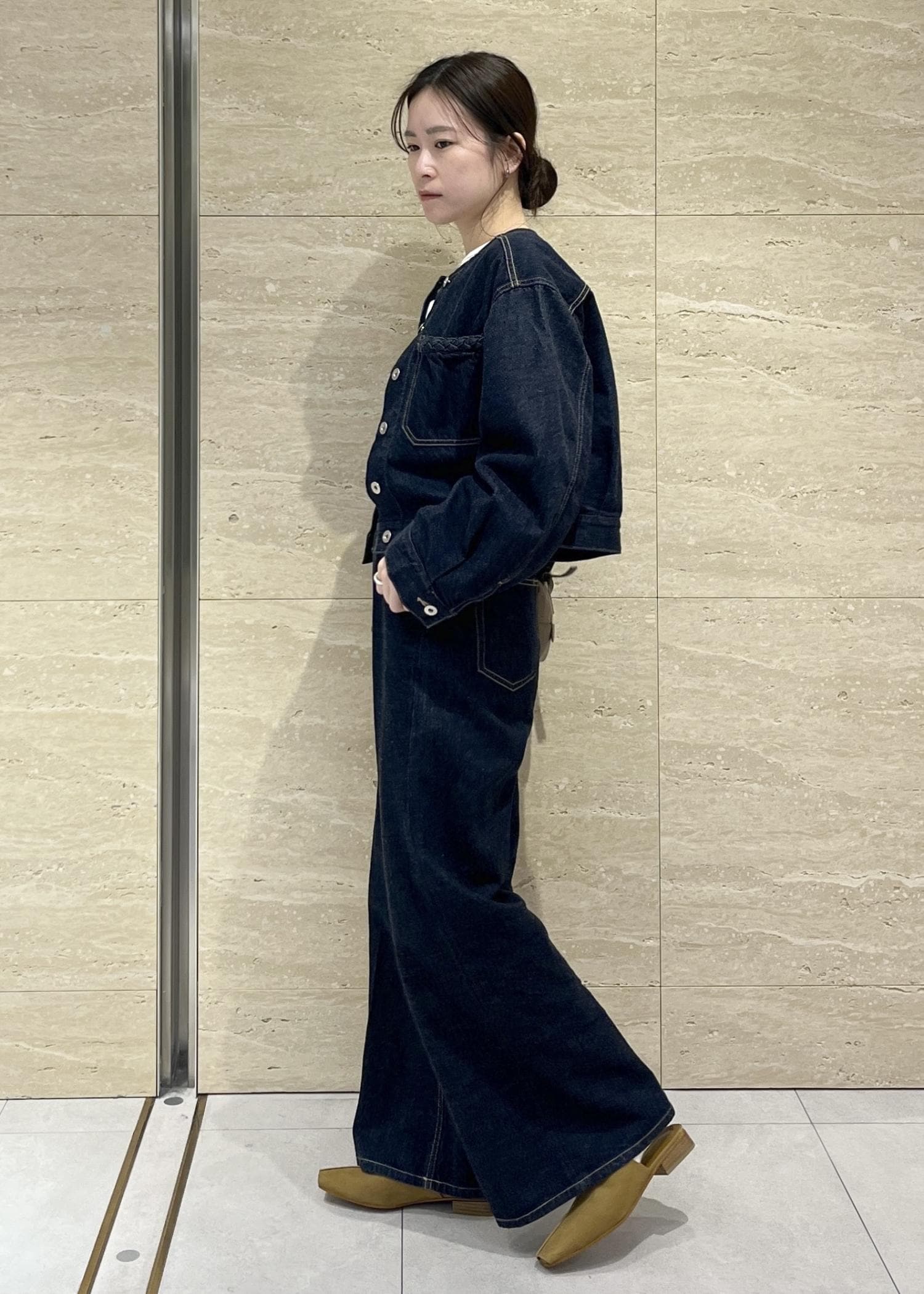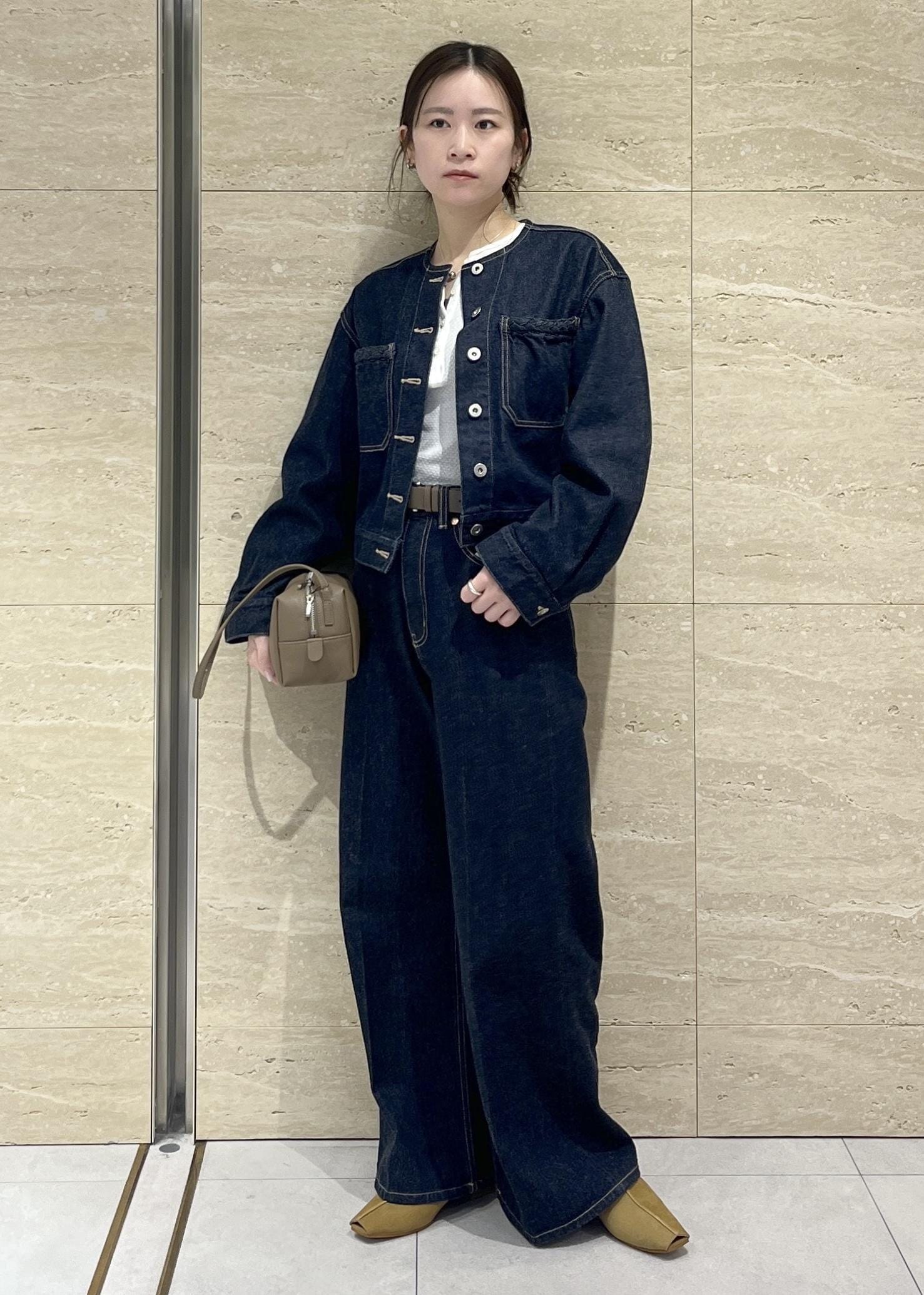 ROPÉイージーワイドデニムパンツ(岡山デニム)/セットアップ対応・イージーケアネイビー / 36¥30,800レビュー155㎝36サイズだと、ヒールなしでも着用できる着丈でした。