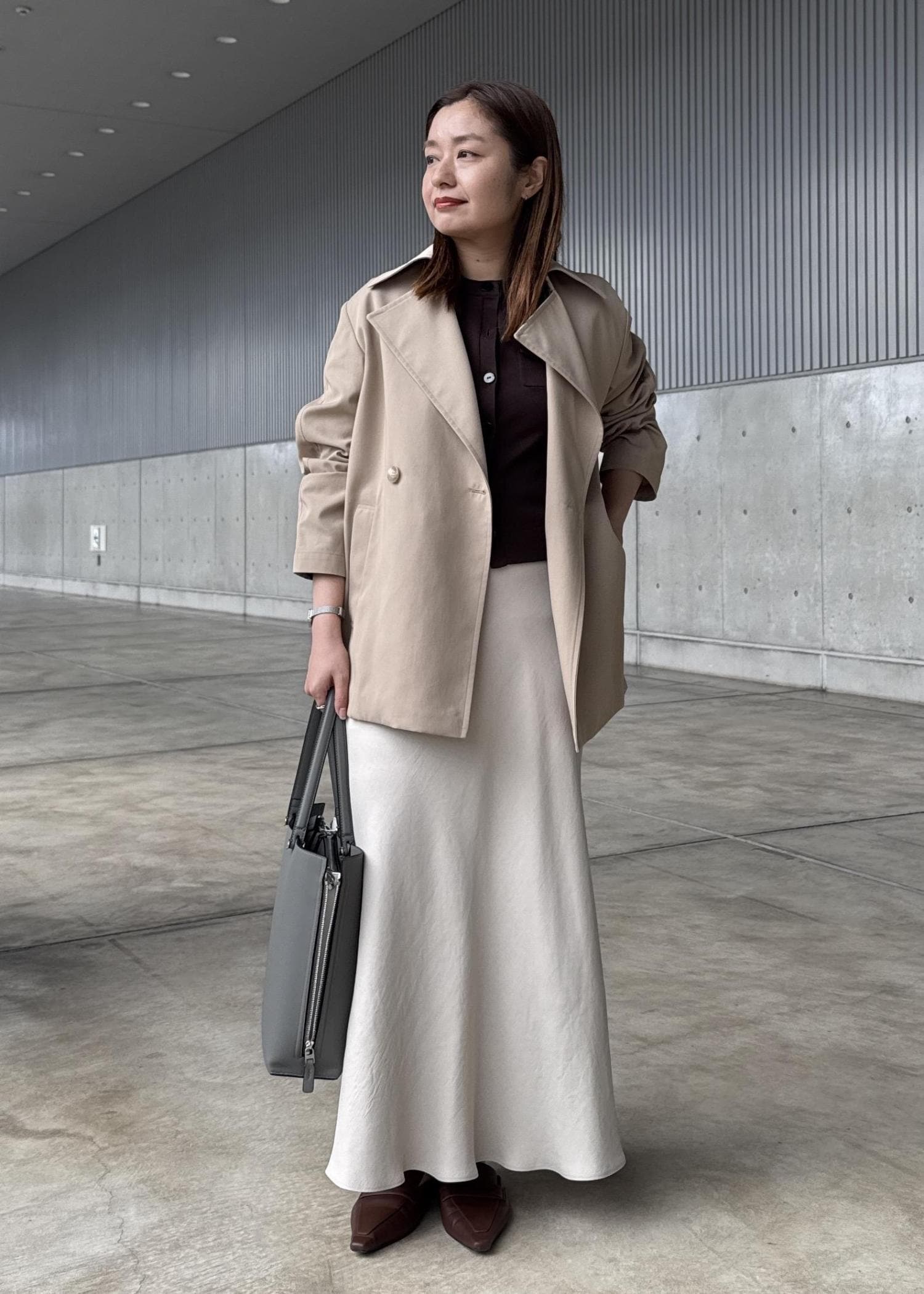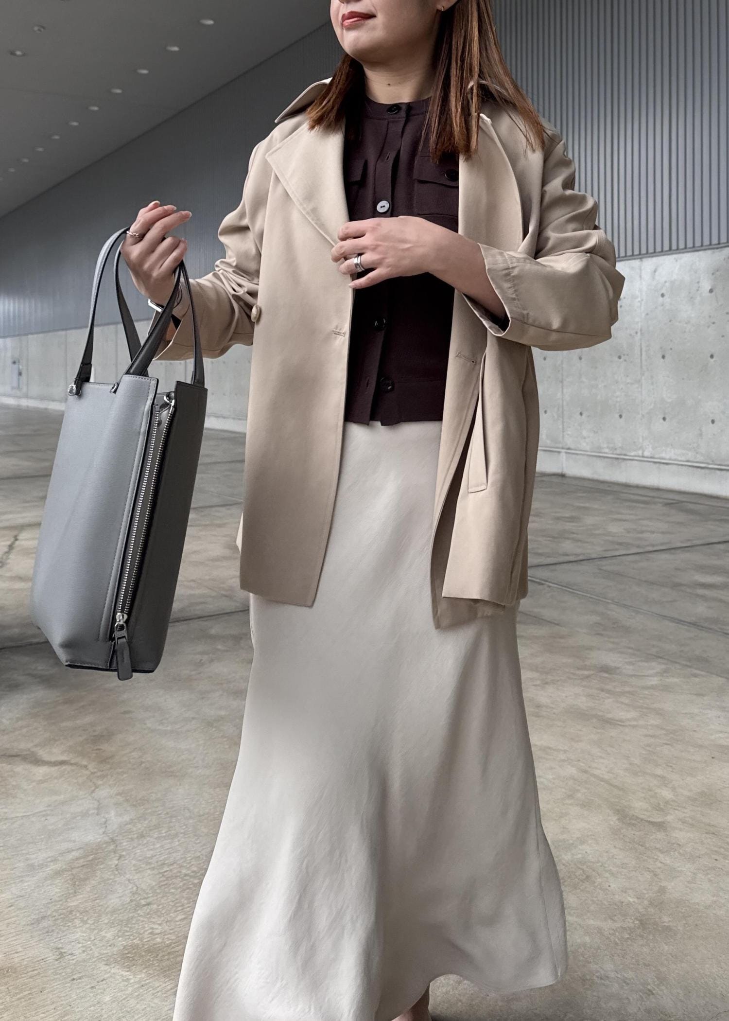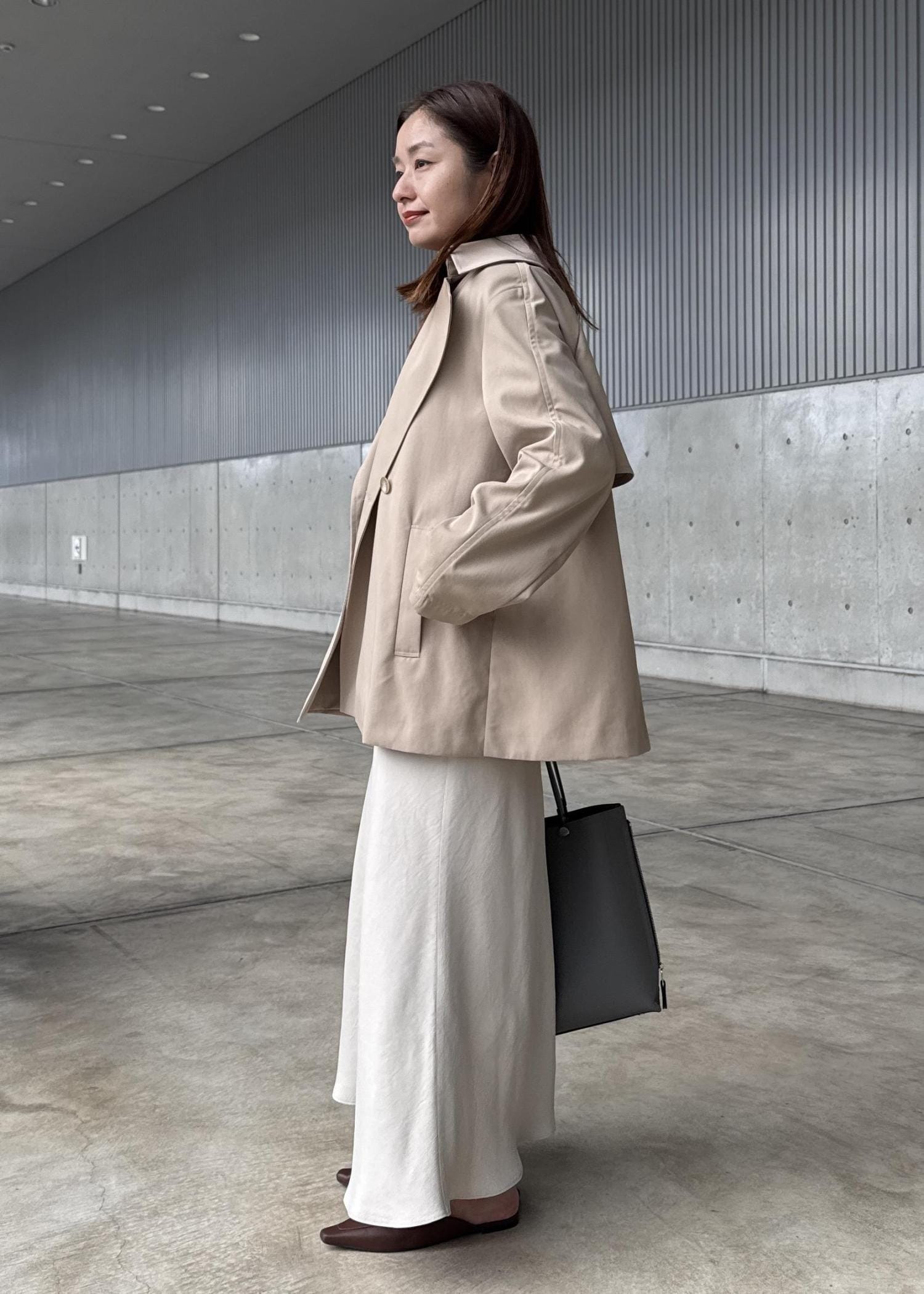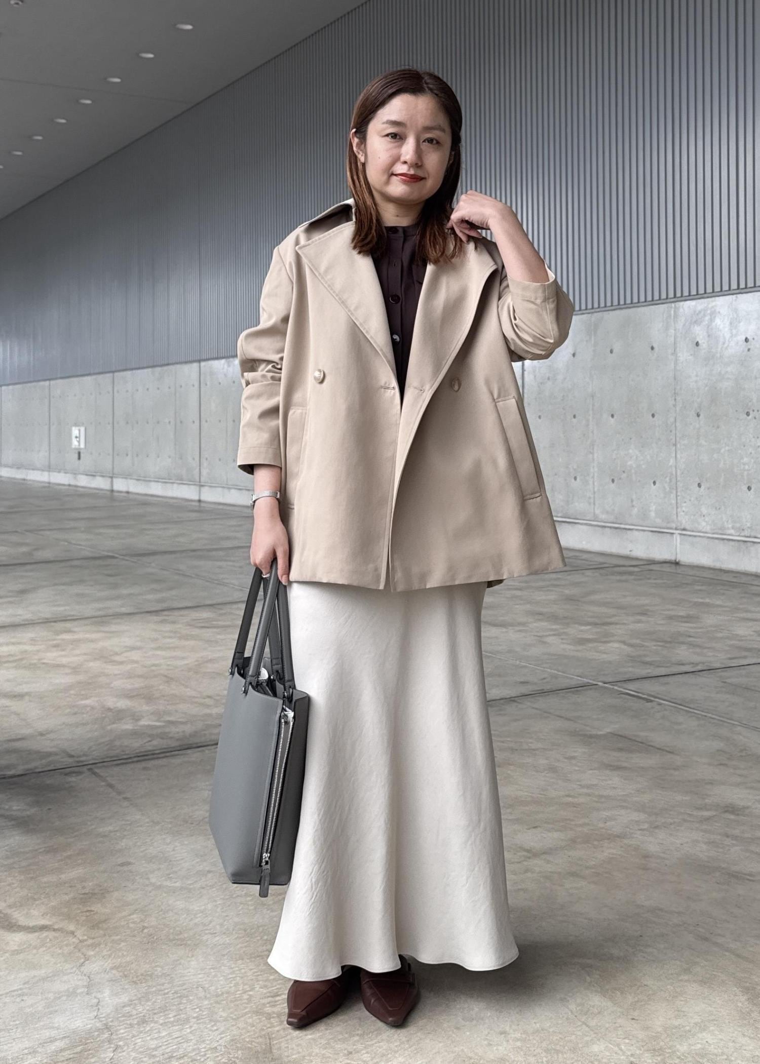 スカートスタイルにもパンツスタイルにも合わせやすい着丈です。シワになること無く、軽くて万能アイテムです。