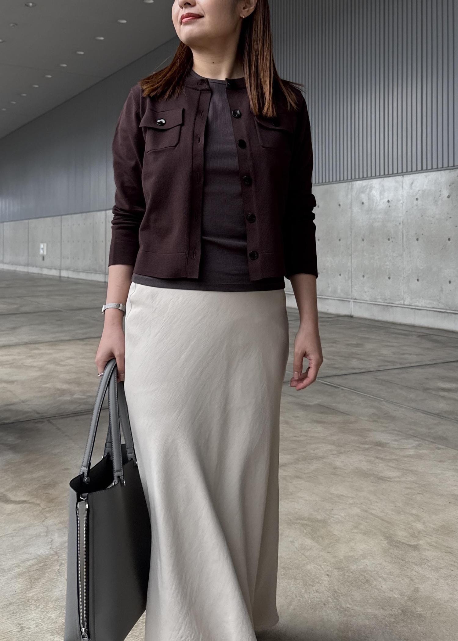 ROPÉポケットディテールコンパクトカーディガン/イージーケアブラウン / F¥19,800レビューコンパクトなサイズですが、柔らかな布地なので5分袖のカットソーの上からでも窮屈感なく着れました〇