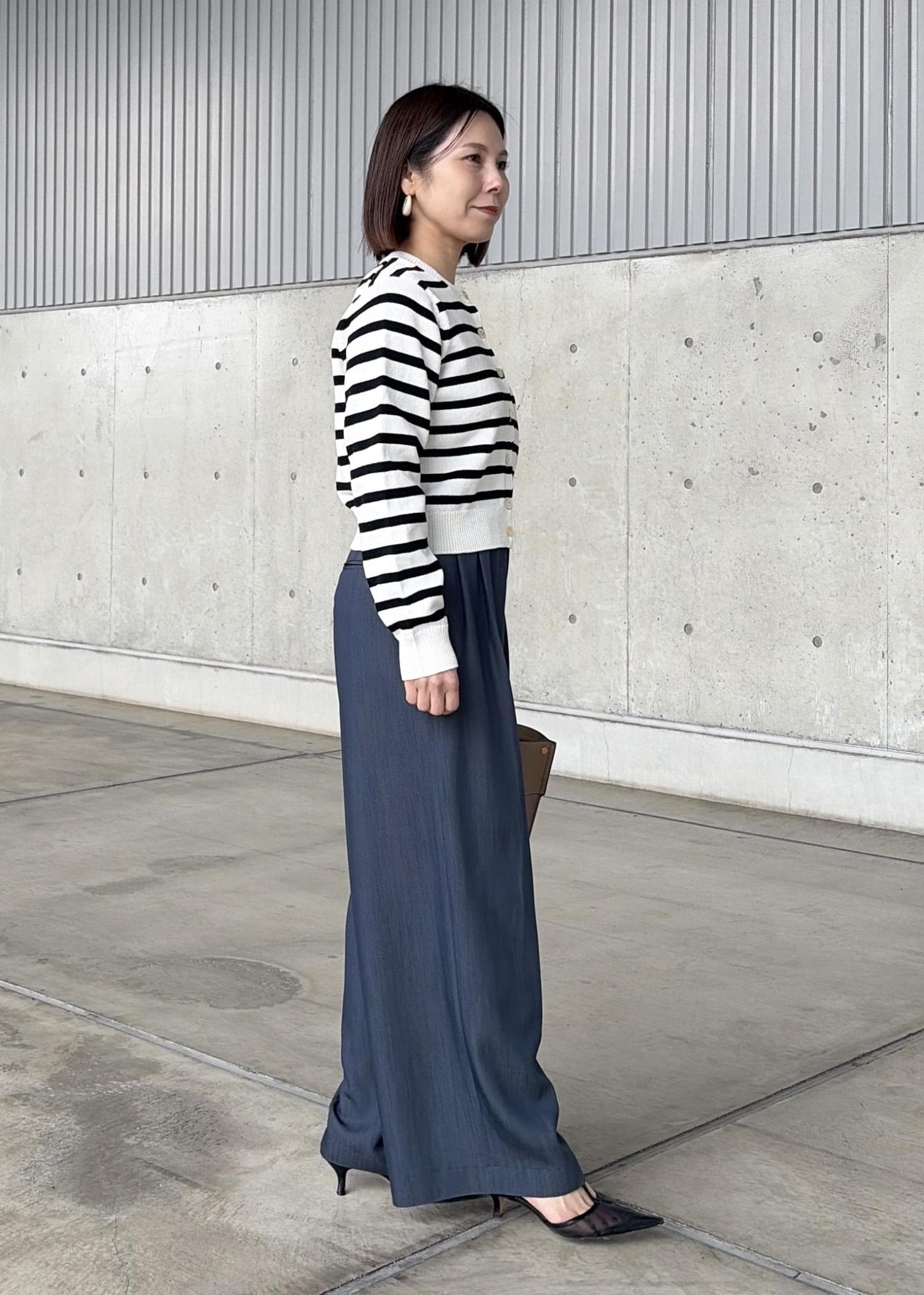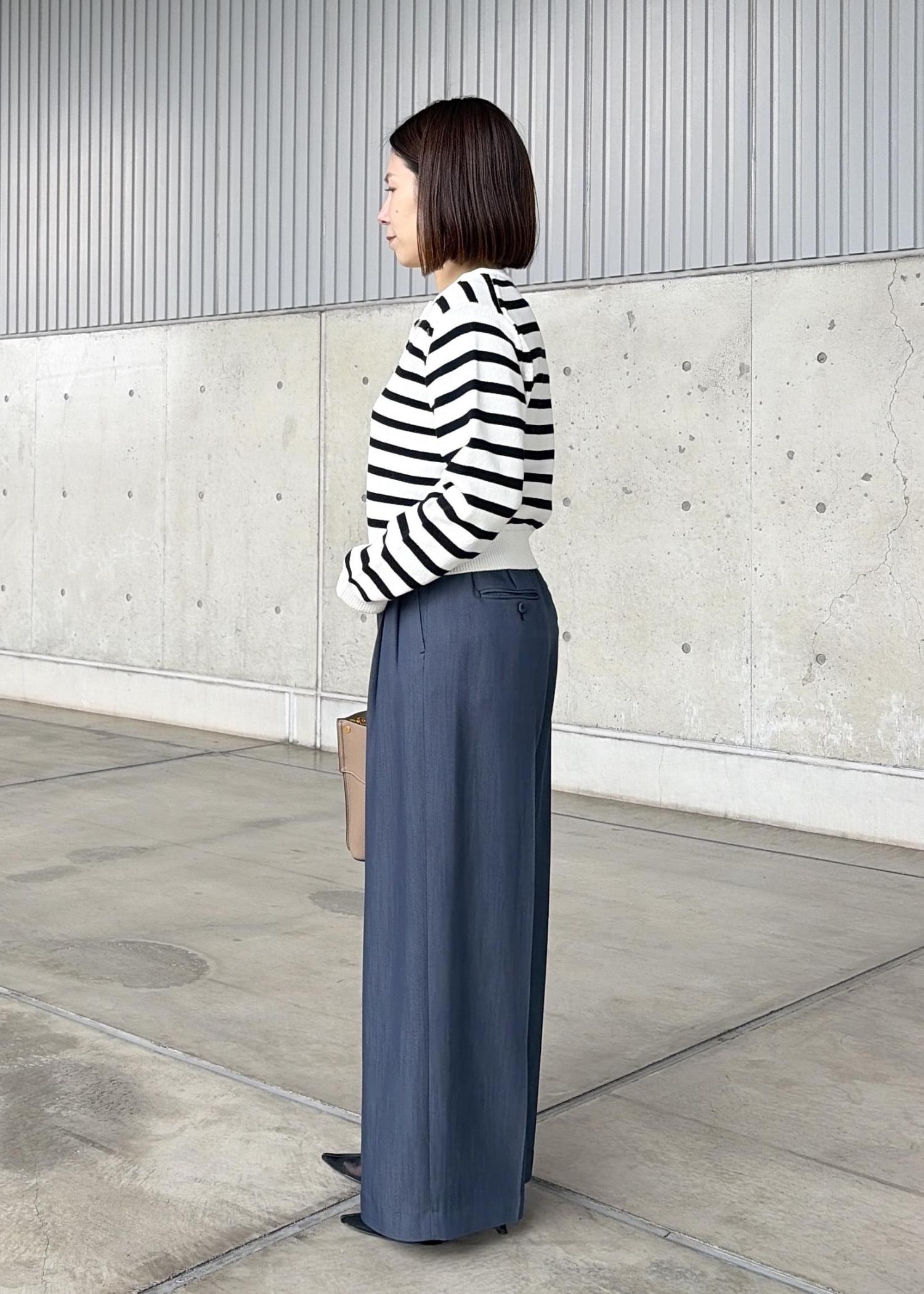 しわになりにくく、とろみのある落ち感が綺麗なパンツです。