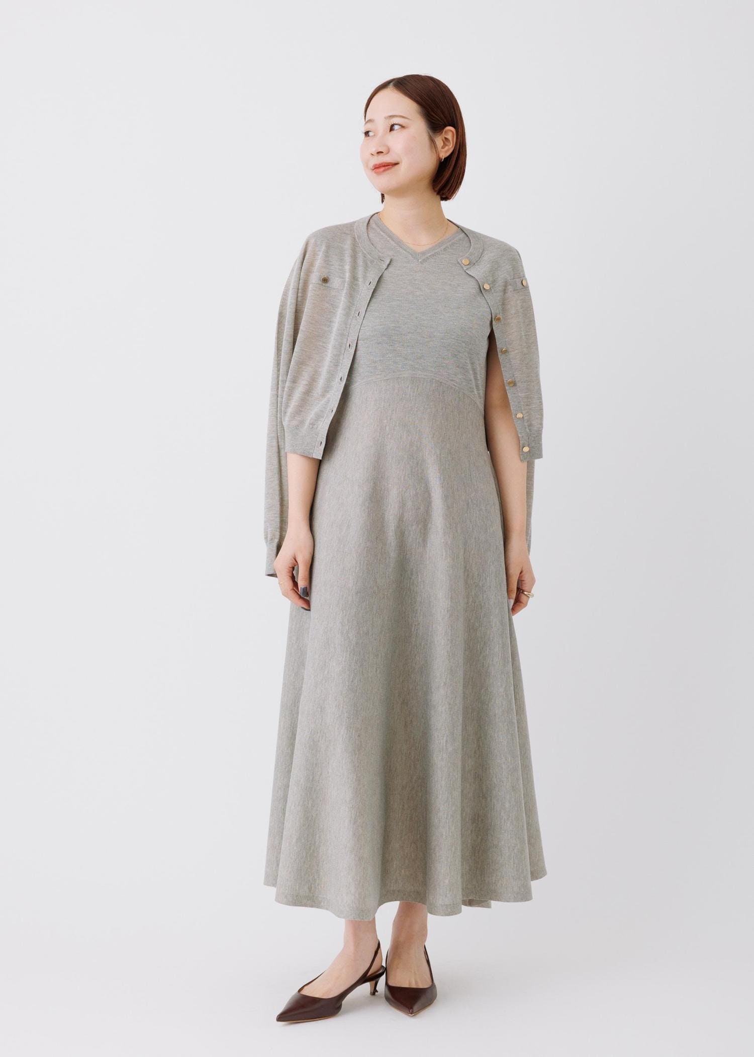 予約ROPÉLEVITA ニットワンピース/接触冷感・イージーケアベージュ / F¥27,500レビュー161cmフリーサイズ着用で足首が見えるほどの丈感。