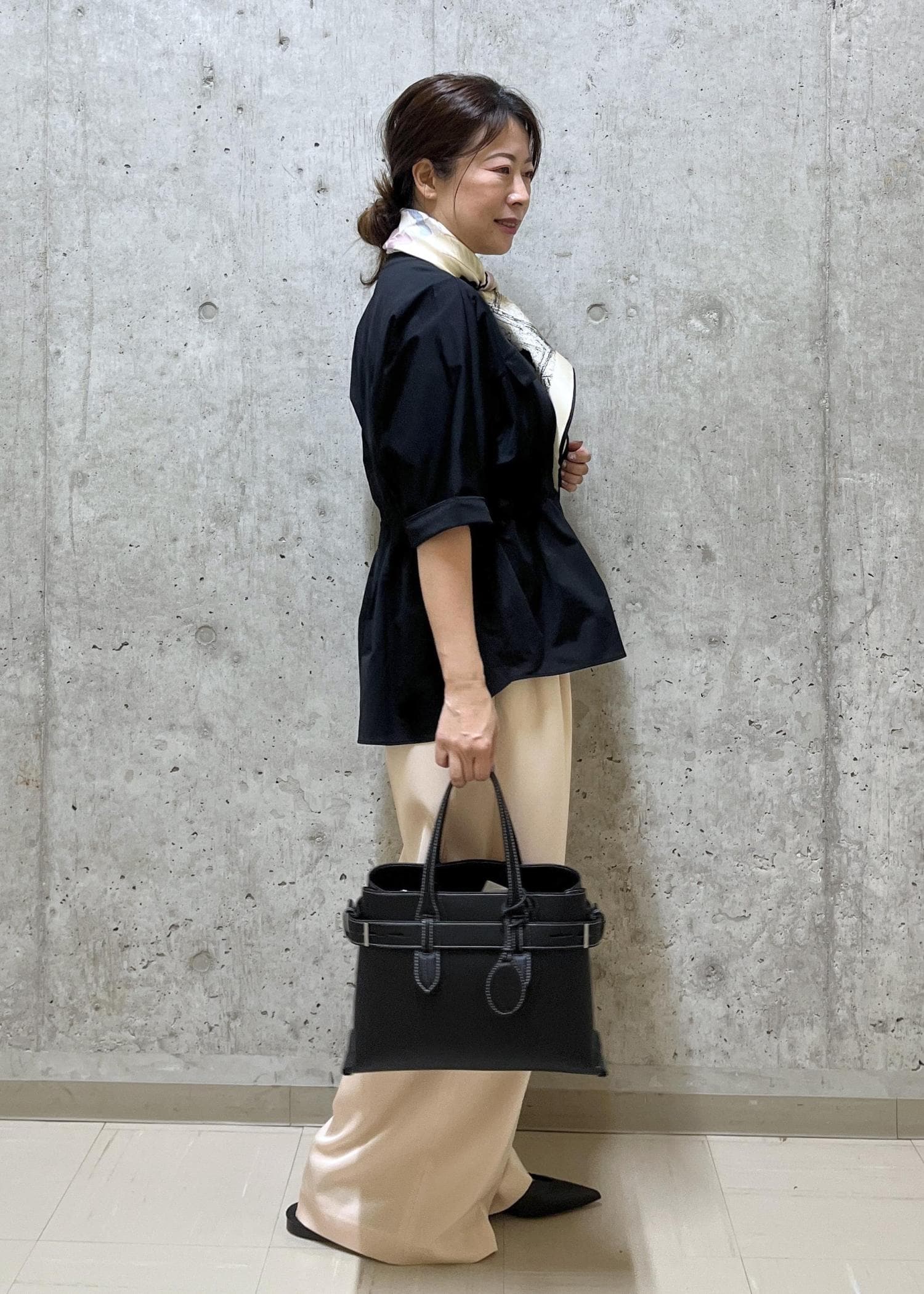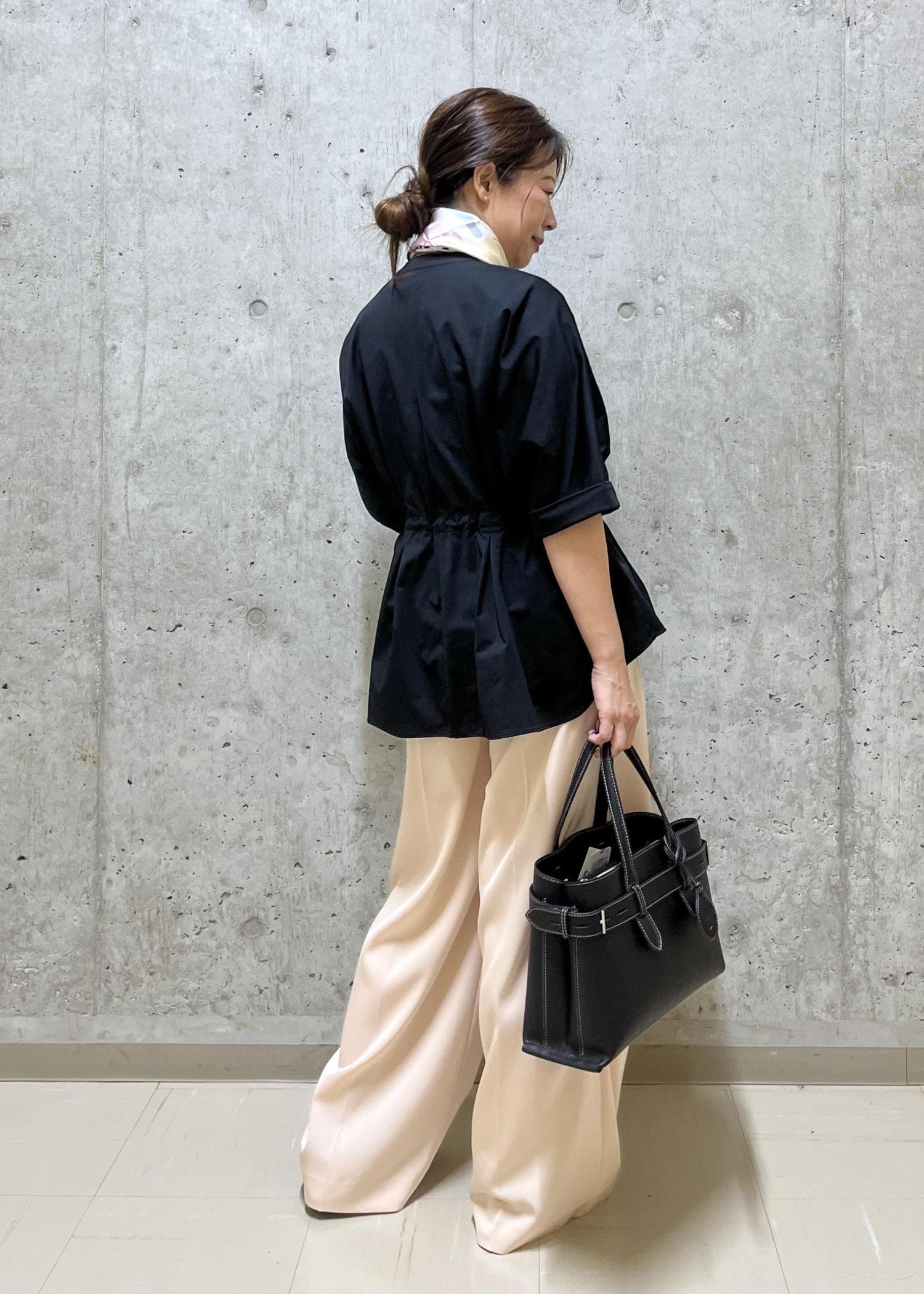 ペプラムシルエットのトップスでワイドパンツもメリハリのあるスタイルにしました。