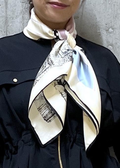 ROPÉロートレックシルクスカーフ/Lサイズキナリ / F¥19,800レビュー88×88の大きめのサイズ感で、腰に巻いたり、肩掛けもできてアレンジしやすいサイズ感です。