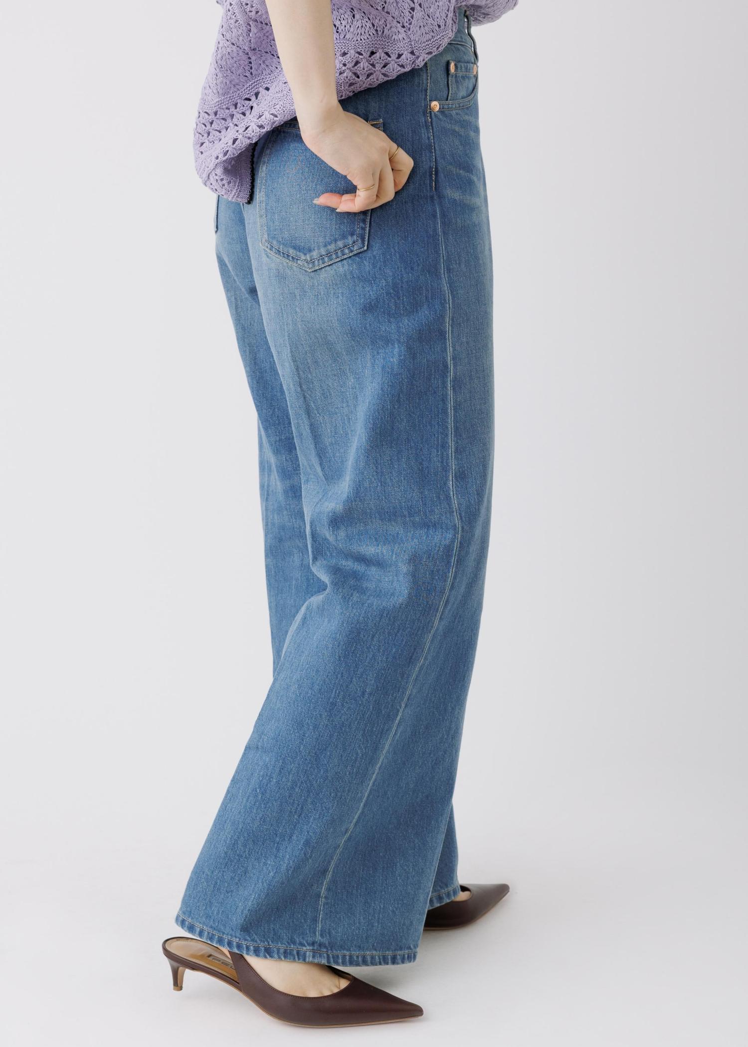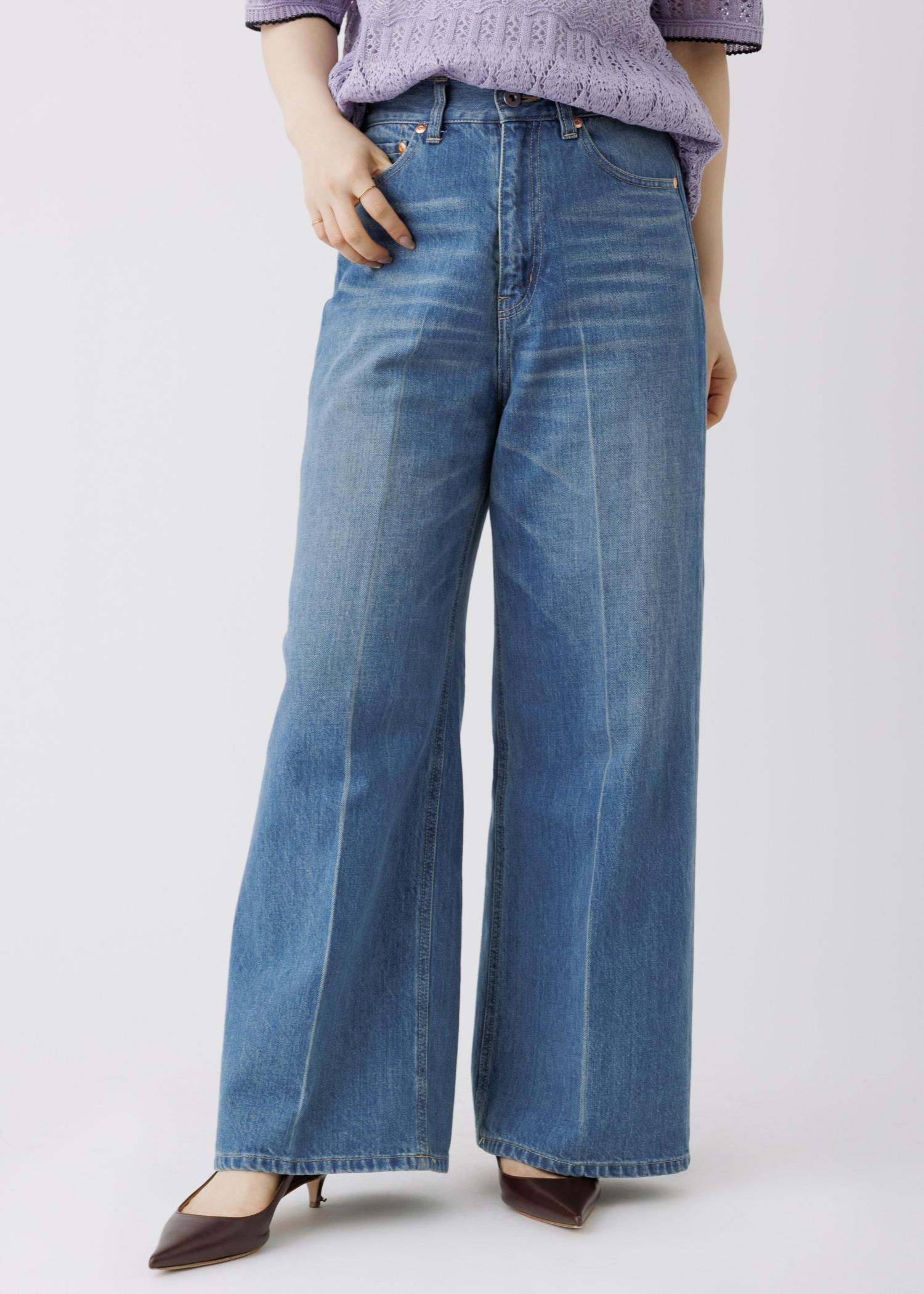太めのワイドシルエットですが、腰回りがすっきりしておりセンタープレスも効いているので、綺麗めにも履けるデニムパンツです◎